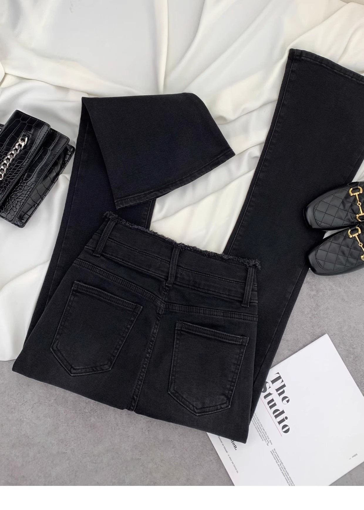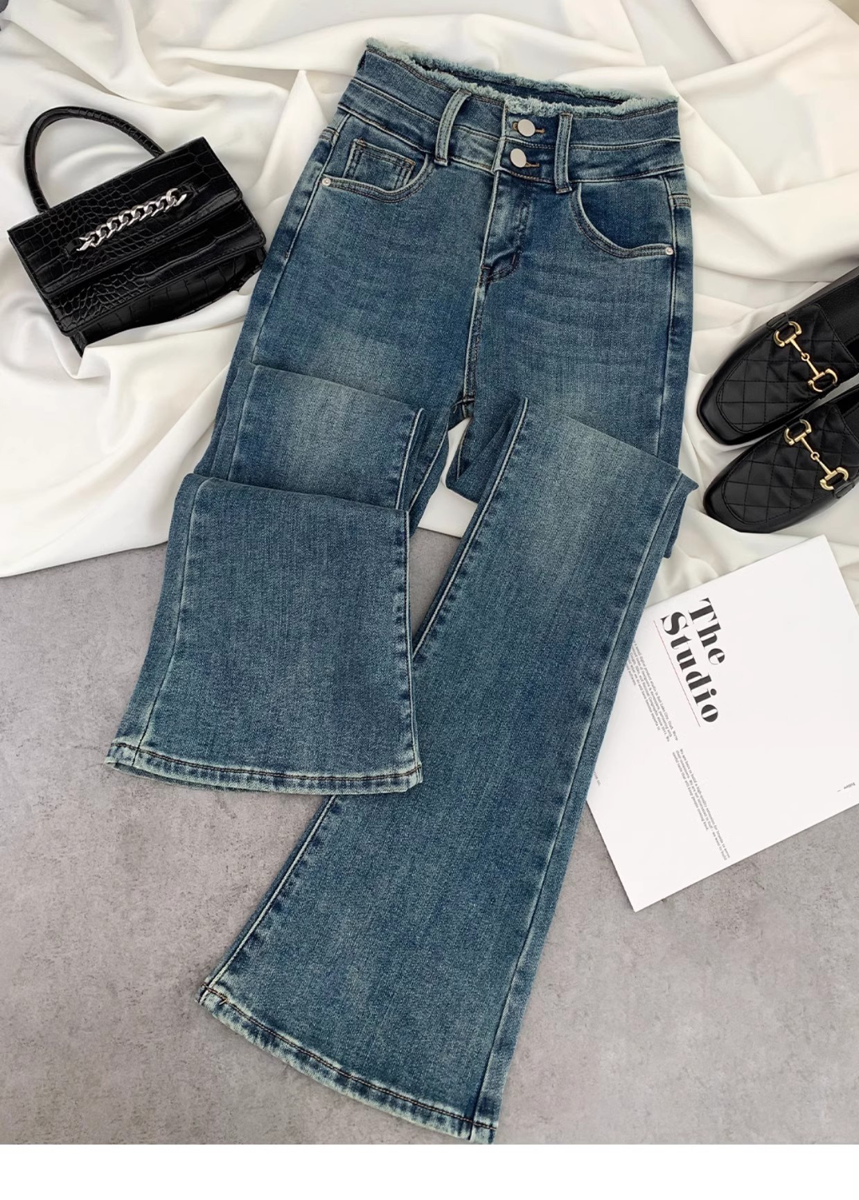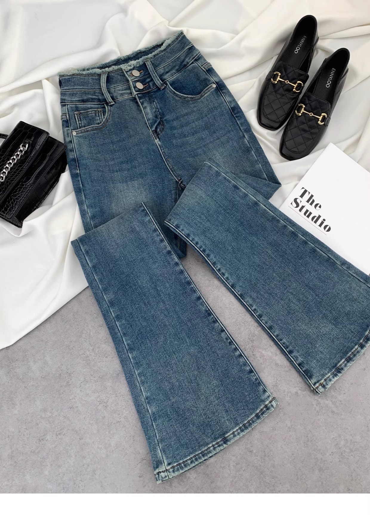 PF1574#复古牛仔裤显瘦微喇裤高腰毛边拖地长裤