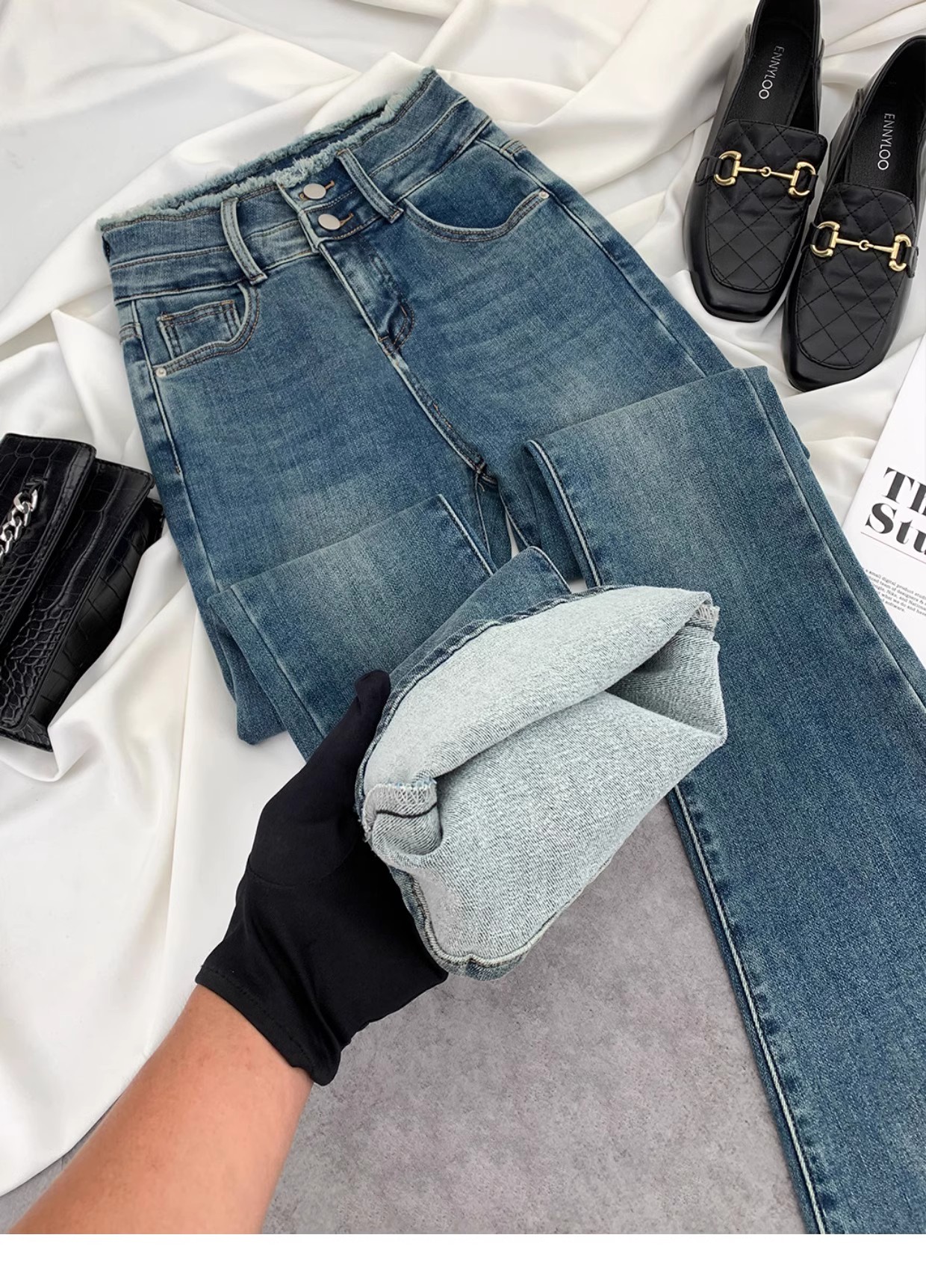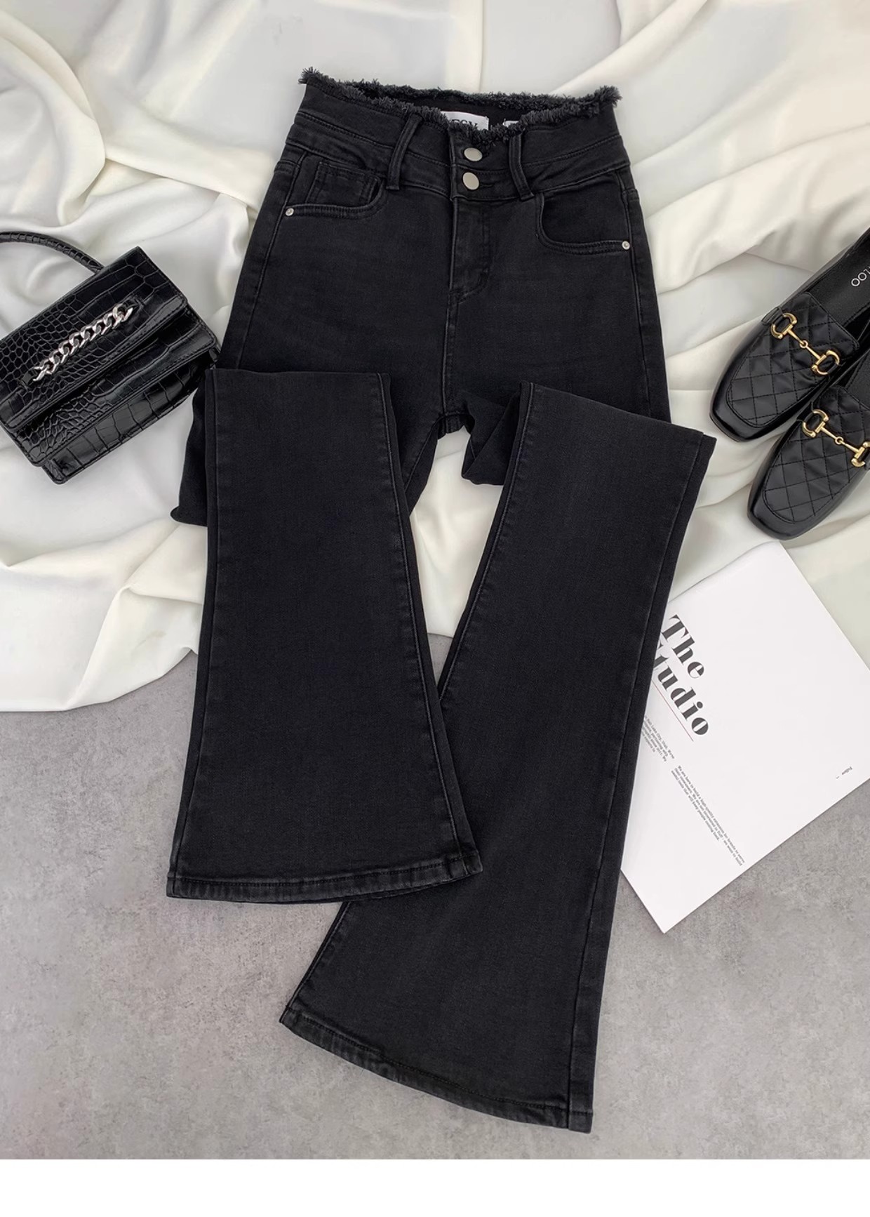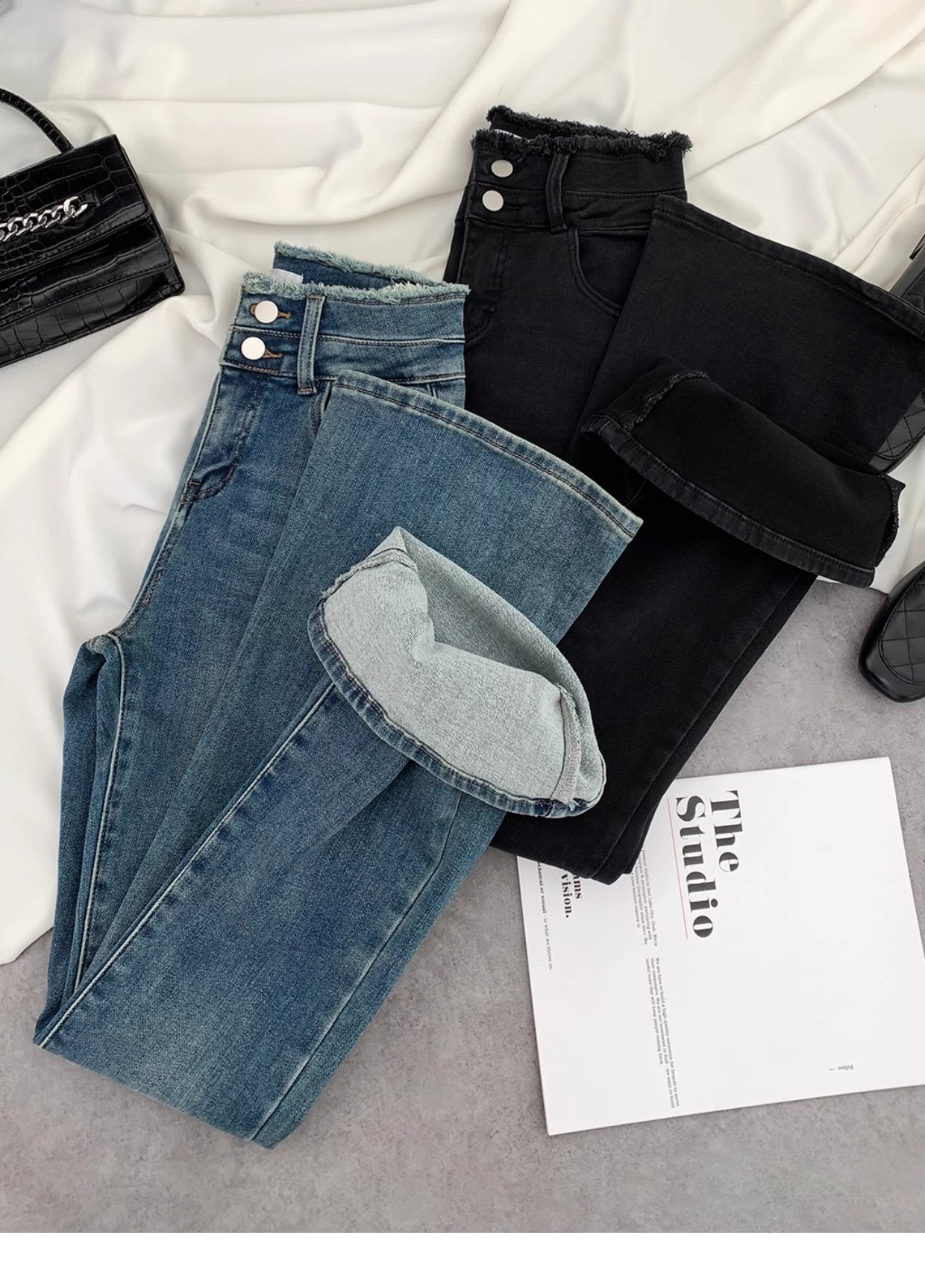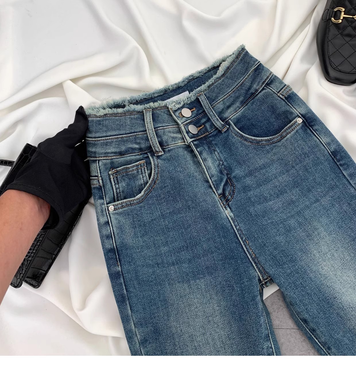 PF1574#复古牛仔裤显瘦微喇裤高腰毛边拖地长裤