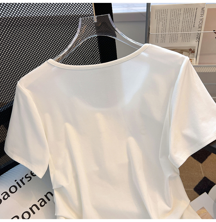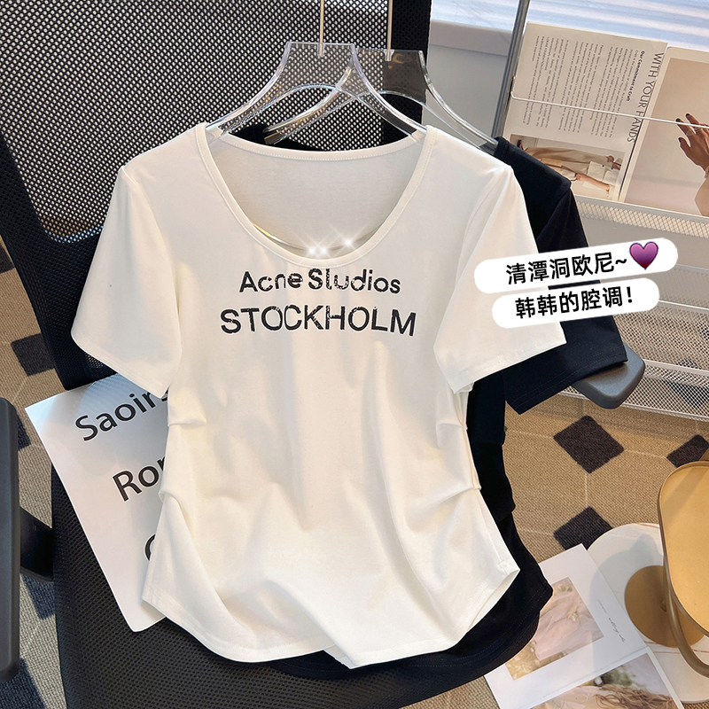 PF1800#ins韩版印花带链条U领短袖T恤 夏季时尚洋气休闲褶皱体恤潮