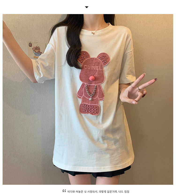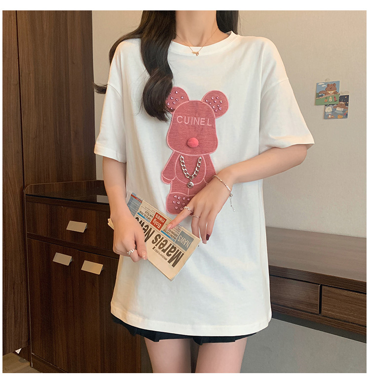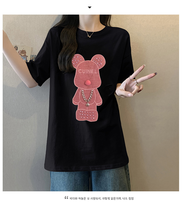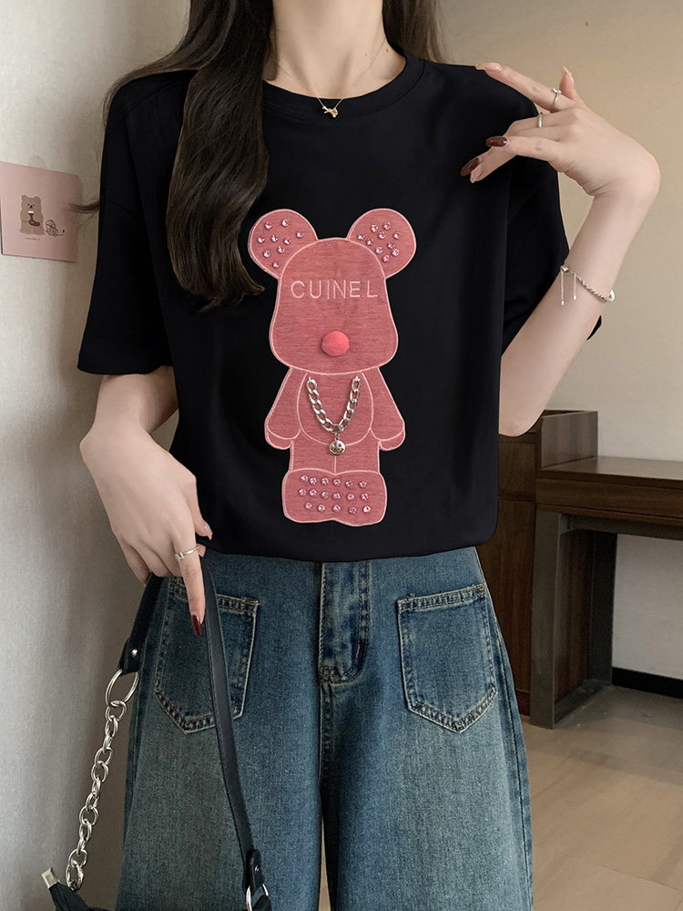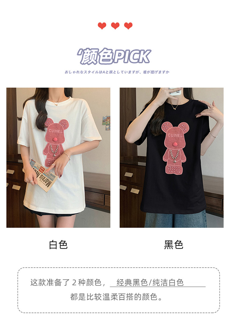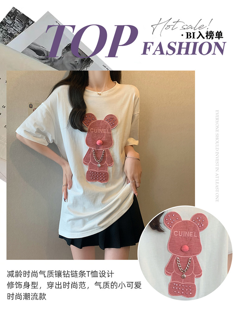 PF1807#大码胖mm2024欧洲站时尚重工钉珠暴力熊T恤女新款加厚显瘦上衣潮