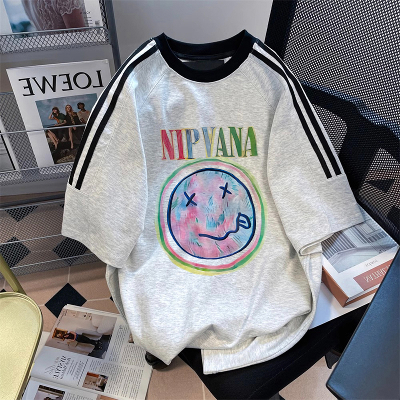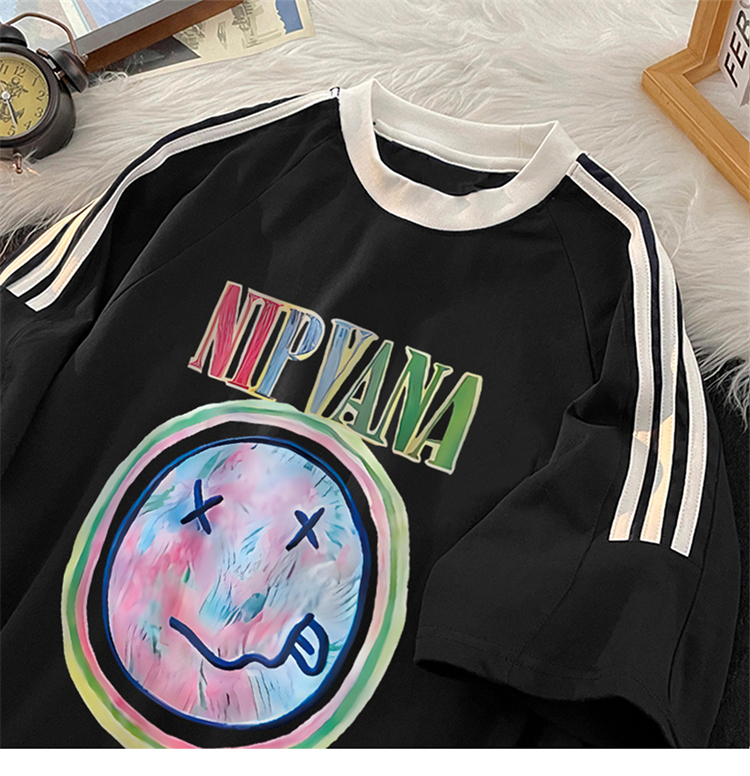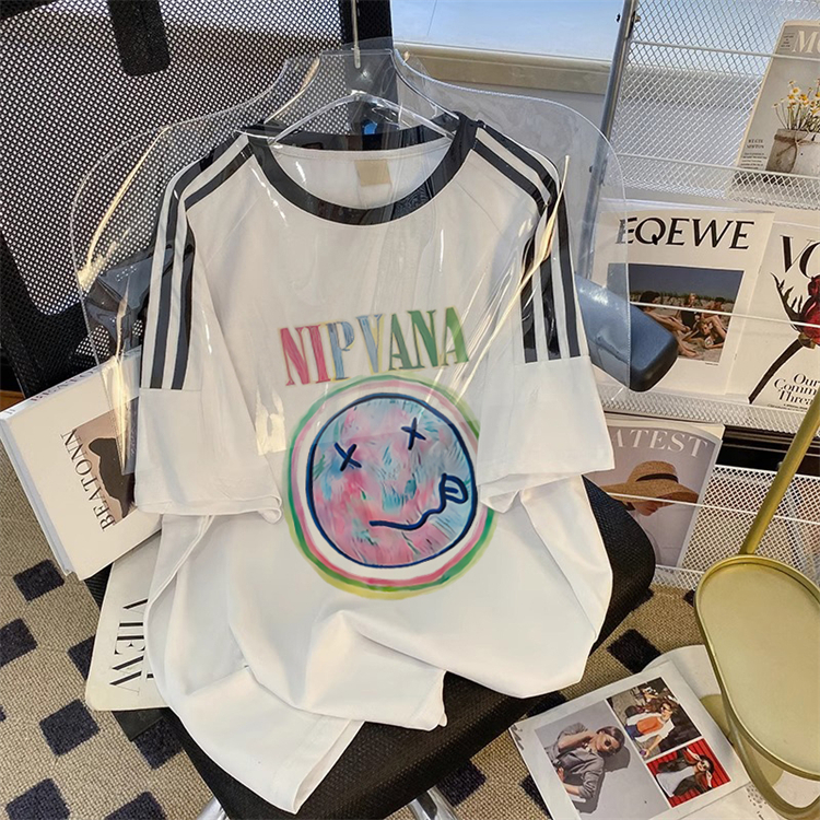 PF1832#纯棉插肩款宽松印花三条杠条纹短袖t恤女