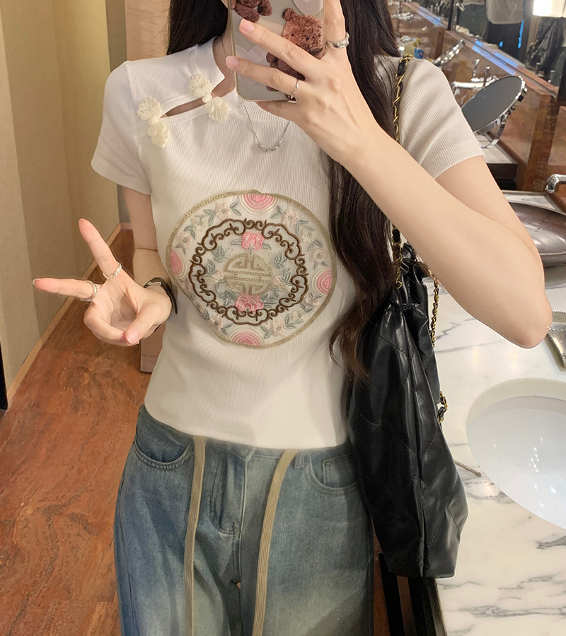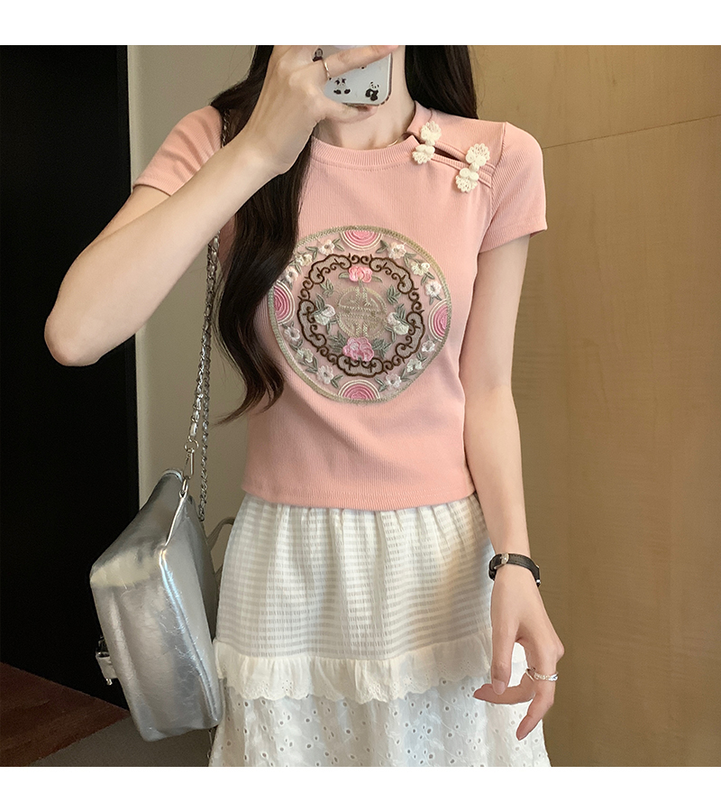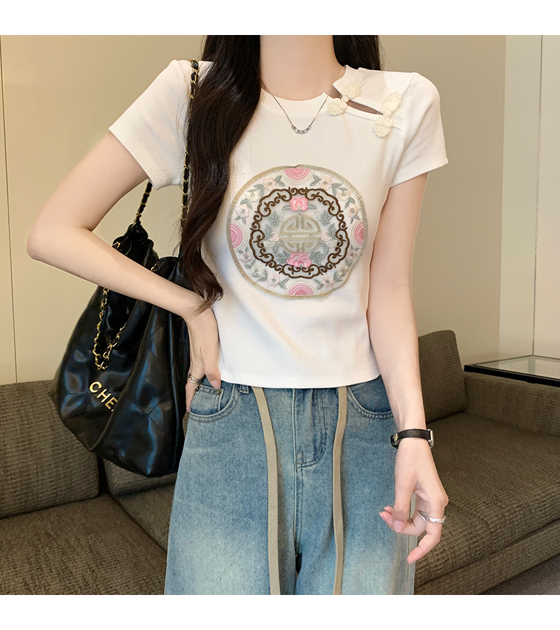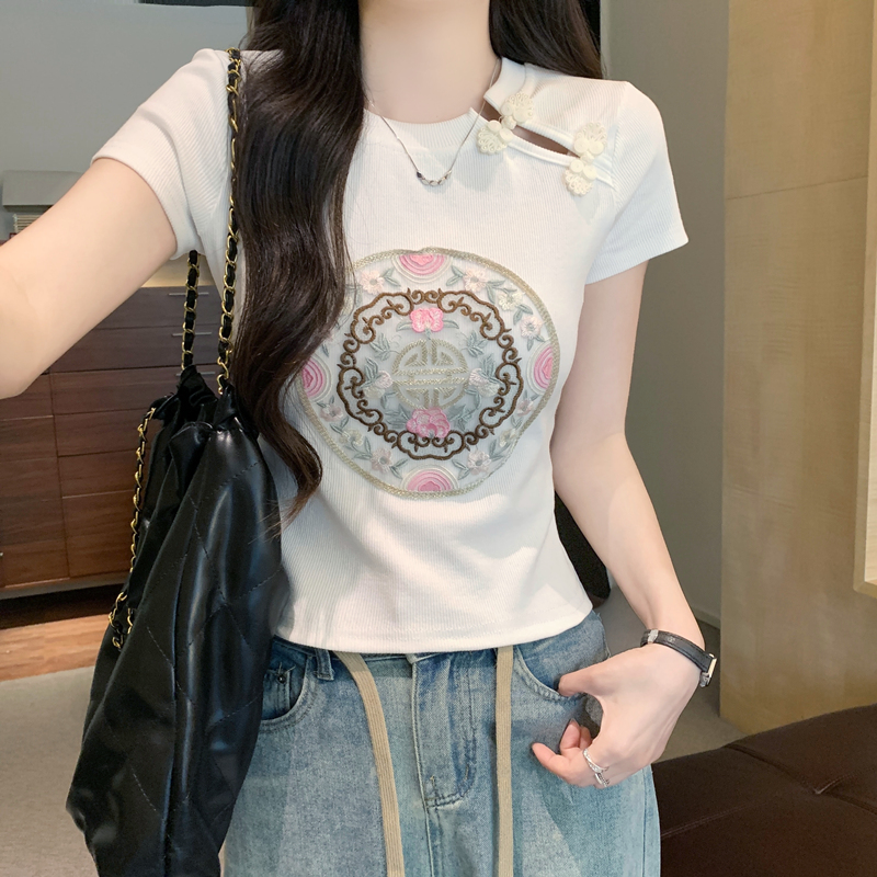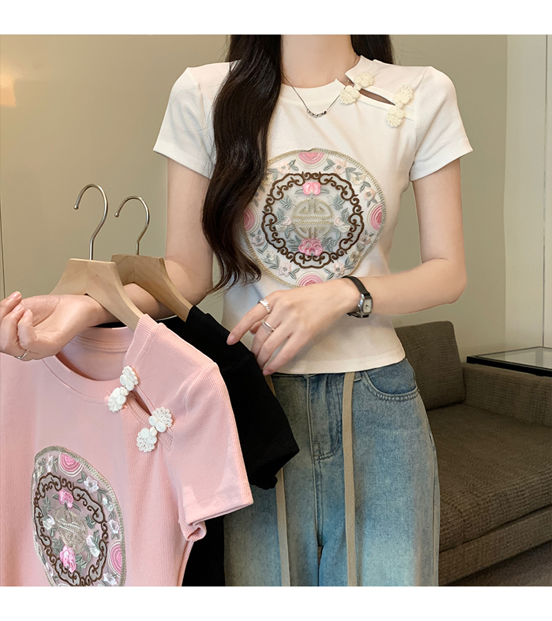 PF1884#新中式国风盘扣重工刺绣短袖T恤女 新款修身显瘦短款上衣