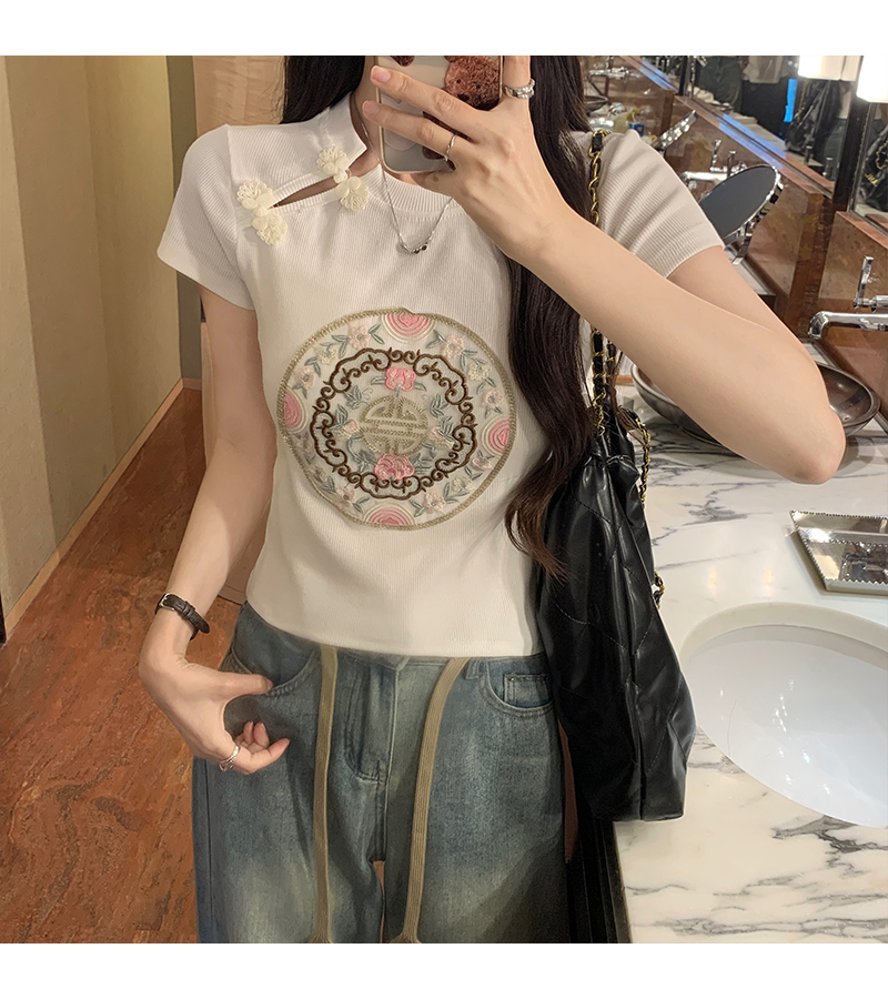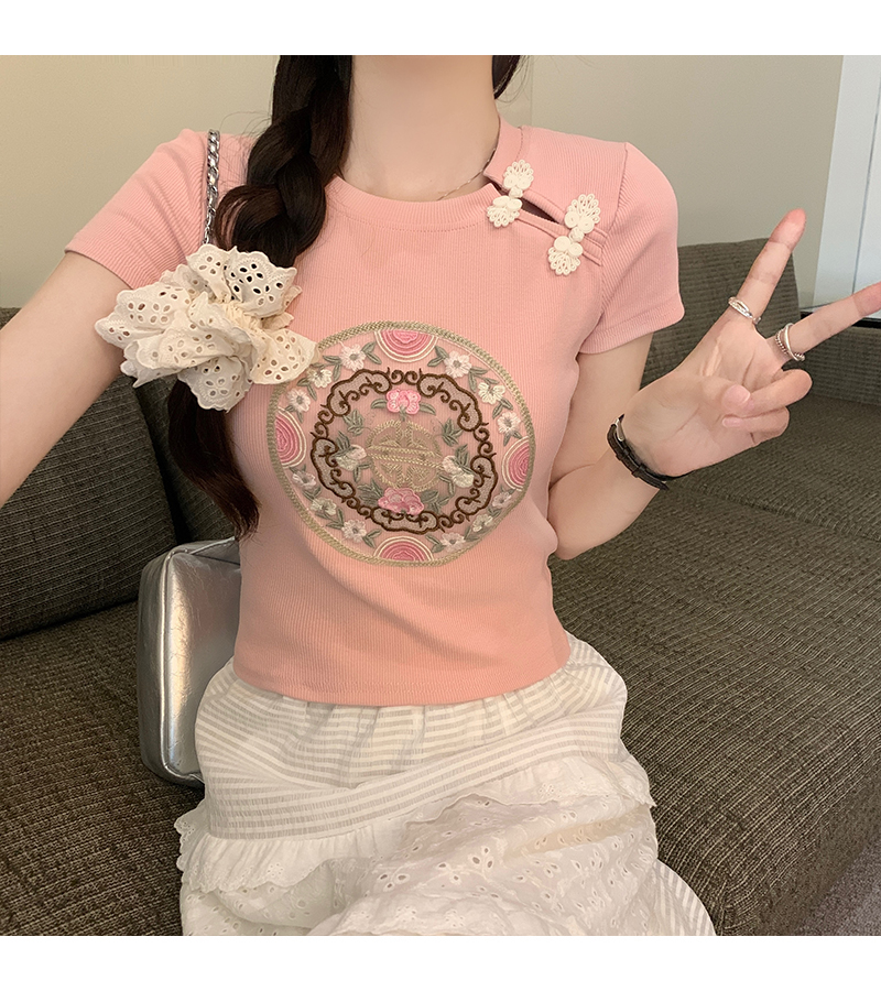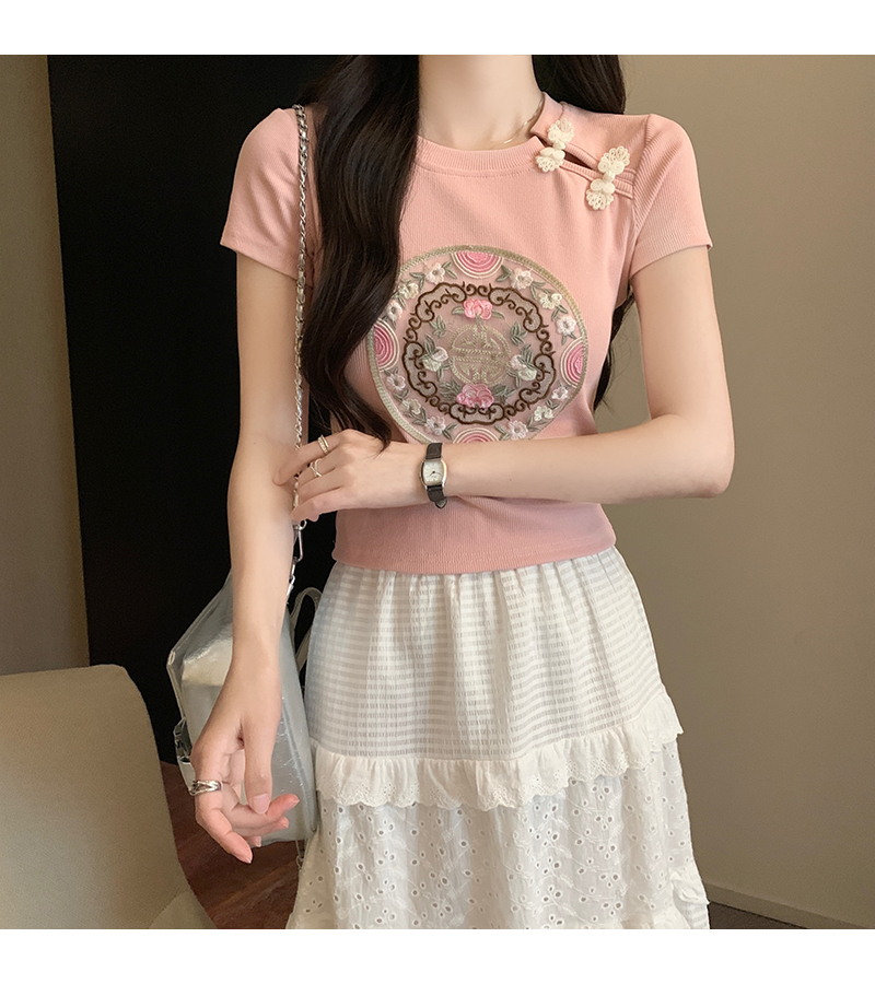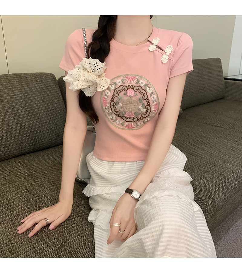 PF1884#新中式国风盘扣重工刺绣短袖T恤女 新款修身显瘦短款上衣