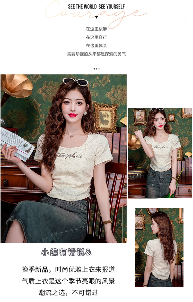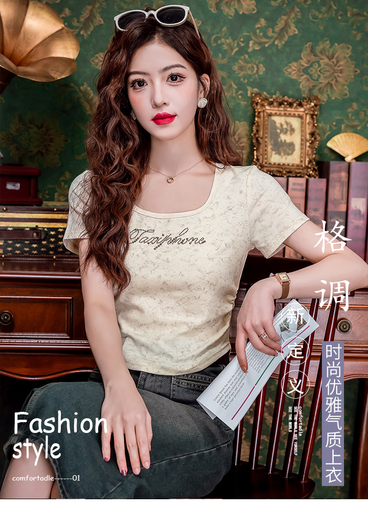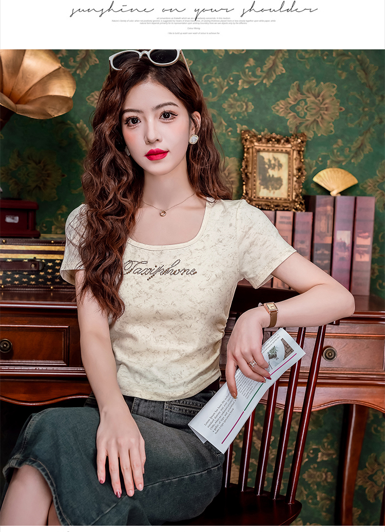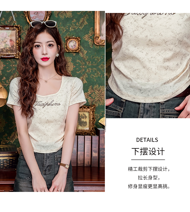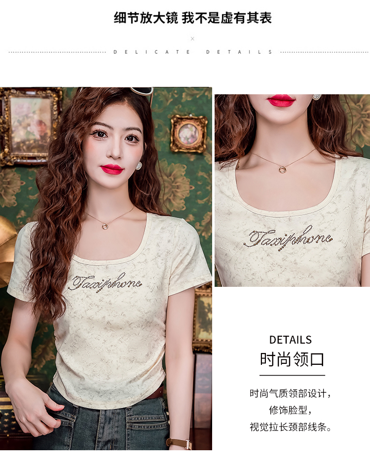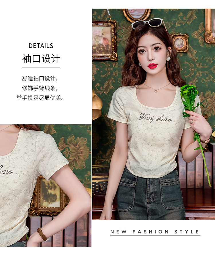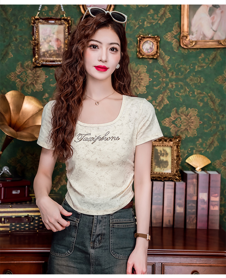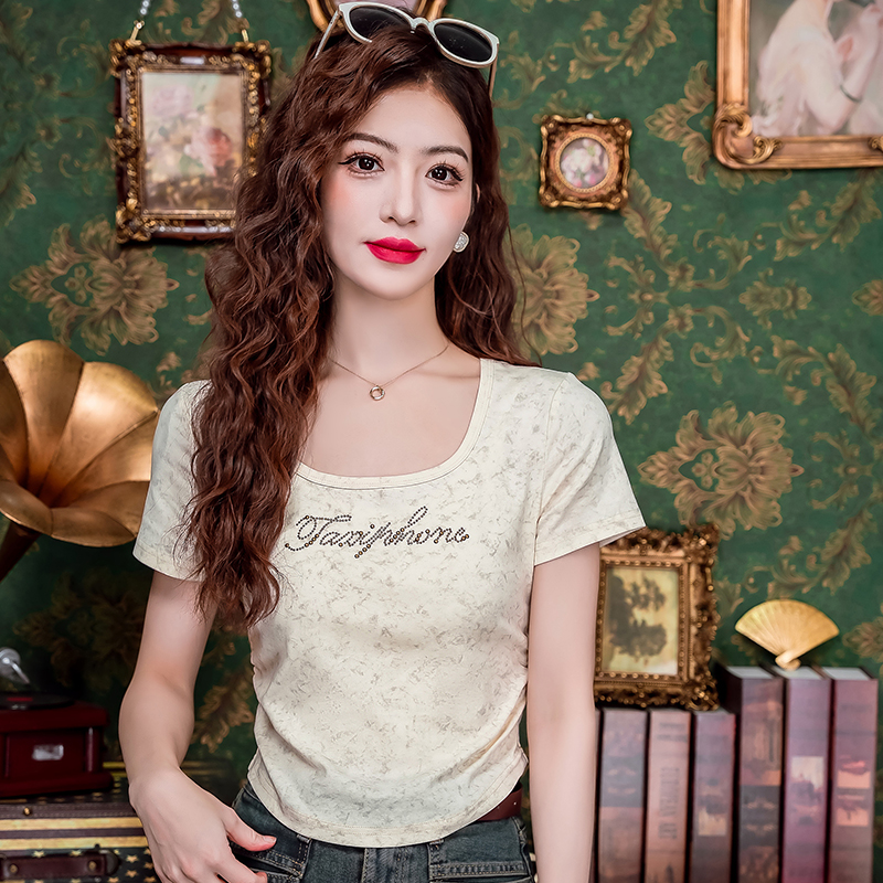 PF2024#新款圆领短袖T恤女钉珠字母复古扎染修身短款抽褶上衣潮