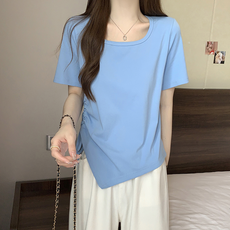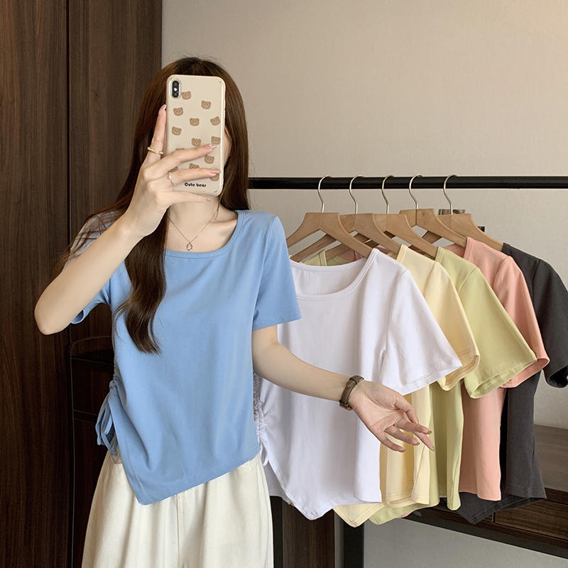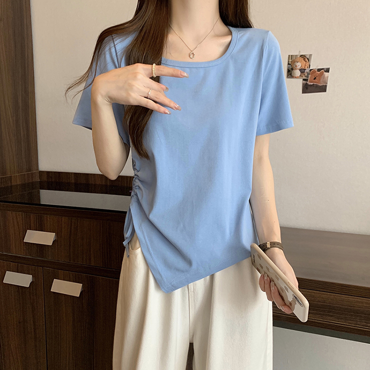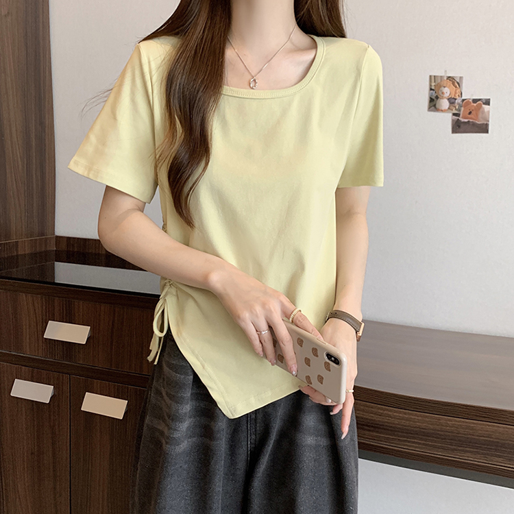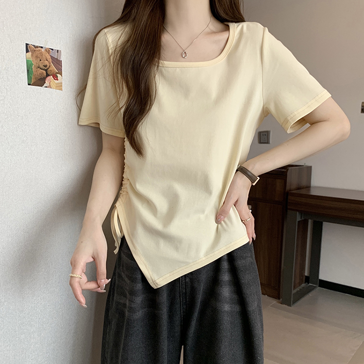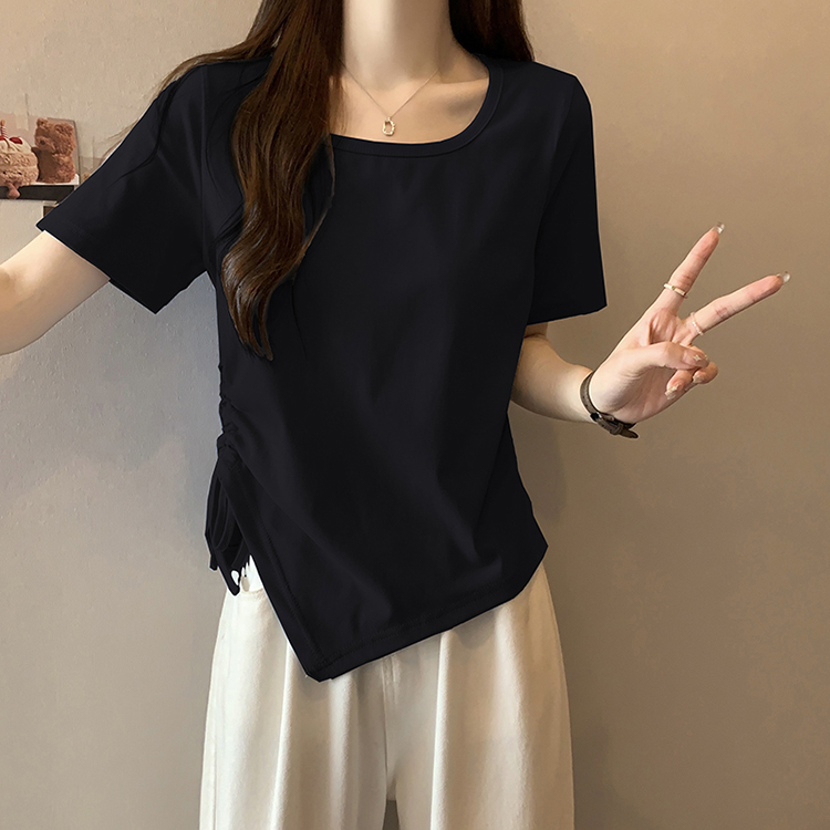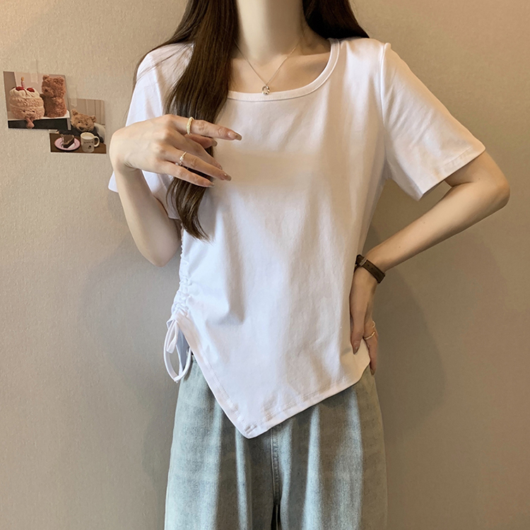 PF2210#夏装新款胖mm时尚百搭显瘦不对称下摆侧抽绳短袖T恤上衣