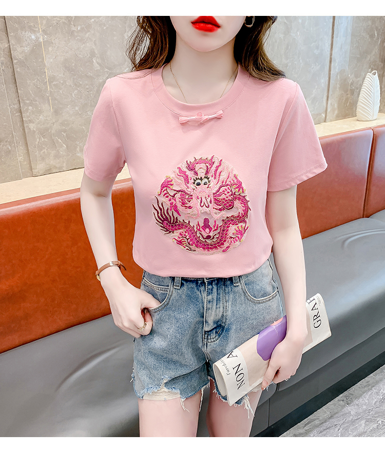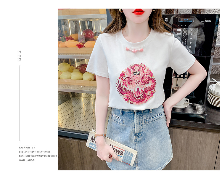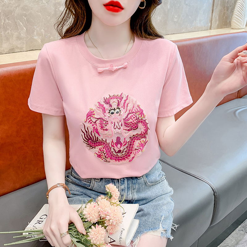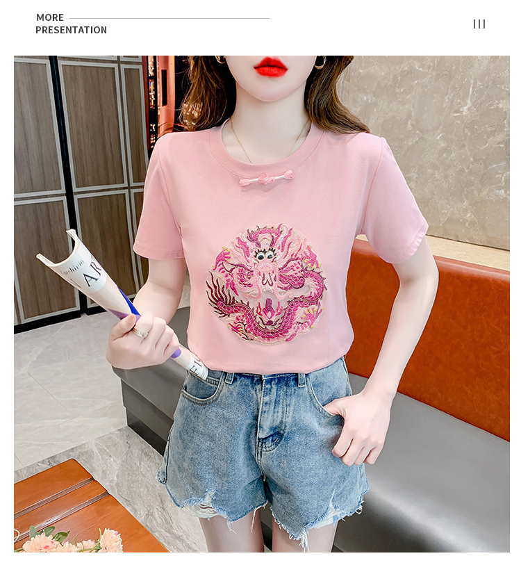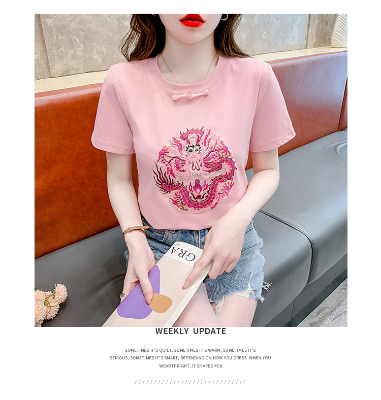 PF2438#拼色新中式国风短袖盘扣T恤休闲百搭圆领套头上衣高级感小众女