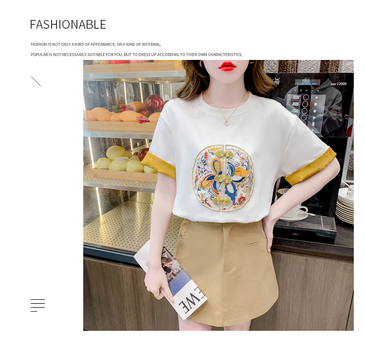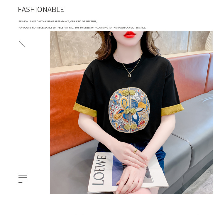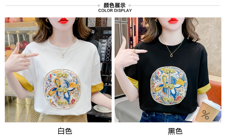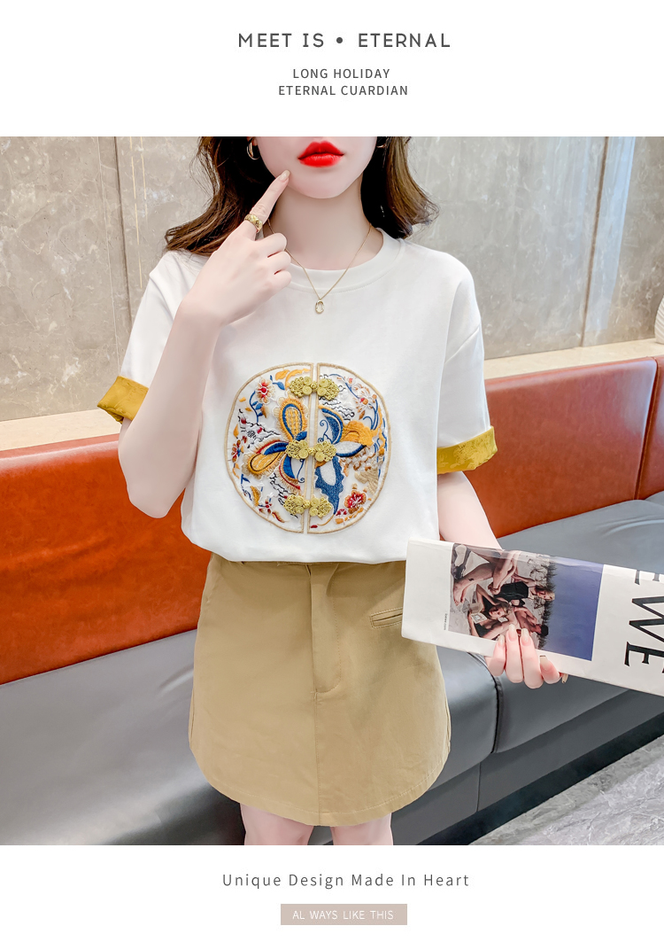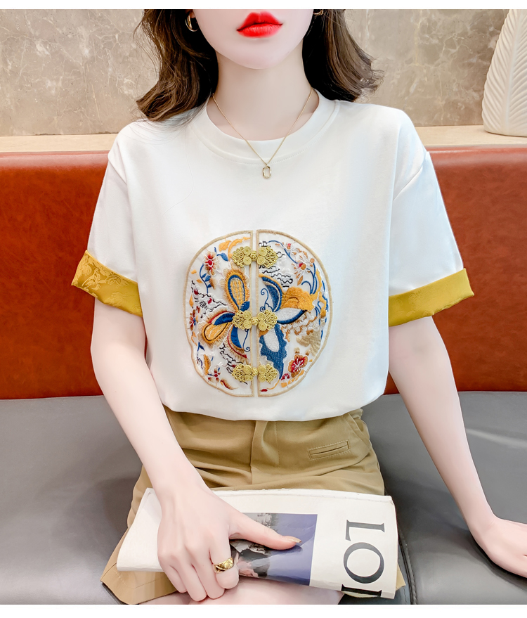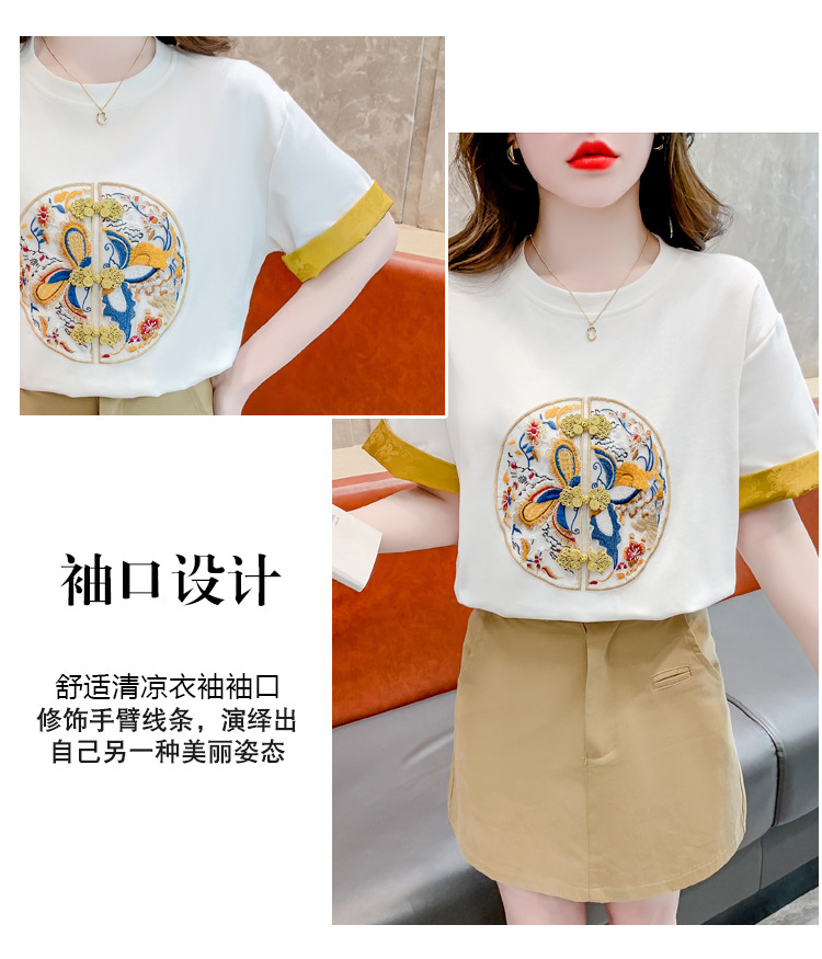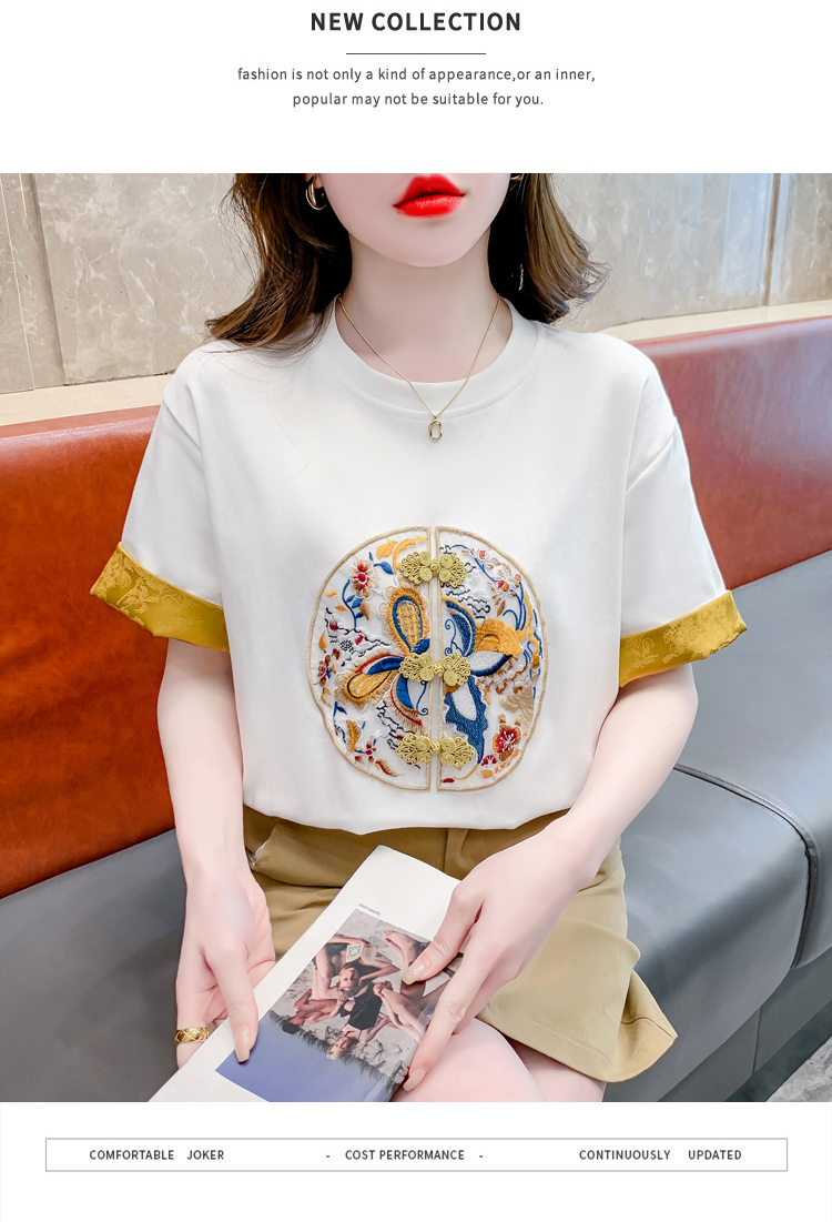 PF2439#新中式国风重工刺绣拼接短袖上衣百搭简约休闲圆领宽松上衣女
