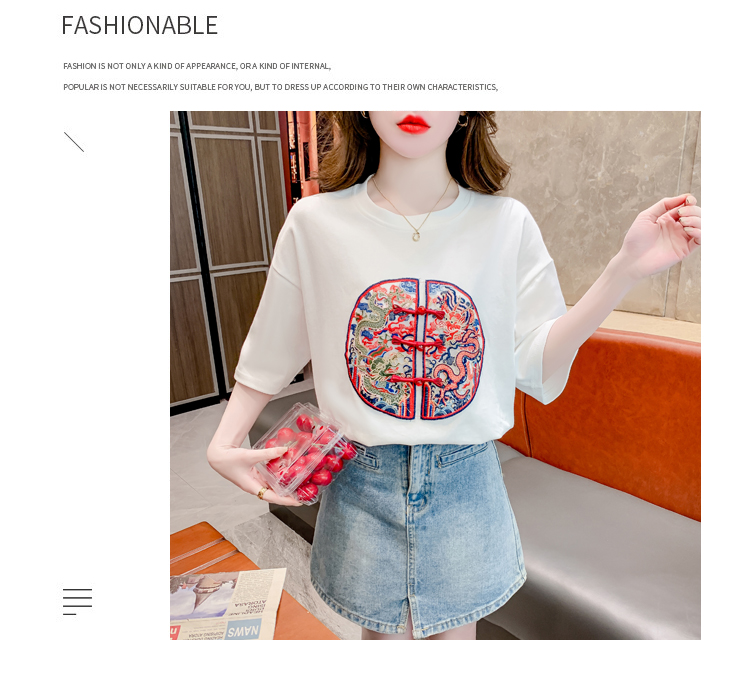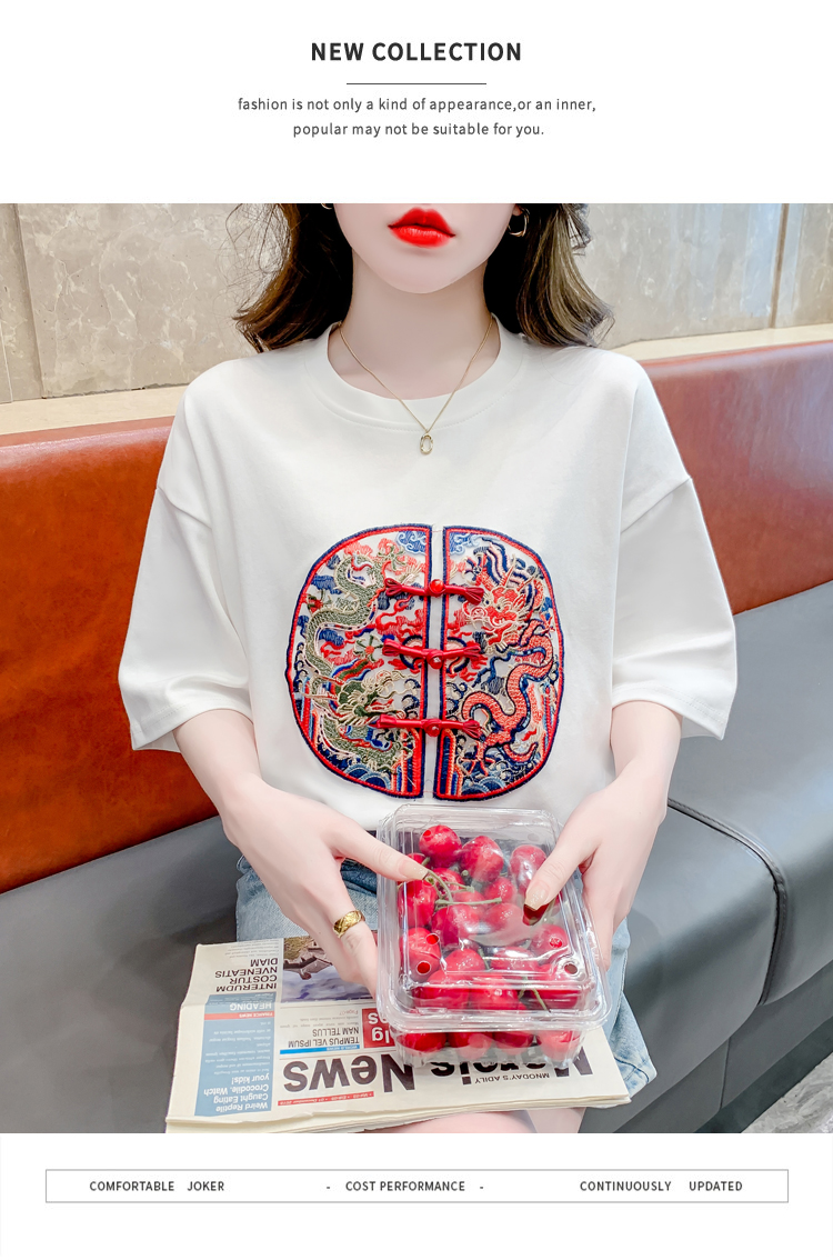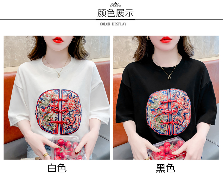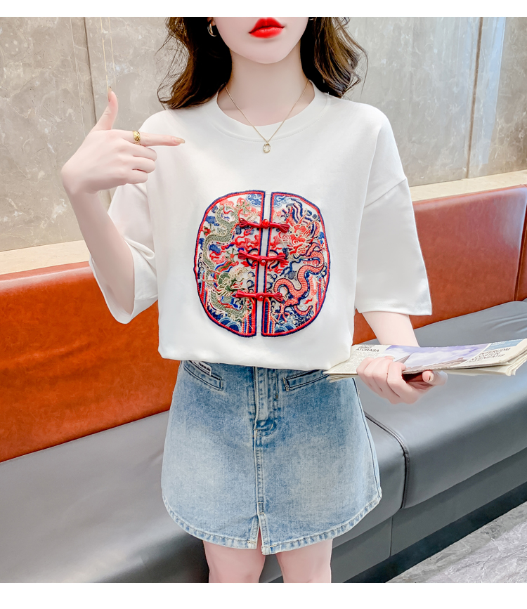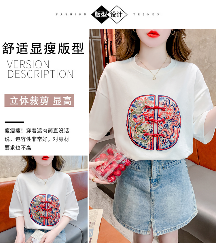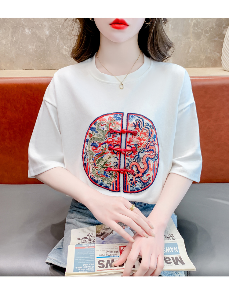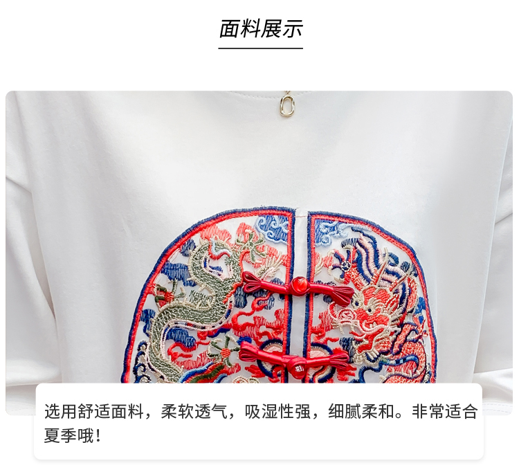 PF2440#新中式国风短袖休闲大气设计感女百搭正肩圆领落肩上衣女