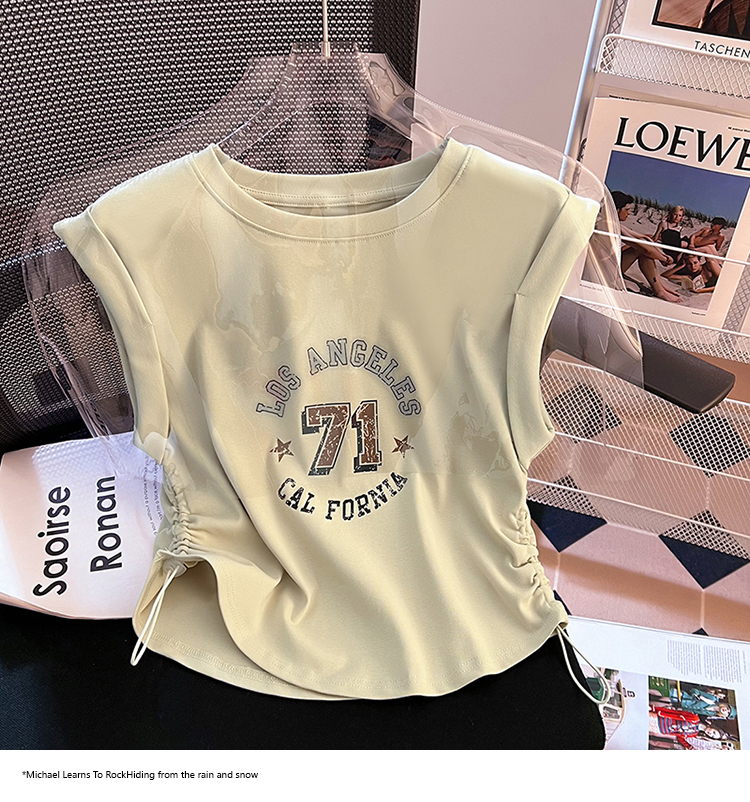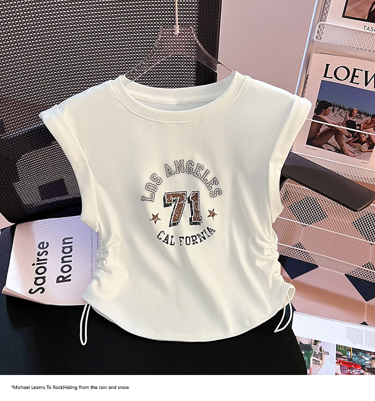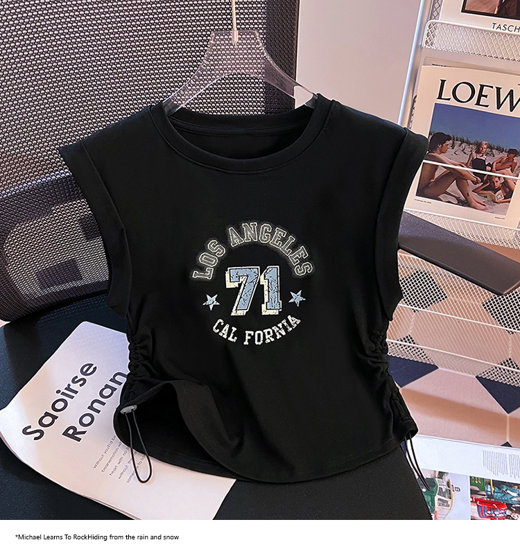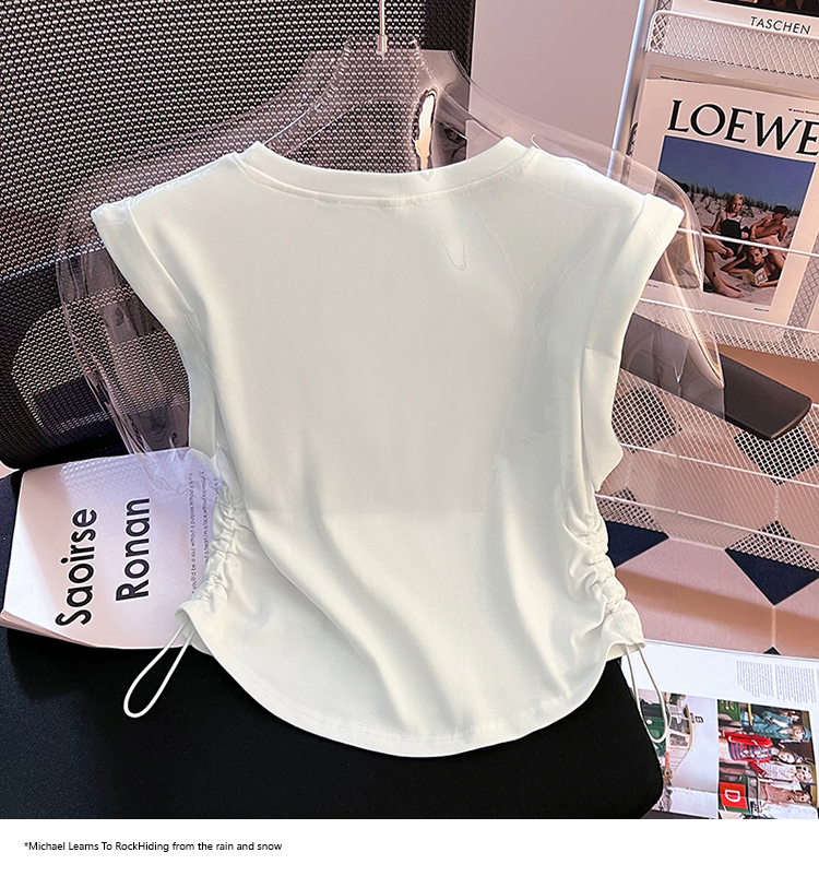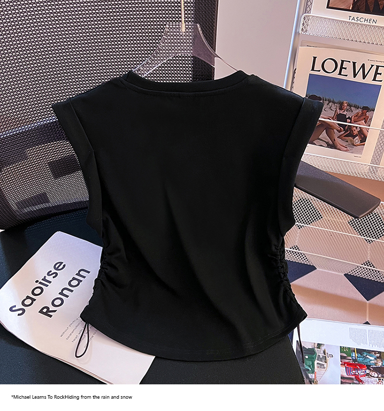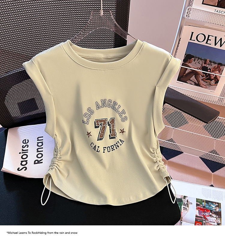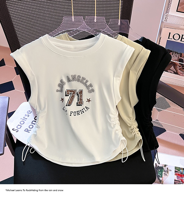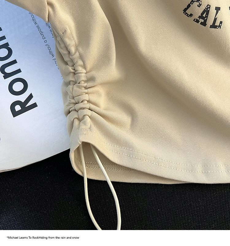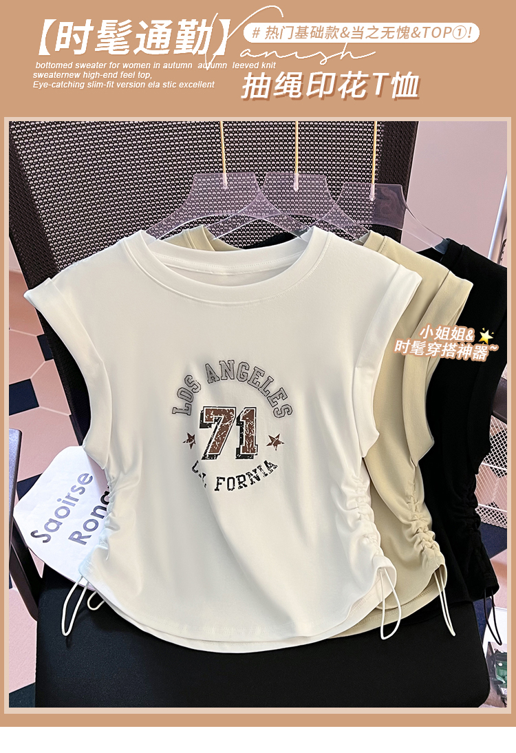 PF2554#新款实拍短袖t恤女圆领套头飞袖设计感小心机印花抽绳上衣女