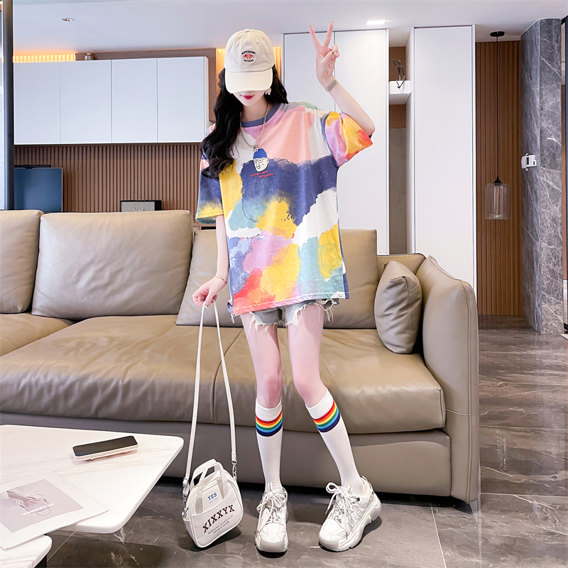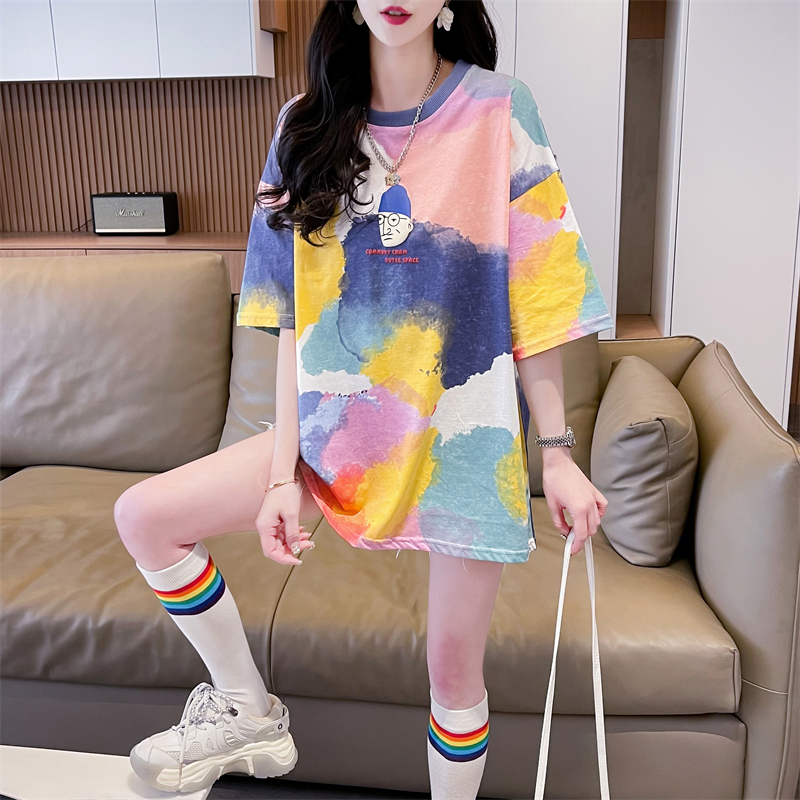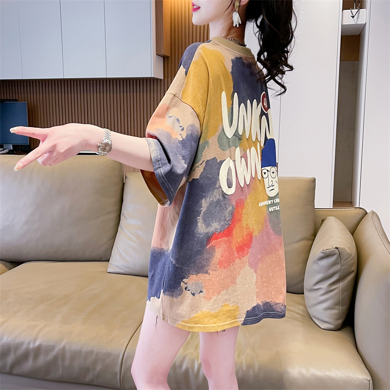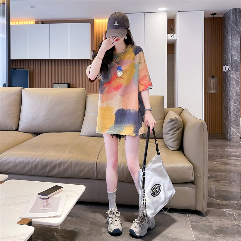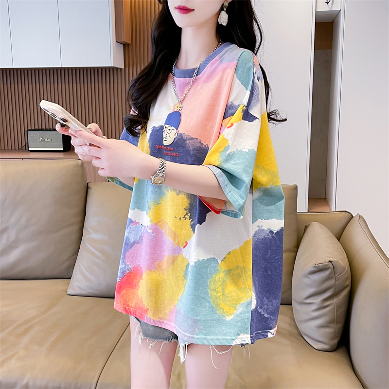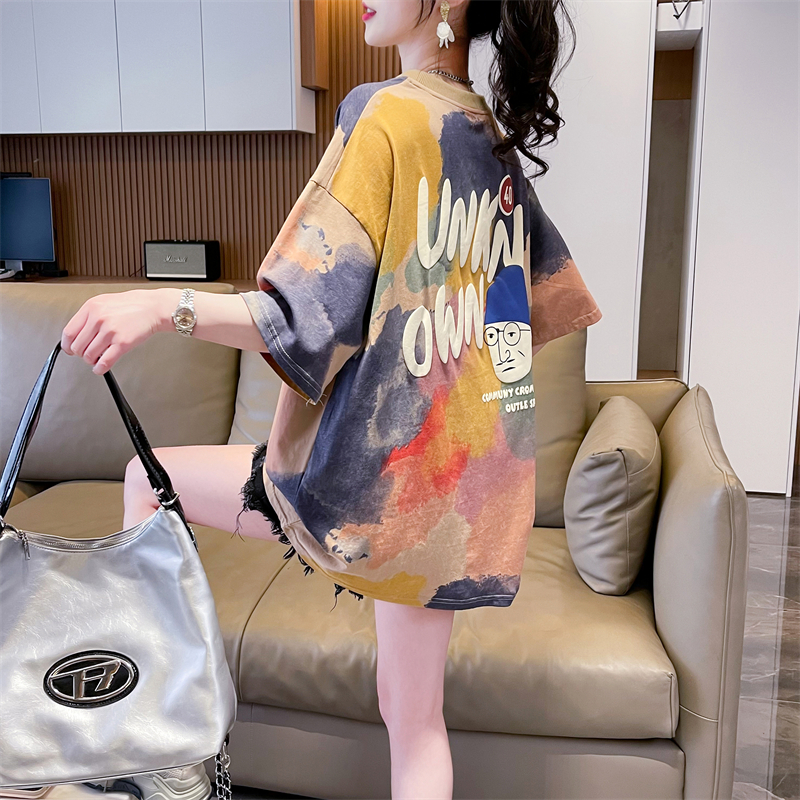 PF2559#小众设计感扎染卡通小熊涂鸦短袖t恤女宽松韩版上衣