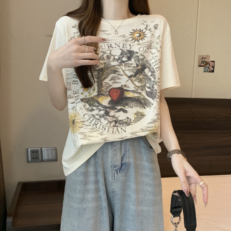 PF2617#水墨涂鸦印花短袖丛林高紧密 夏装前后印花短袖T恤女宽松