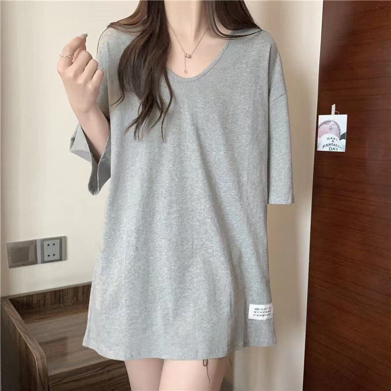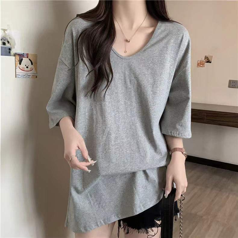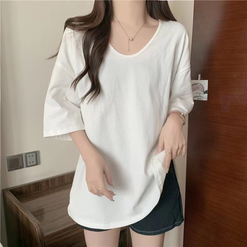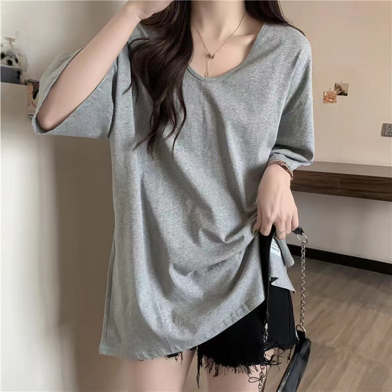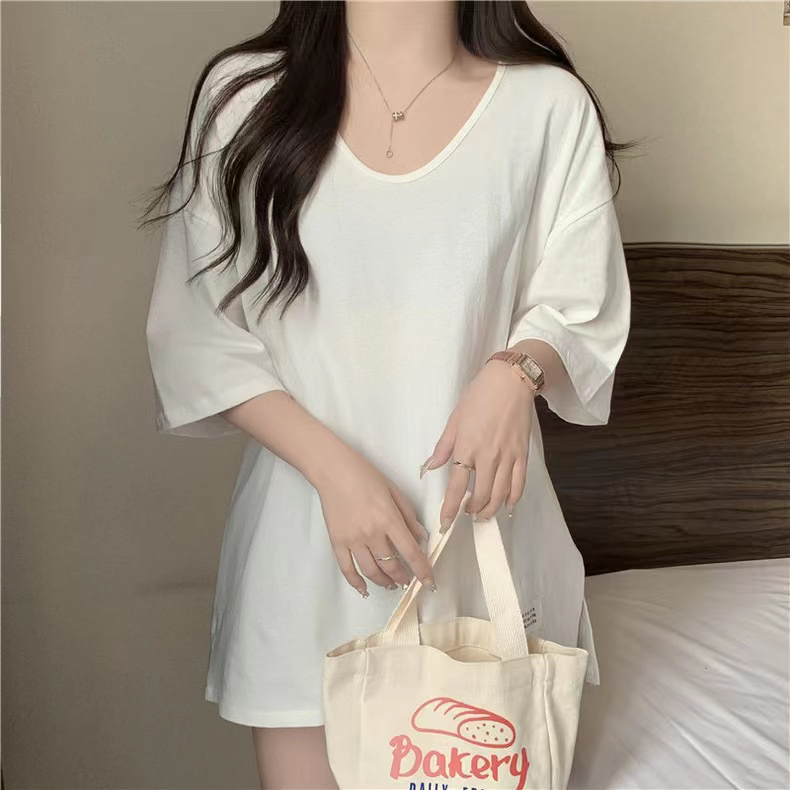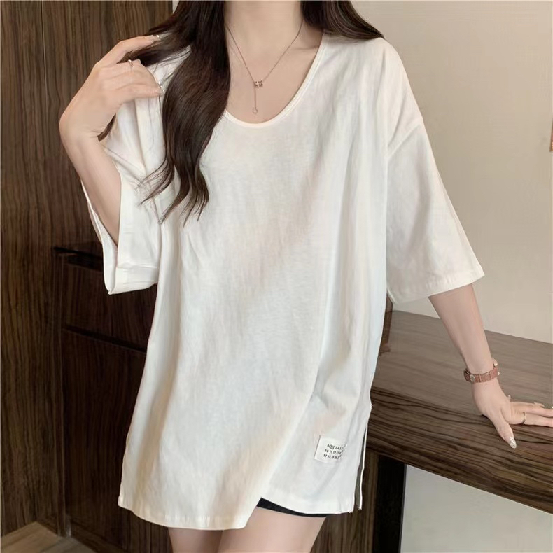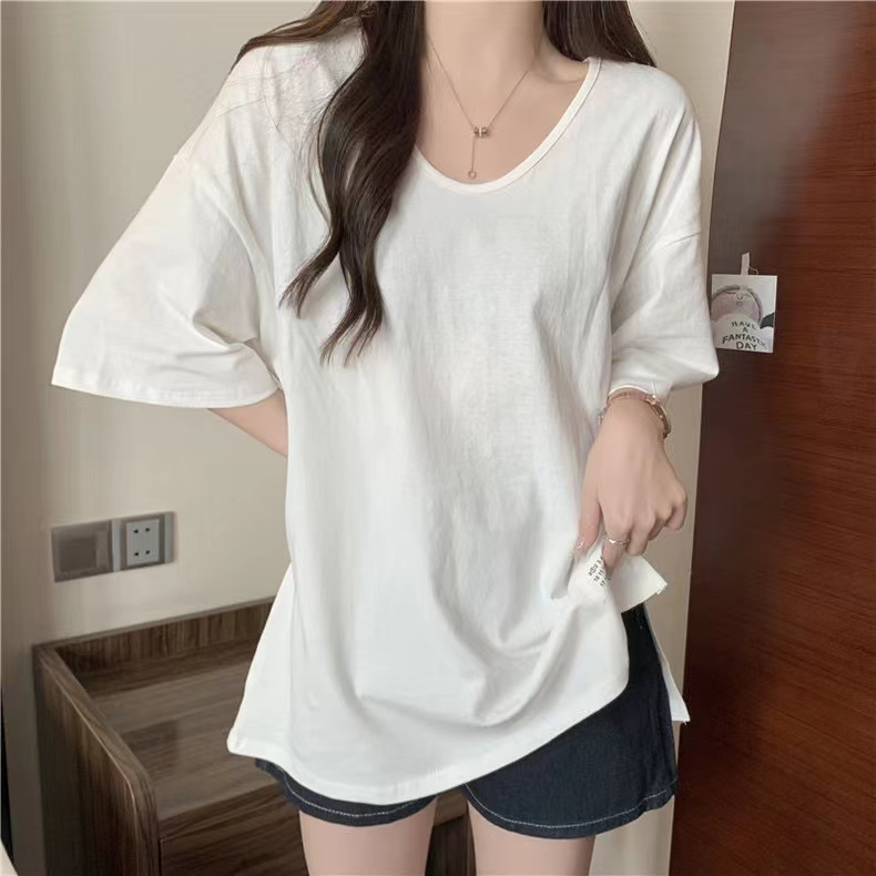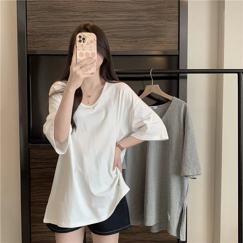 PF2692#纯棉下摆开叉短袖T恤女中长款半袖上衣简约百搭休闲套头夏季
