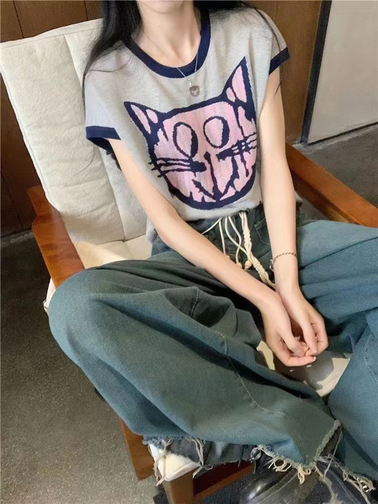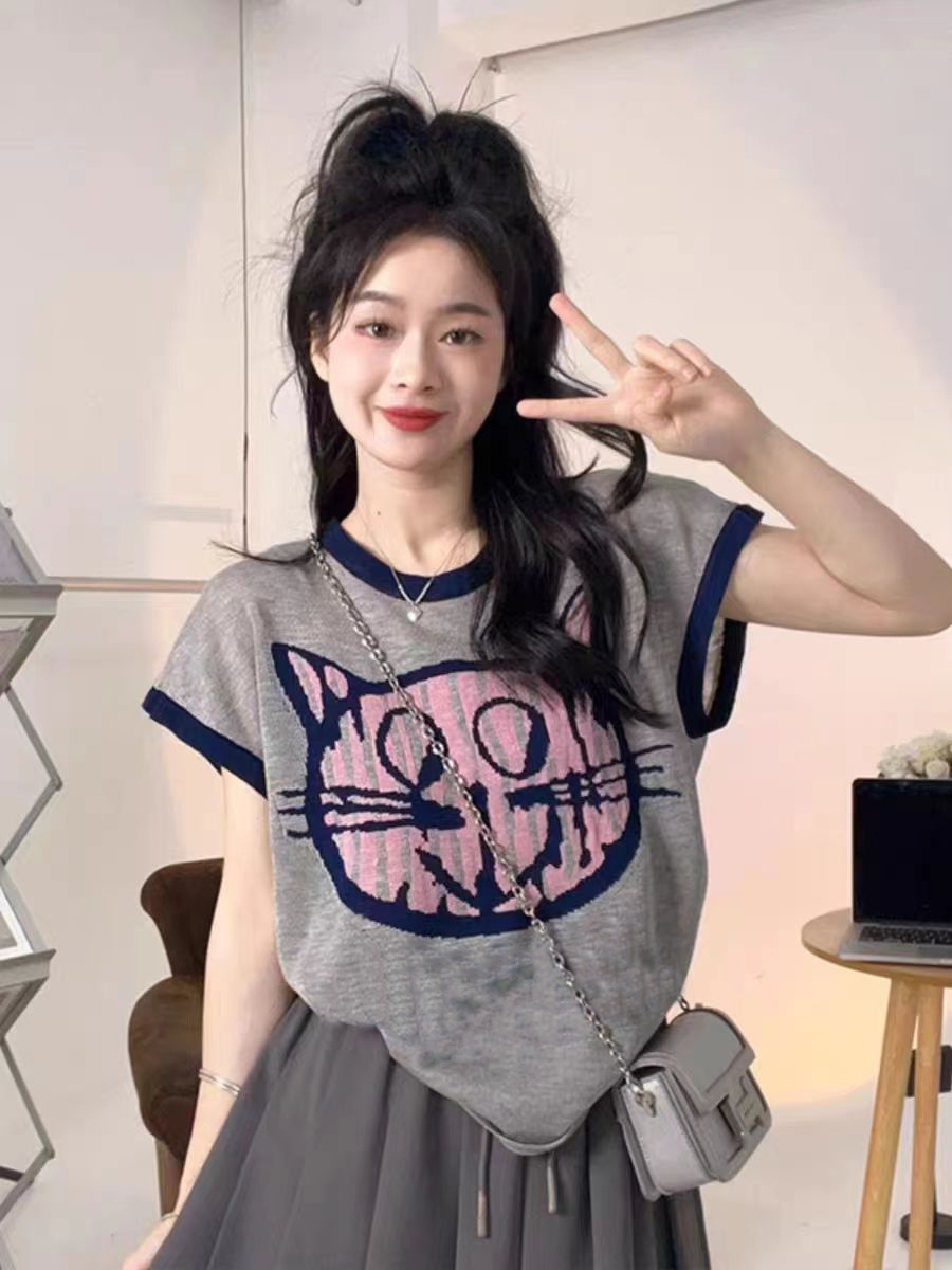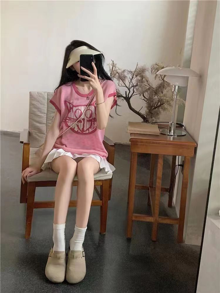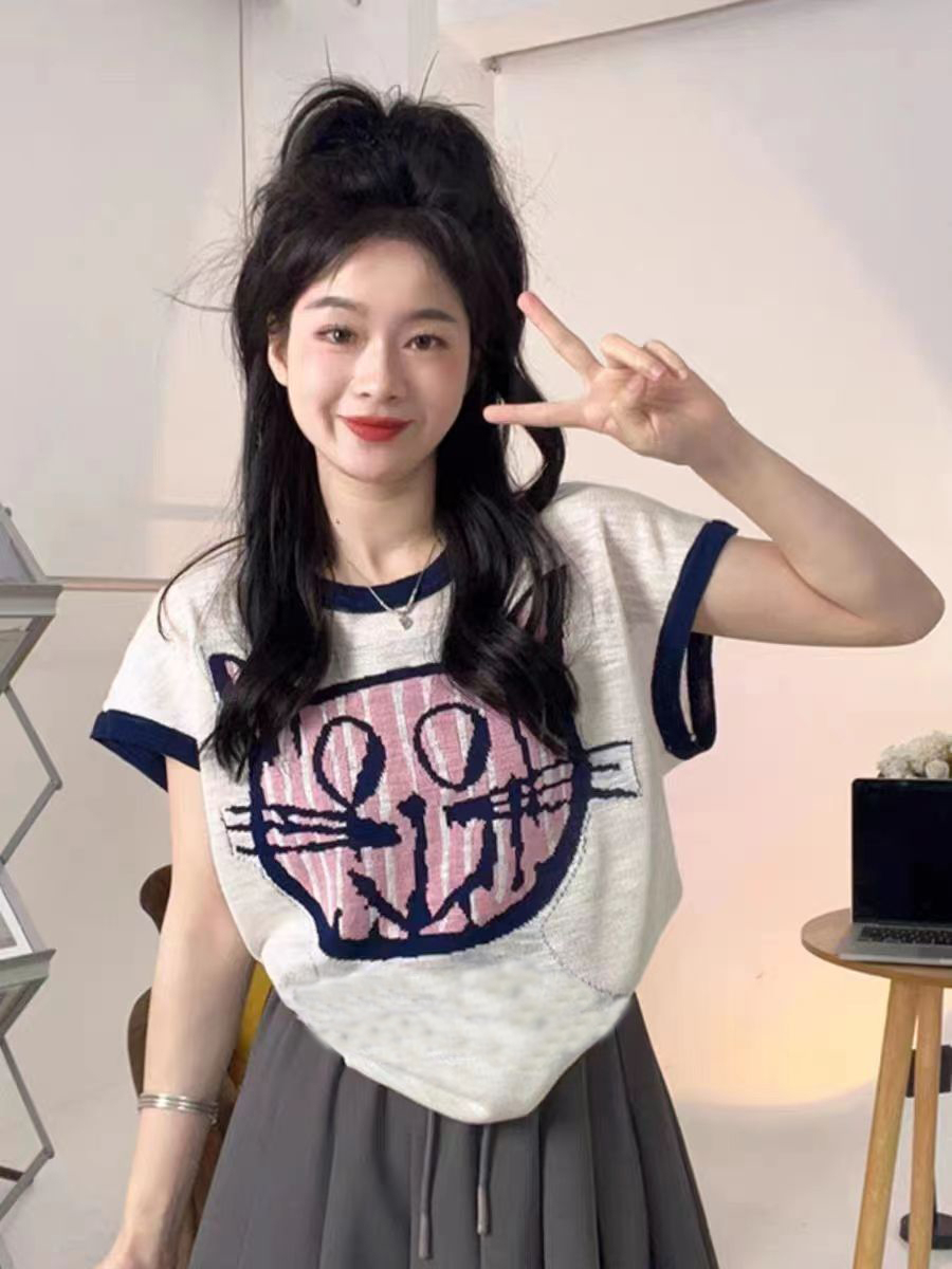 PF2694#夏日清新穿搭正肩短袖t恤女夏季2024新款圆领宽松显瘦辣妹上衣