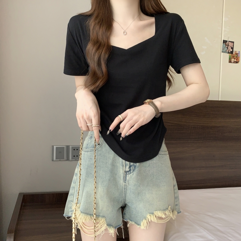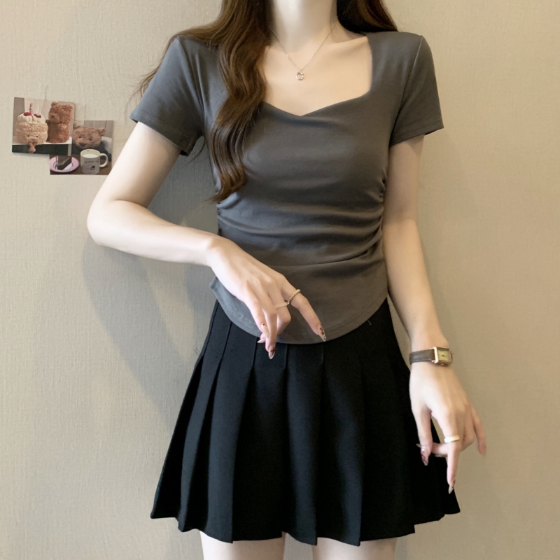 PF2693#新款休闲40支纯棉 2024夏装褶皱修身桃心领短袖T恤女锁骨