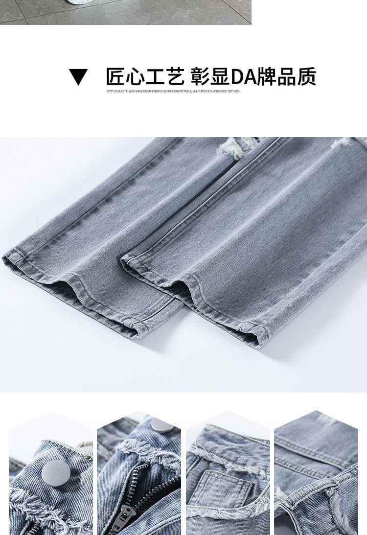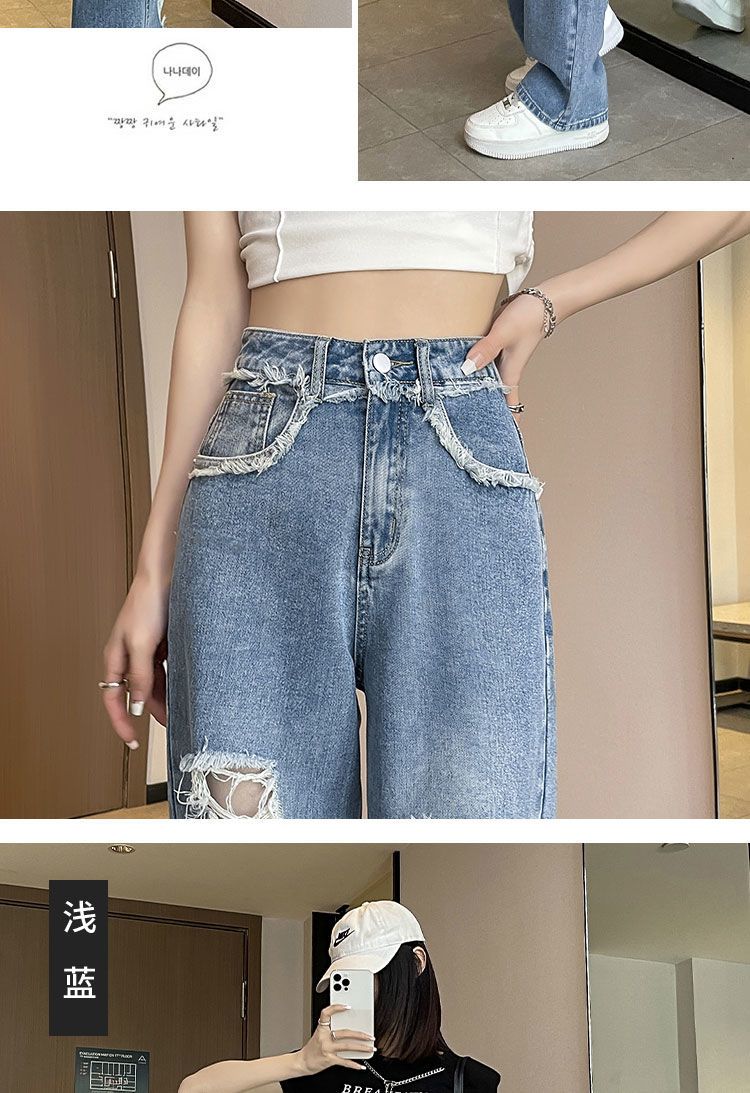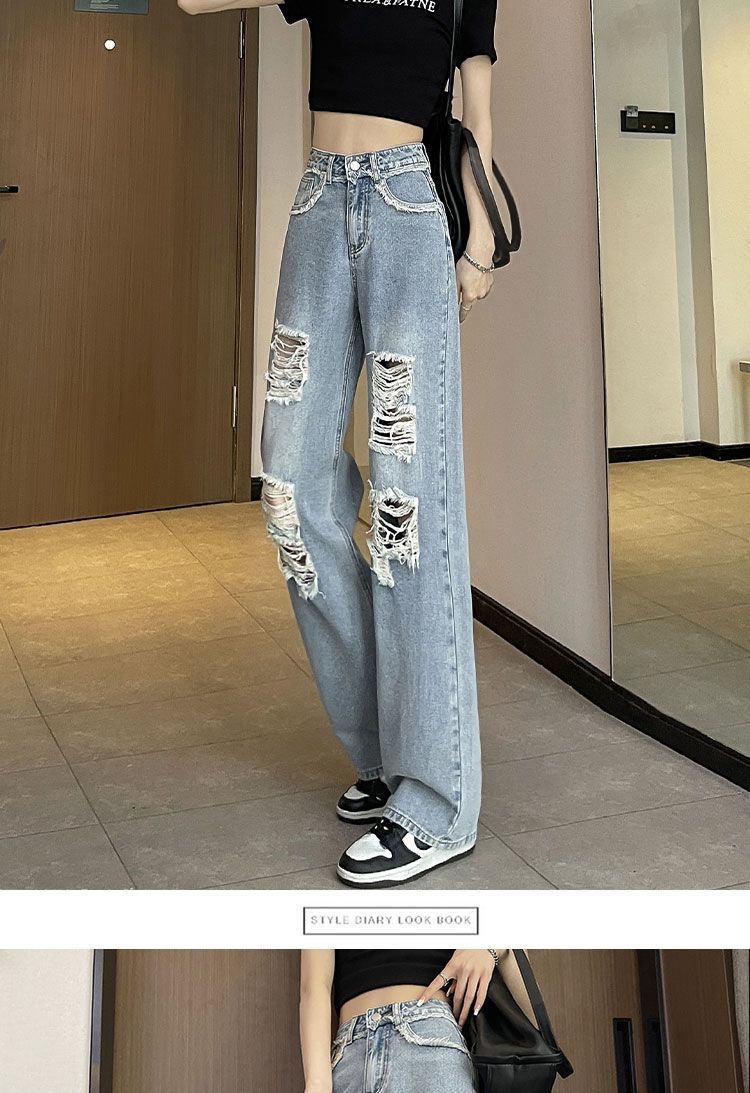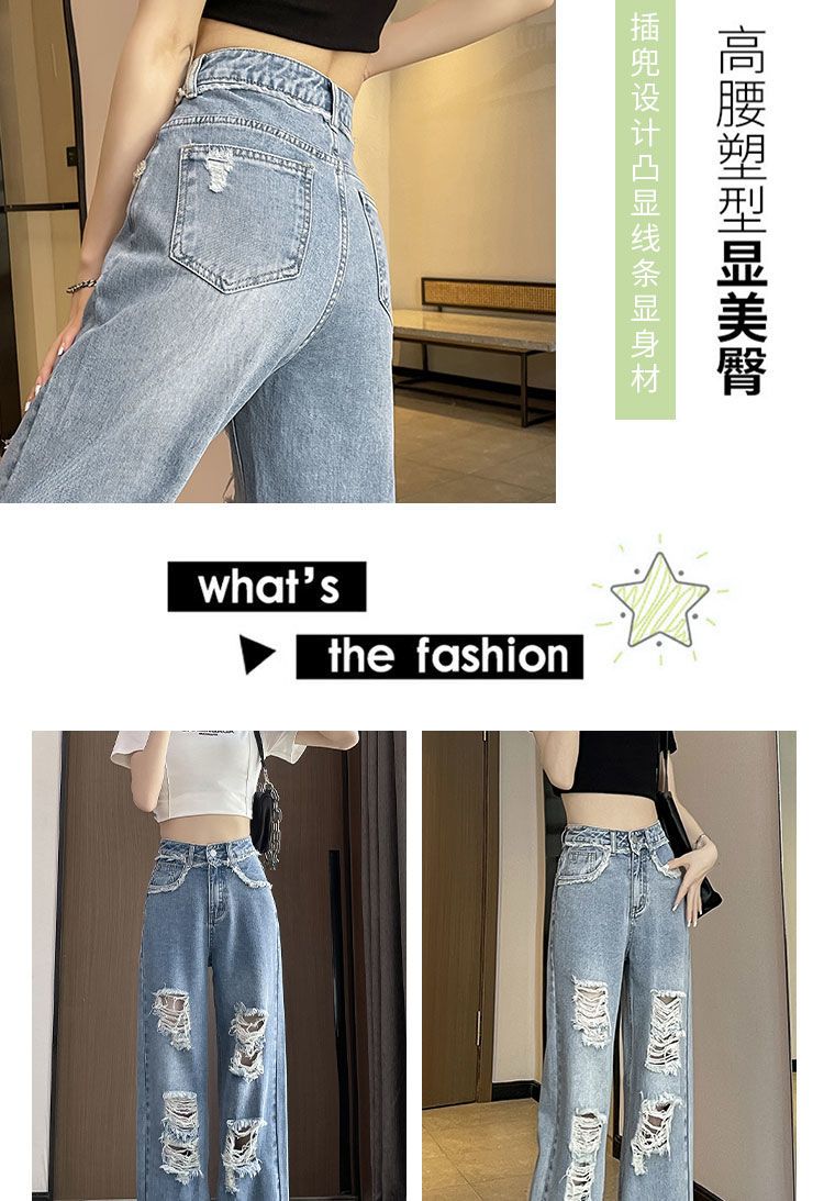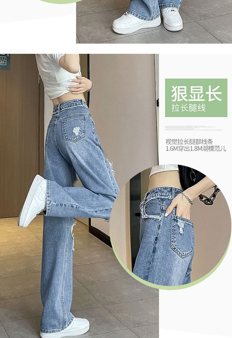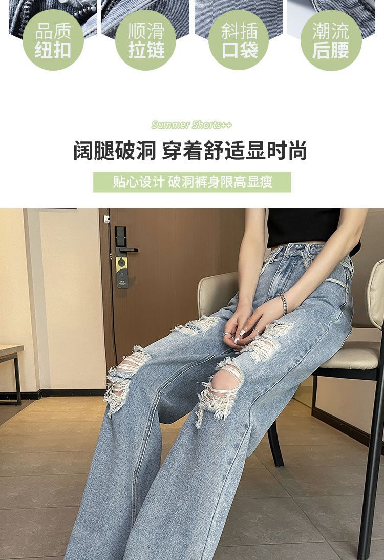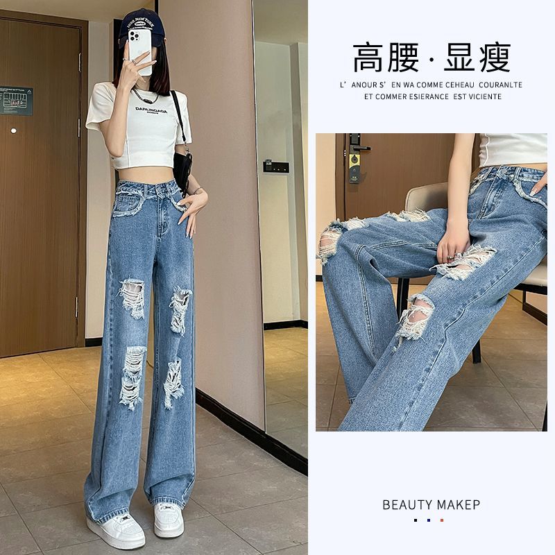 PF2720#高腰破洞牛仔直筒裤女薄款 夏新款大码宽松显瘦毛边拖地阔腿裤
