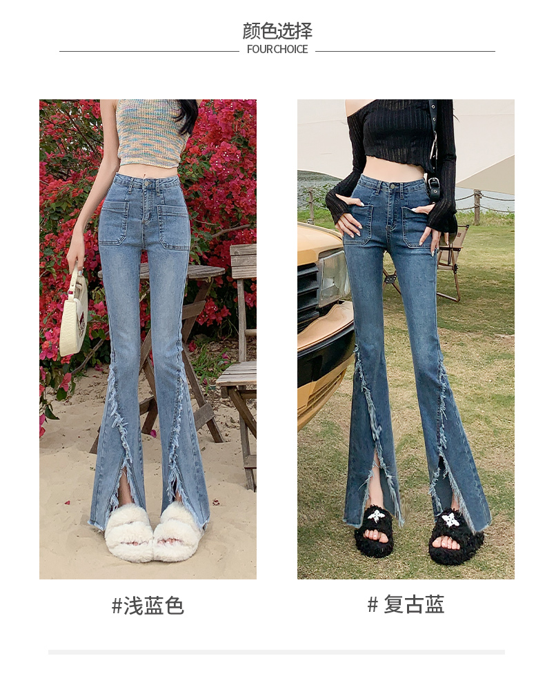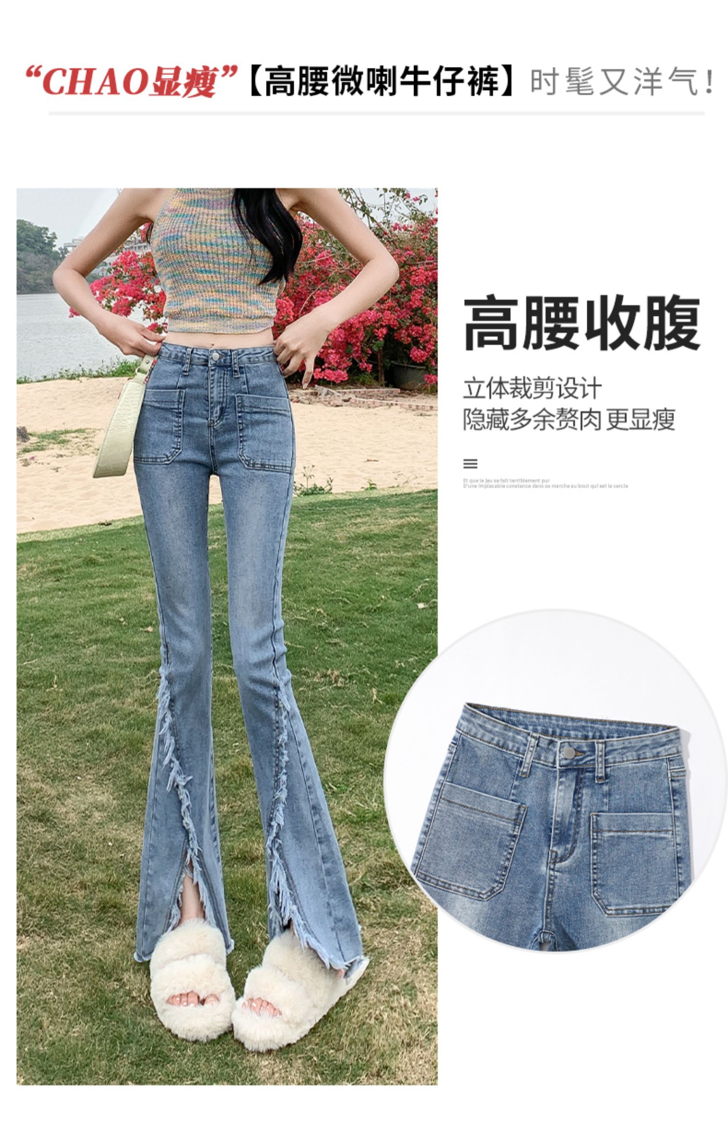 PF2721#开叉微喇牛仔裤女 夏季新款弹力显瘦喇叭裤高腰显瘦马蹄长裤
