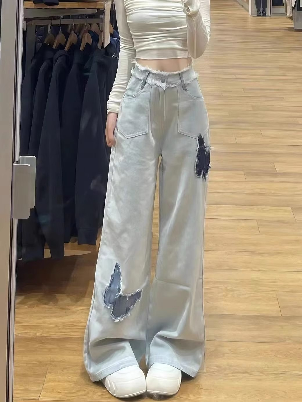 PF2736#复古毛边蝴蝶直筒牛仔裤 新款刺绣设计感高腰宽松显瘦阔腿裤