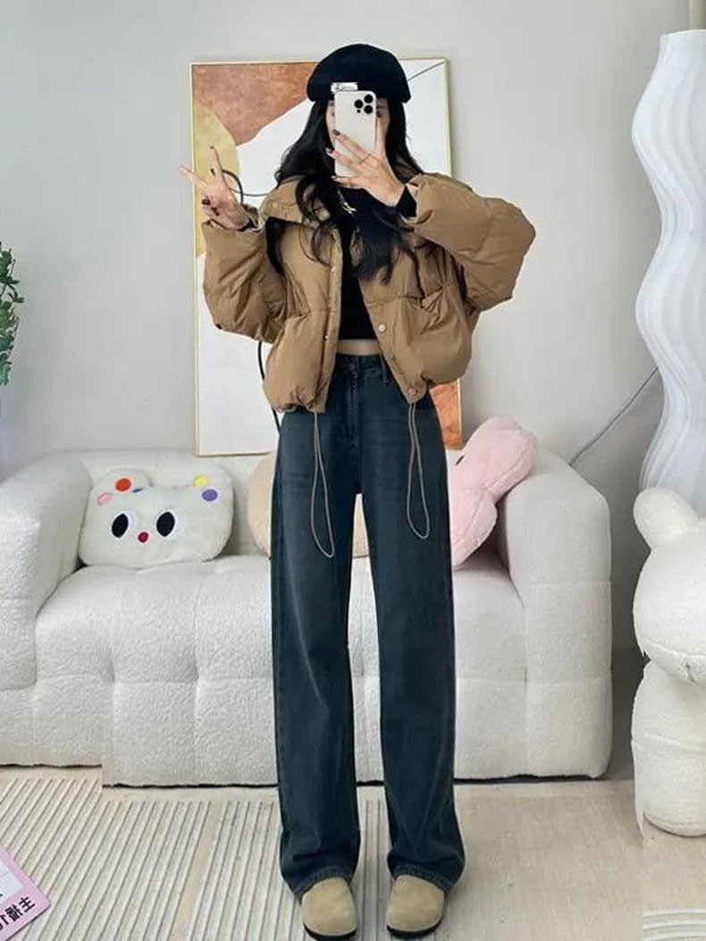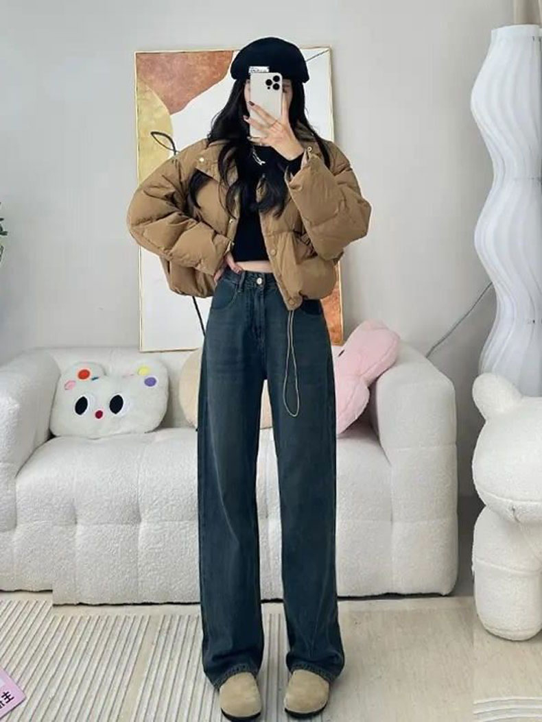 PF2740#U字口袋皮牌设计遮肉阔腿牛仔裤女宽松小众撞色复古直筒拖地裤子