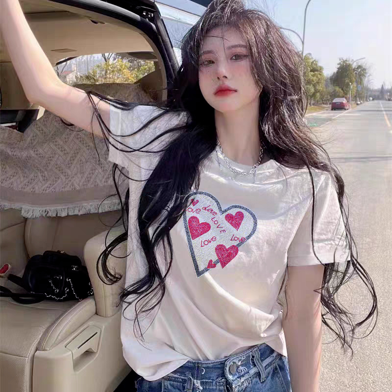 PF2756#重工烫钻纯棉短袖T恤女 夏季新款设计感爱心宽松大码胖MM上衣