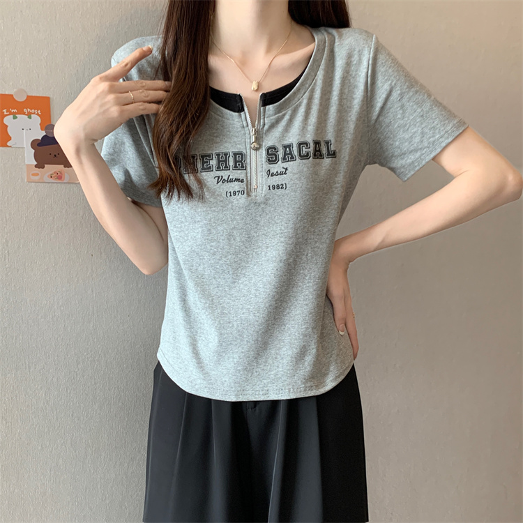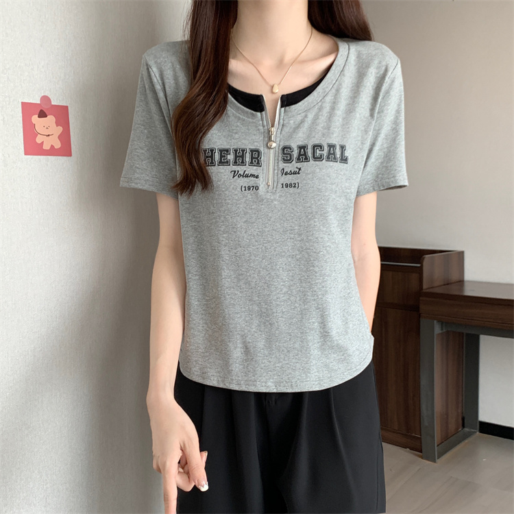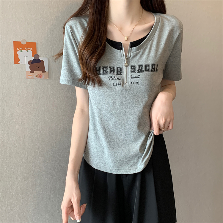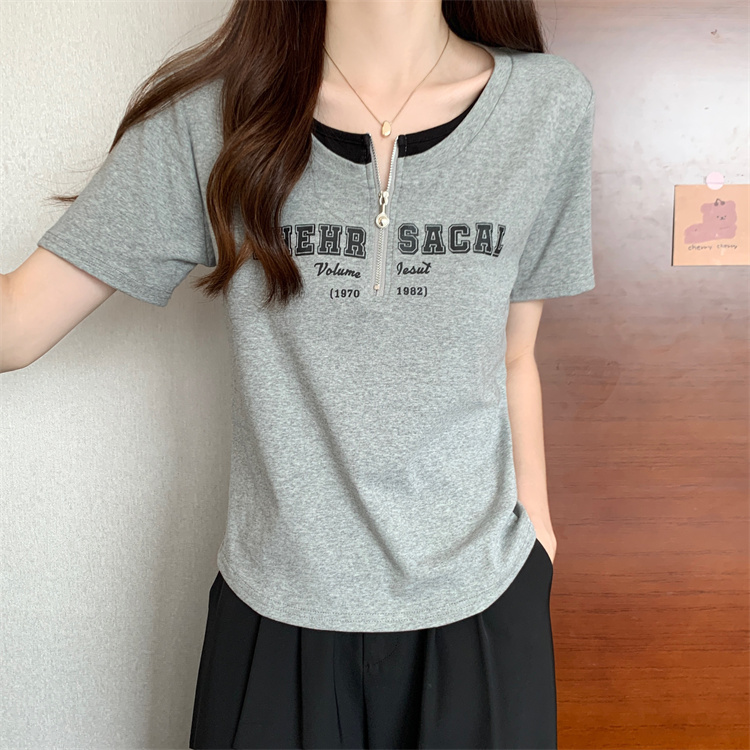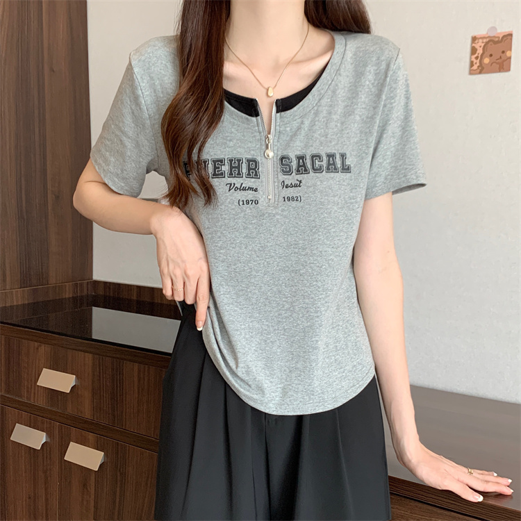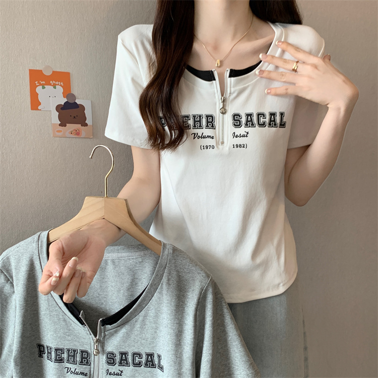 PF2770#大码夏季韩版时尚圆领短袖T恤拼接拉链修身上衣