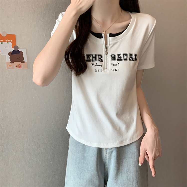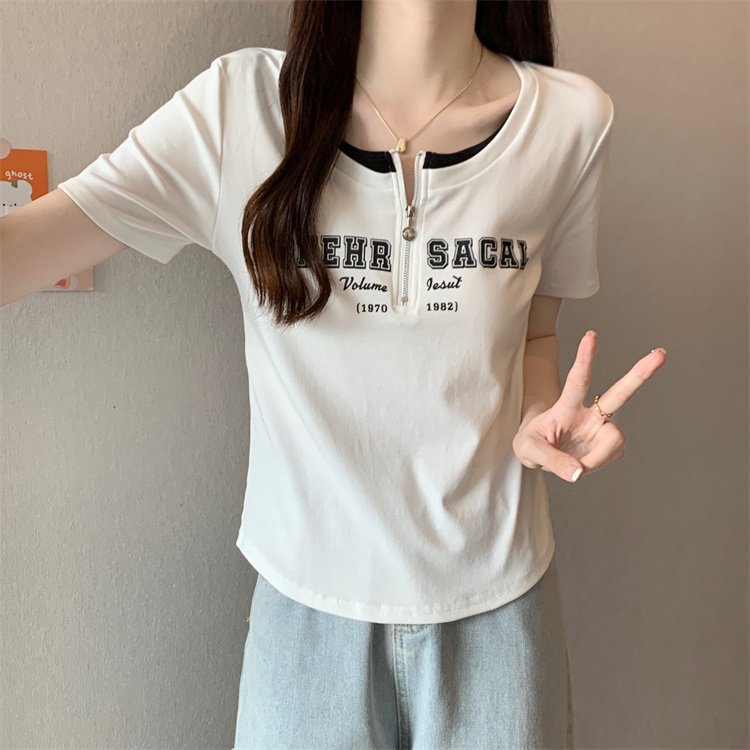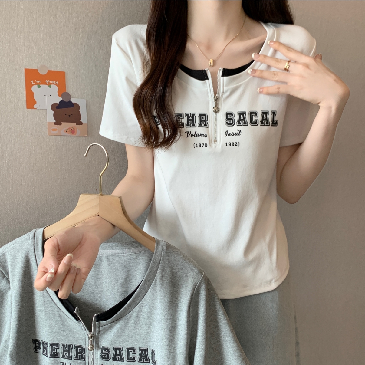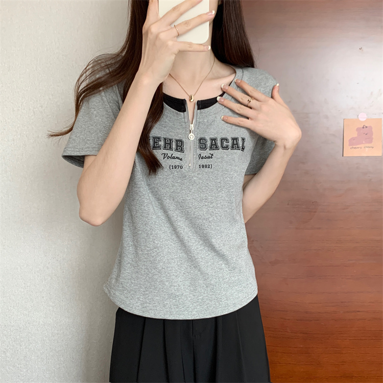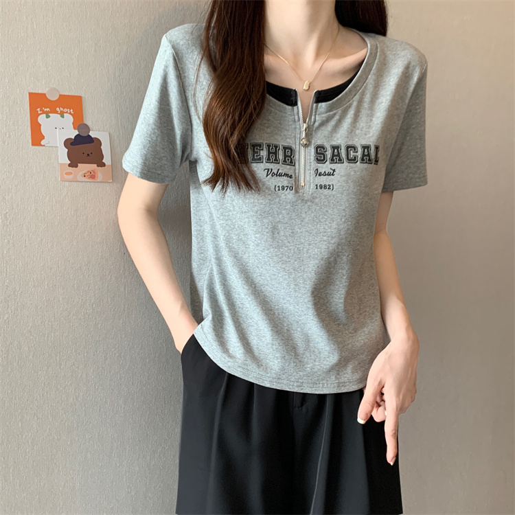 PF2770#大码夏季韩版时尚圆领短袖T恤拼接拉链修身上衣