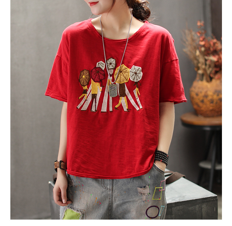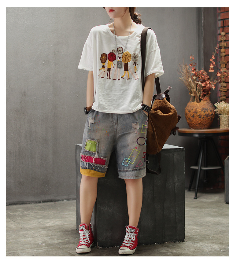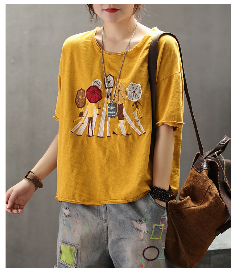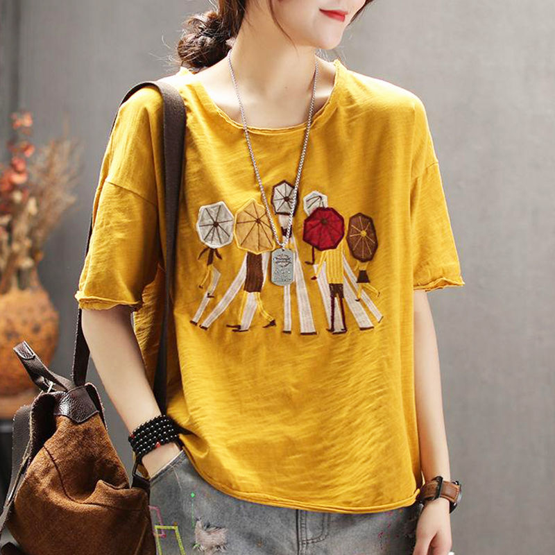 PF2804#纯棉短袖t恤新款休闲印花文艺五分袖宽松款百搭上衣