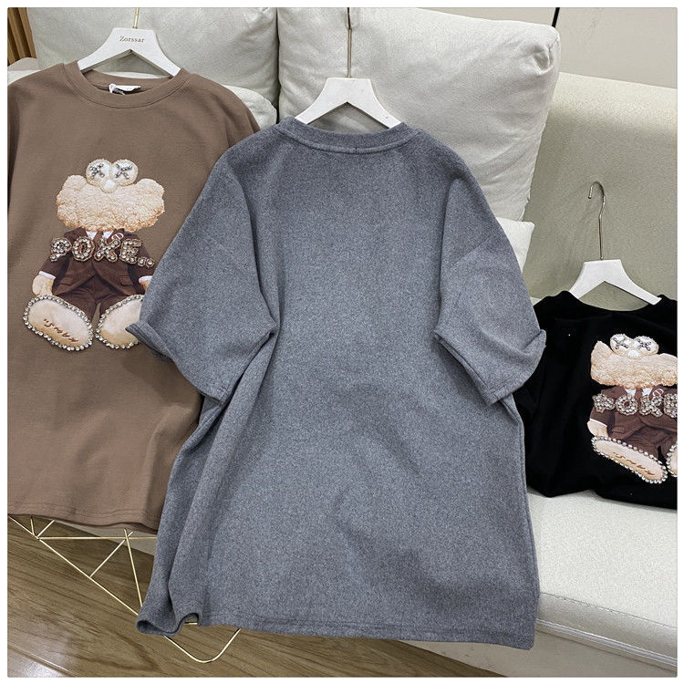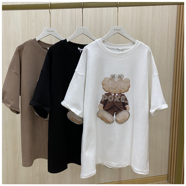 PF2809#重工烫钻短袖t恤新款大码女装宽松显瘦遮肚上衣
