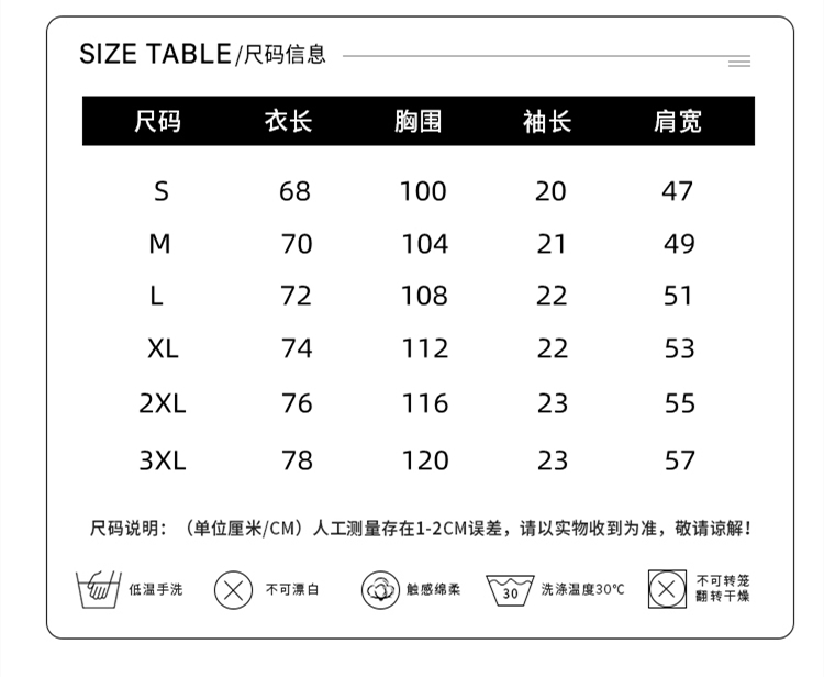因裁剪工艺和丈量手法不同,可能存在1~3CM 左右误差,尺码仅供参考,以实物为准