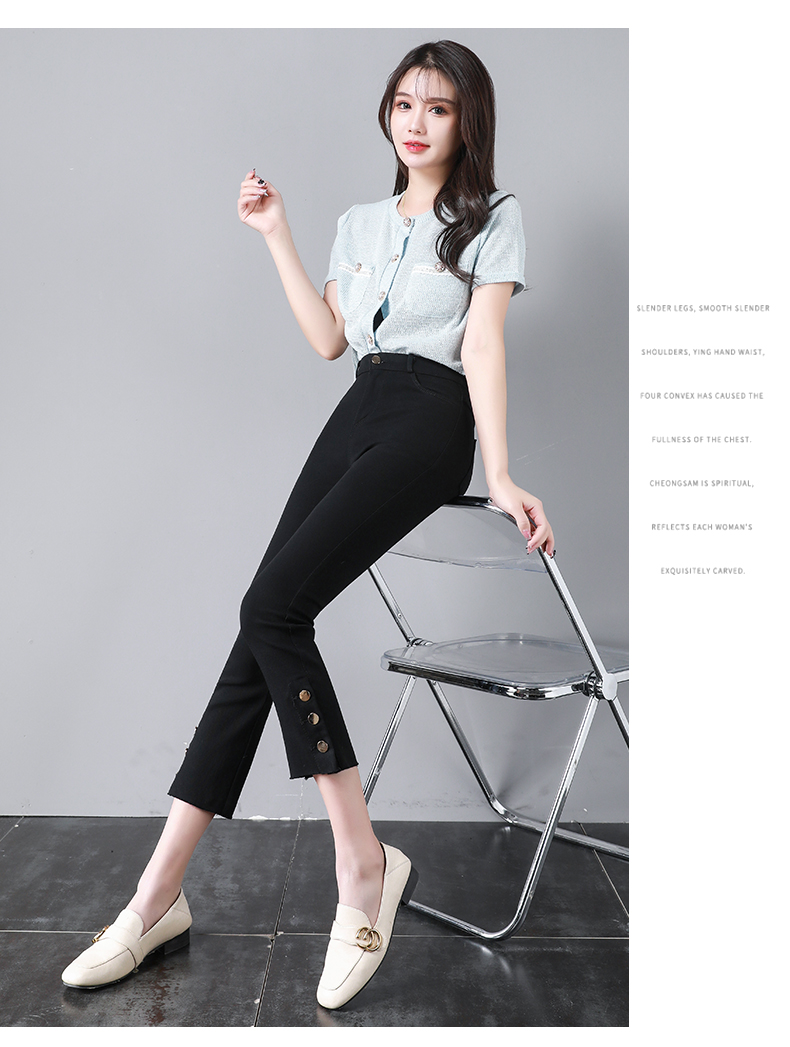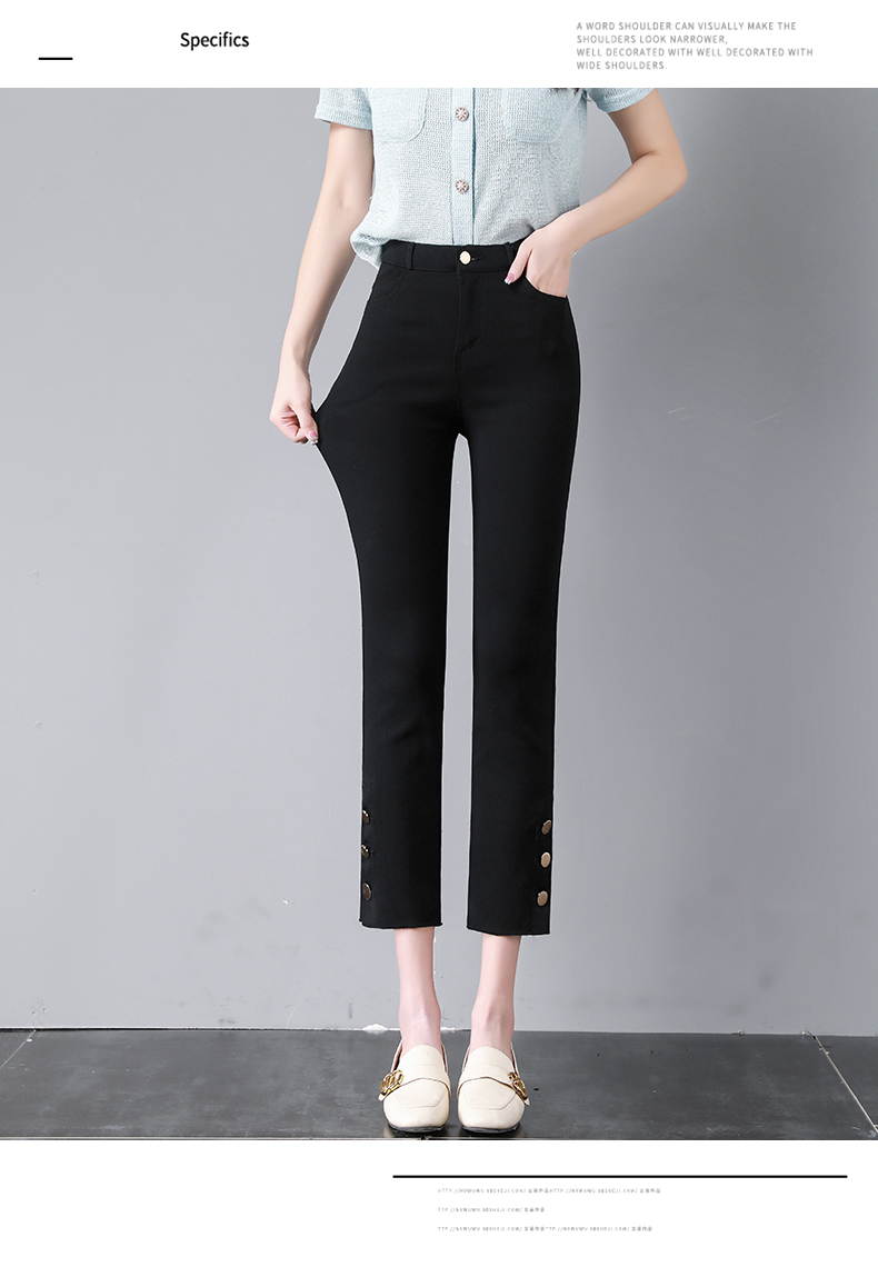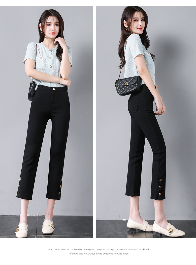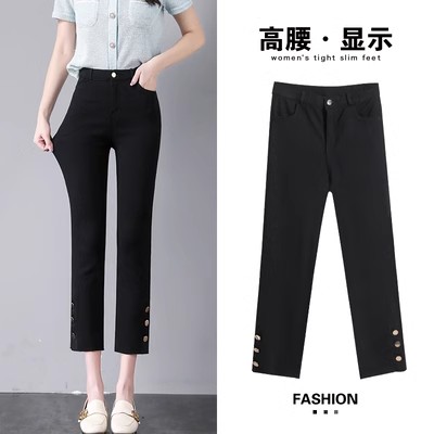 PF2843#九分侧边纽扣开叉毛边黑色高腰外穿打底裤薄款休闲九分女裤