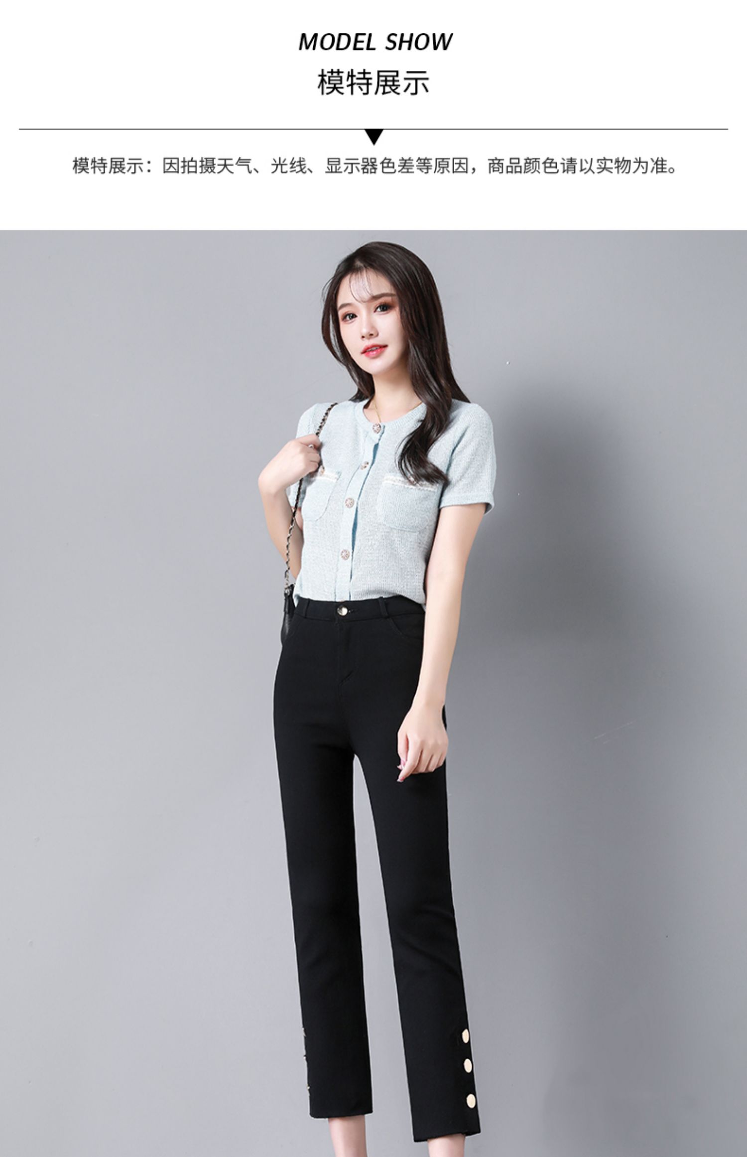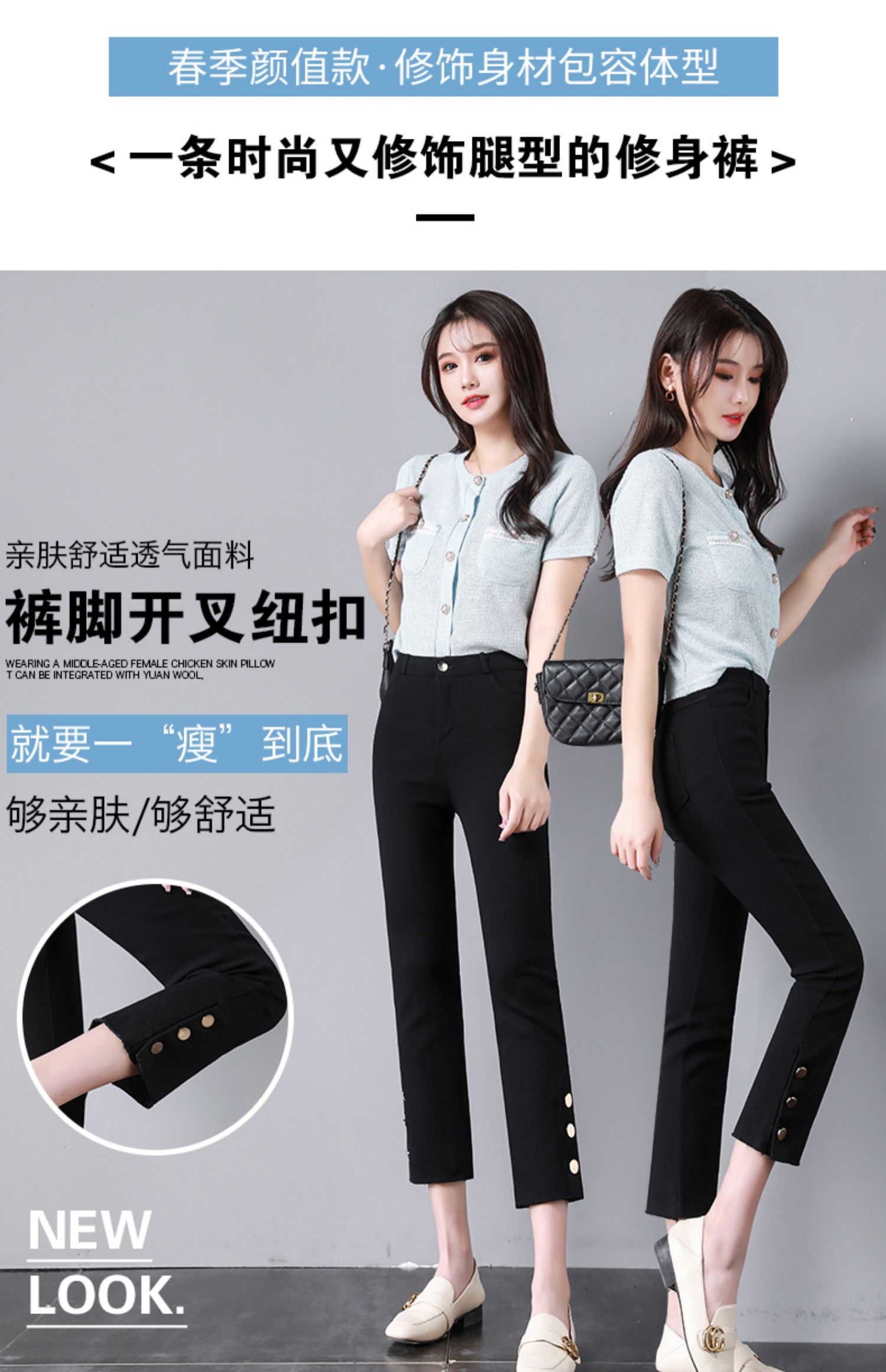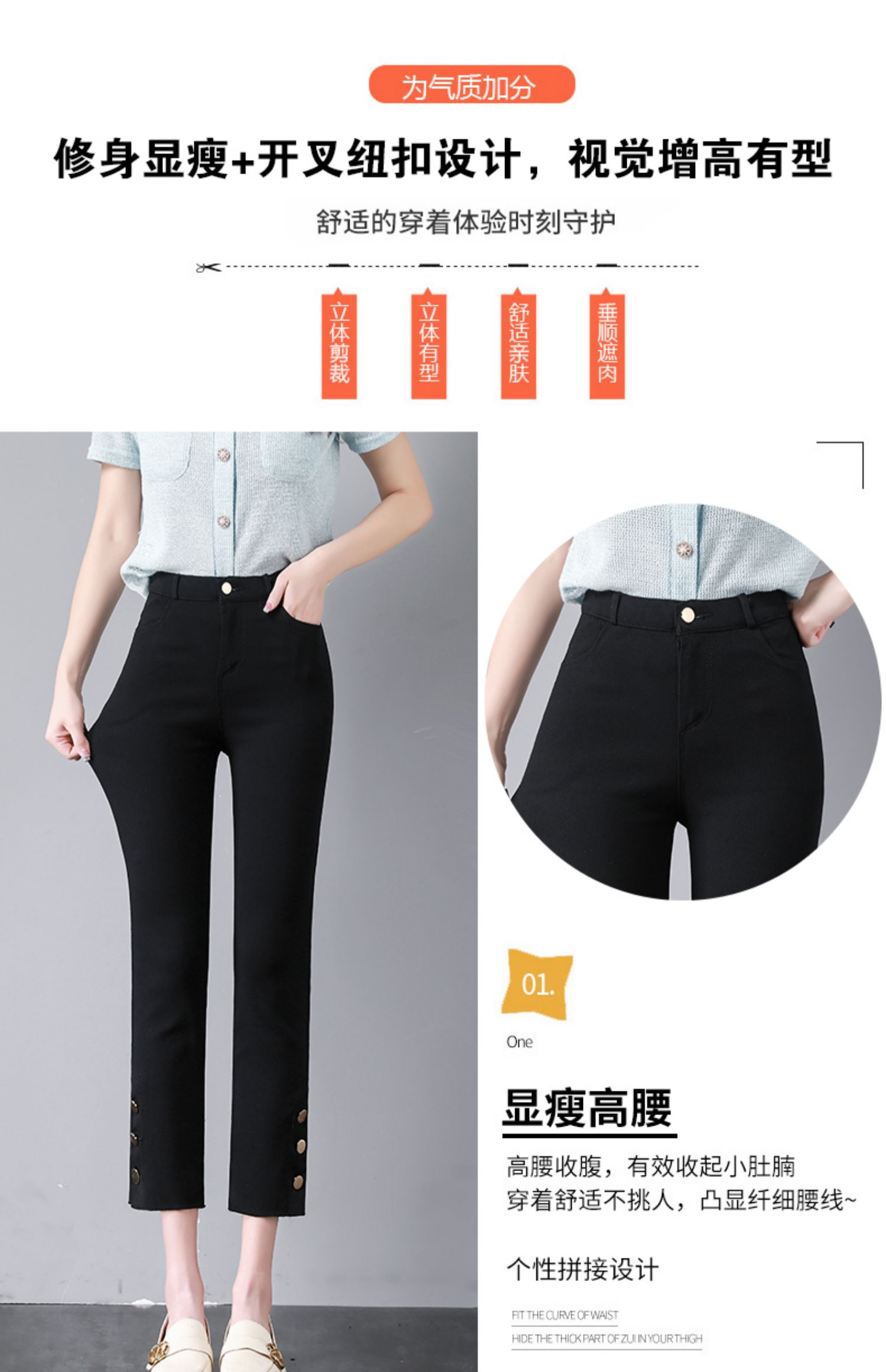 PF2843#九分侧边纽扣开叉毛边黑色高腰外穿打底裤薄款休闲九分女裤
