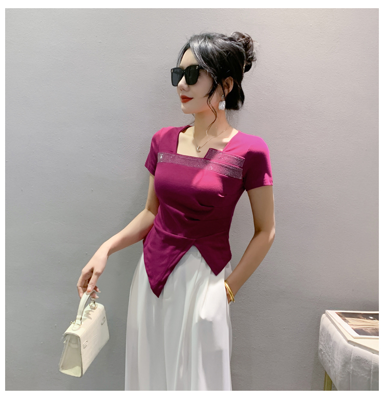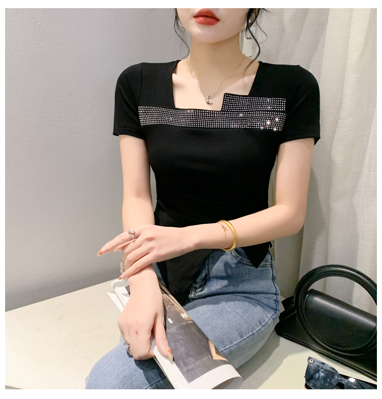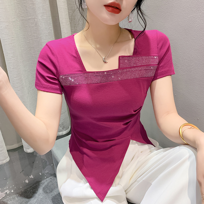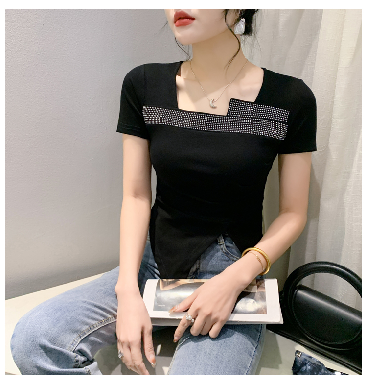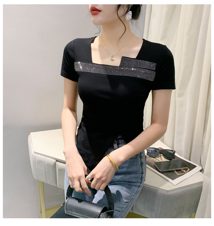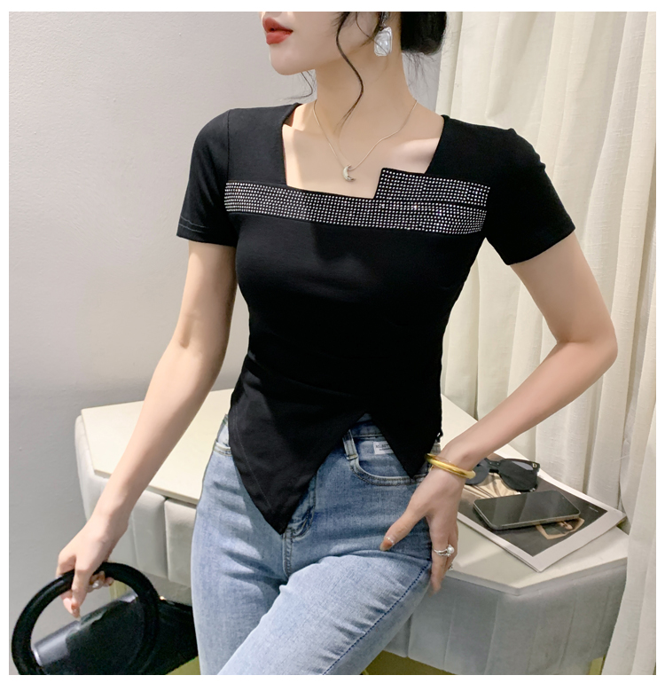 PF2885#夏季新款设计感时尚不规则短袖烫钻修身显瘦t恤小衫女潮