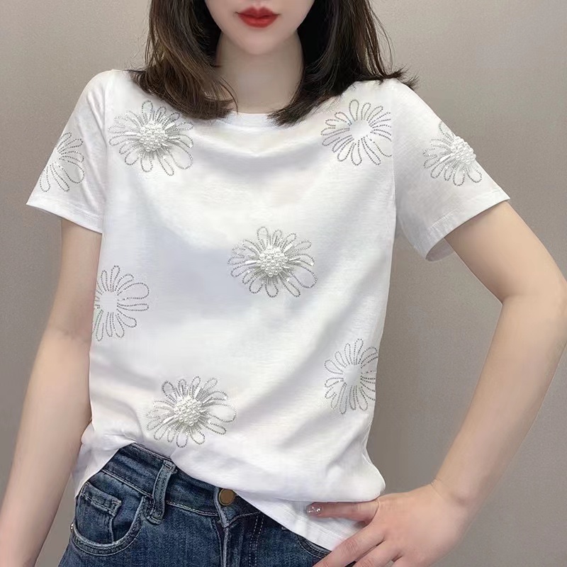 PF2954#洋气镶钻印花圆领短袖针织衫女夏季小众百搭休闲宽松显瘦套头上衣
