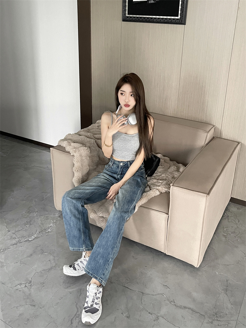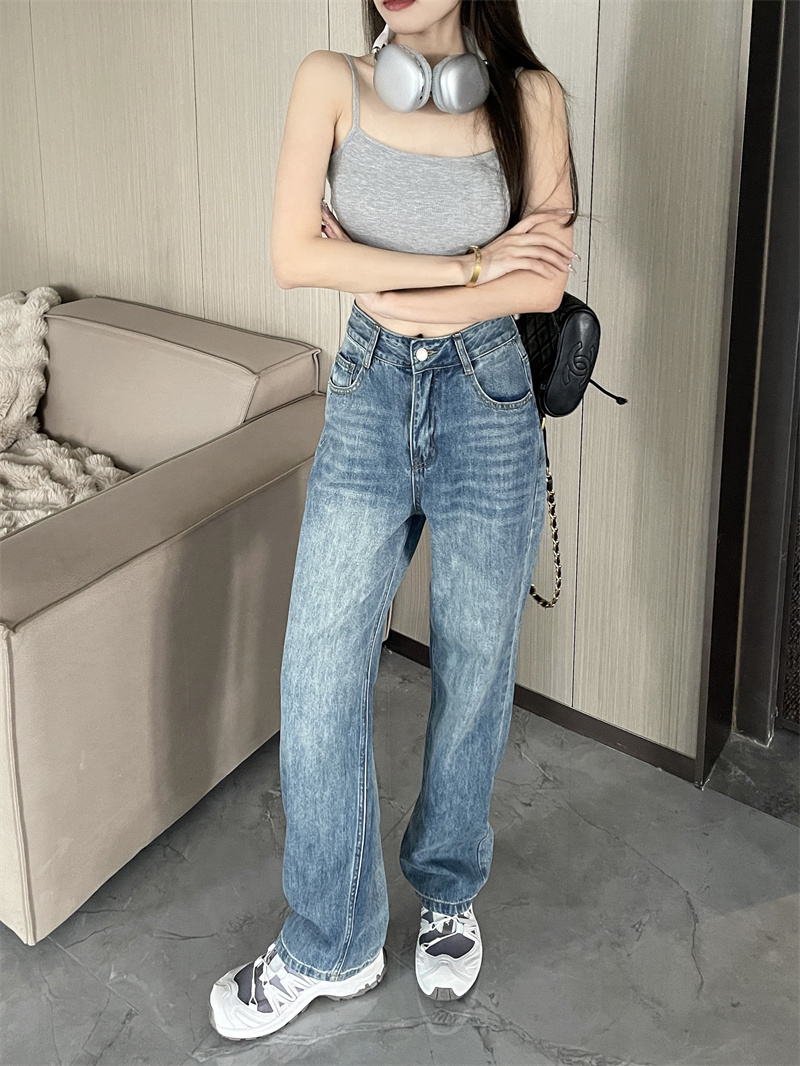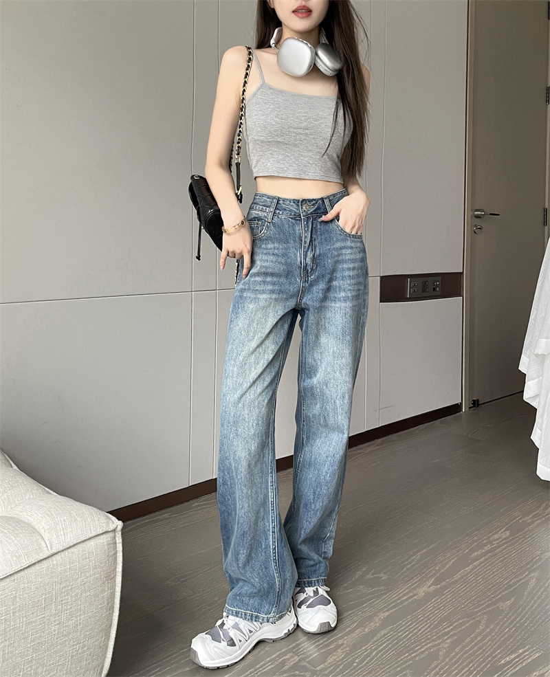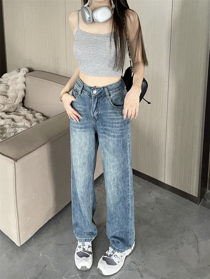 PF2986#复古裤子百搭高腰休闲阔腿裤拖地长裤直筒牛仔裤女