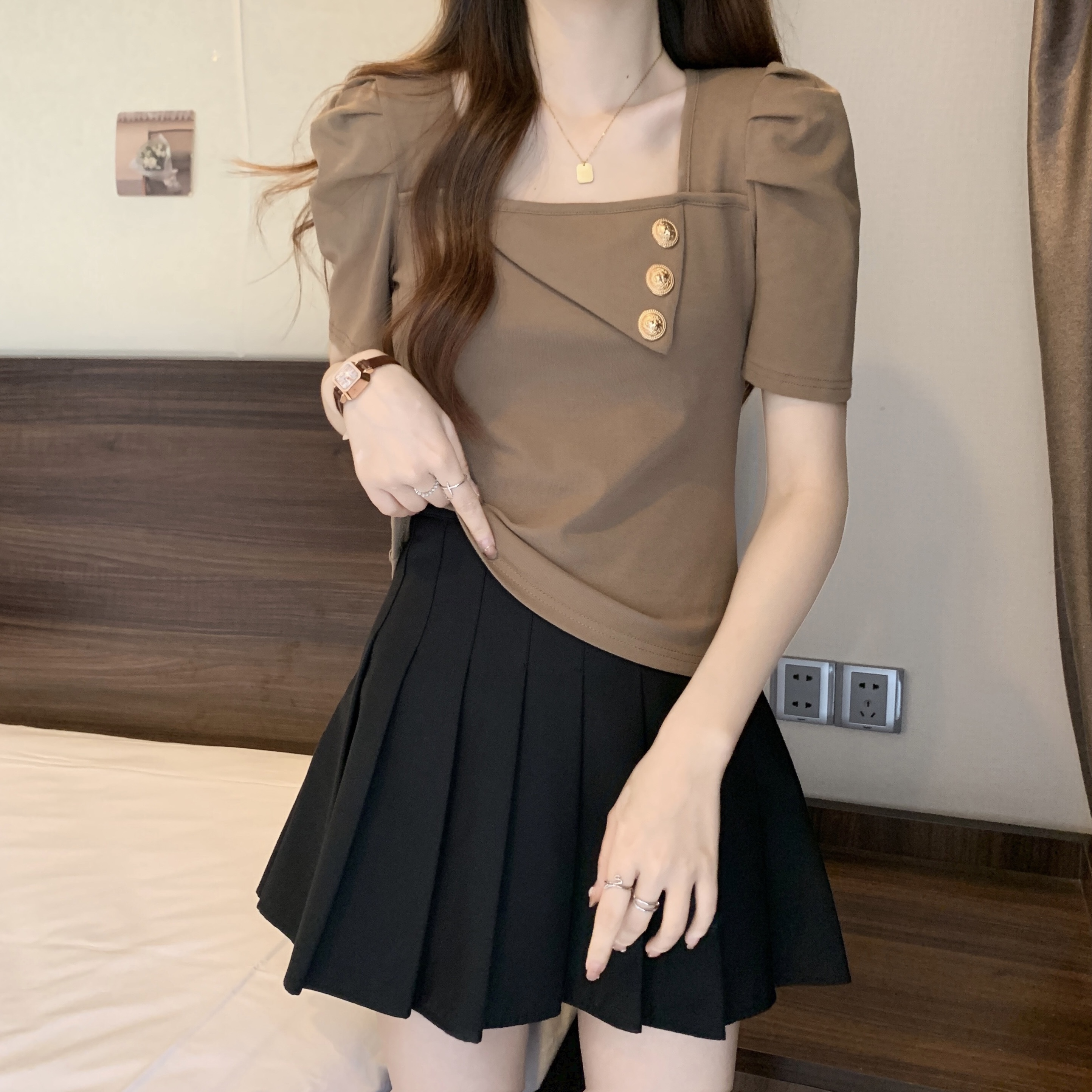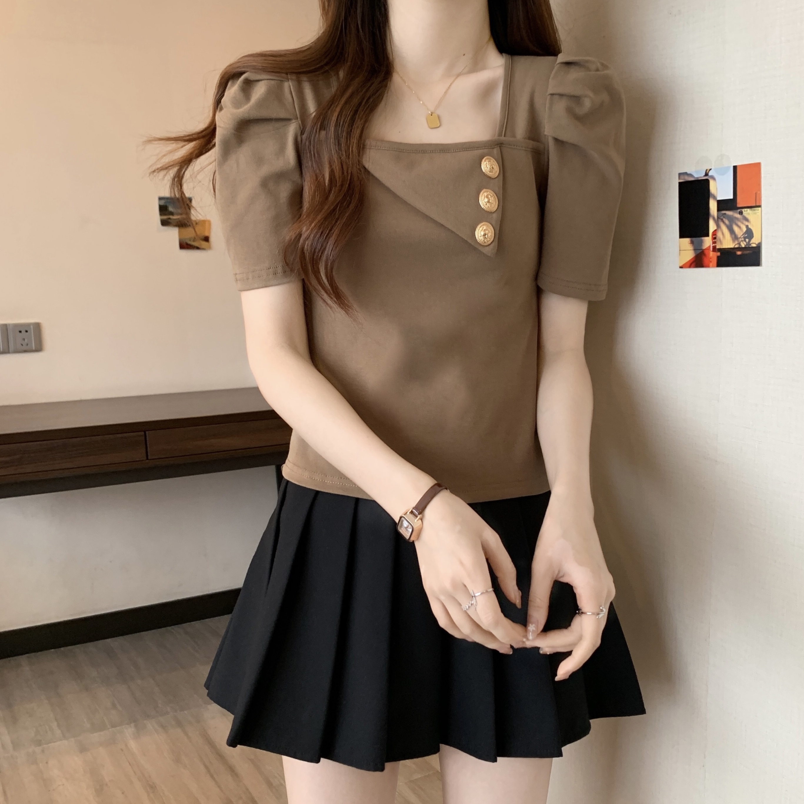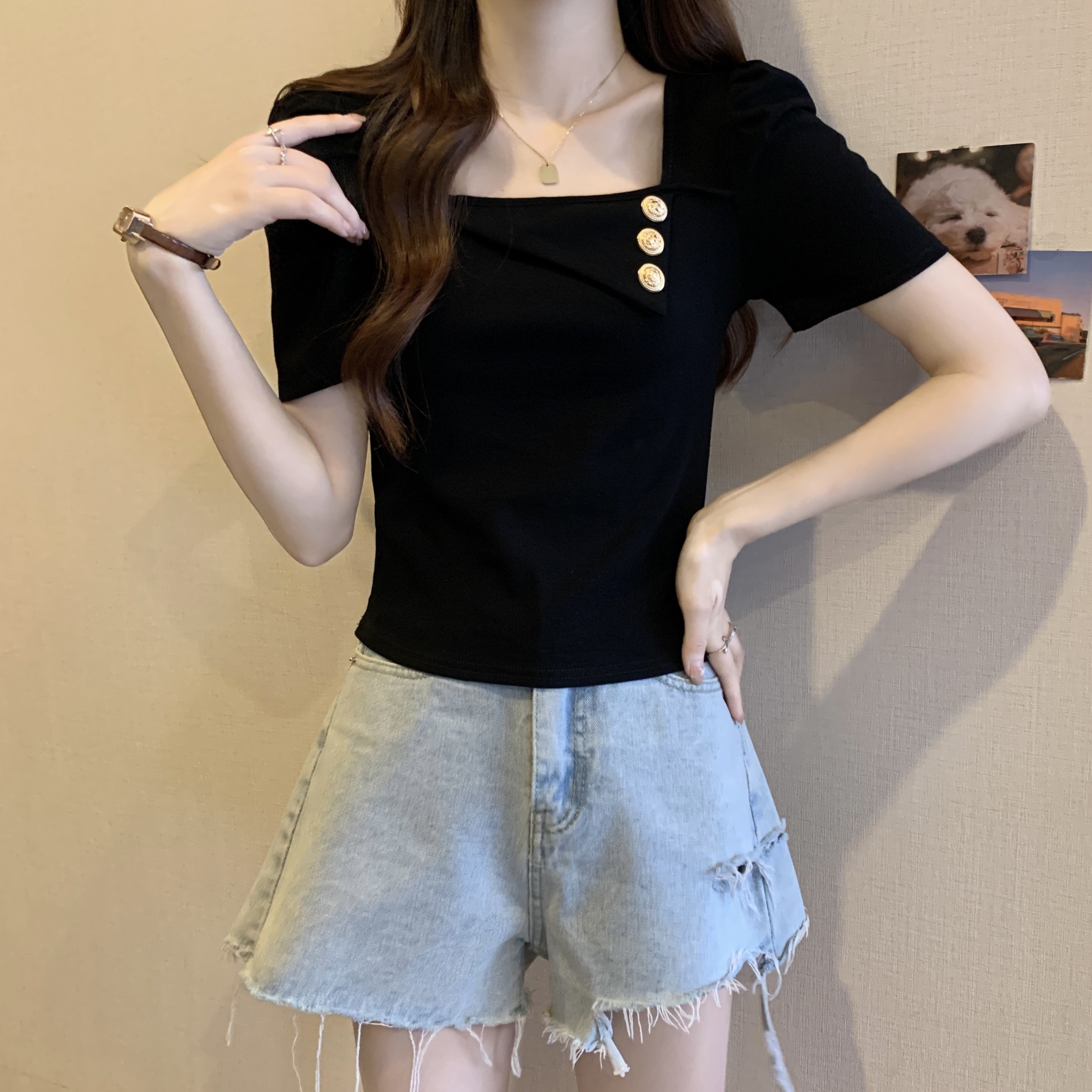 PF3052#胖MM 夏独特别致港味复古chic甜辣妹方领上衣设计感短袖t恤女