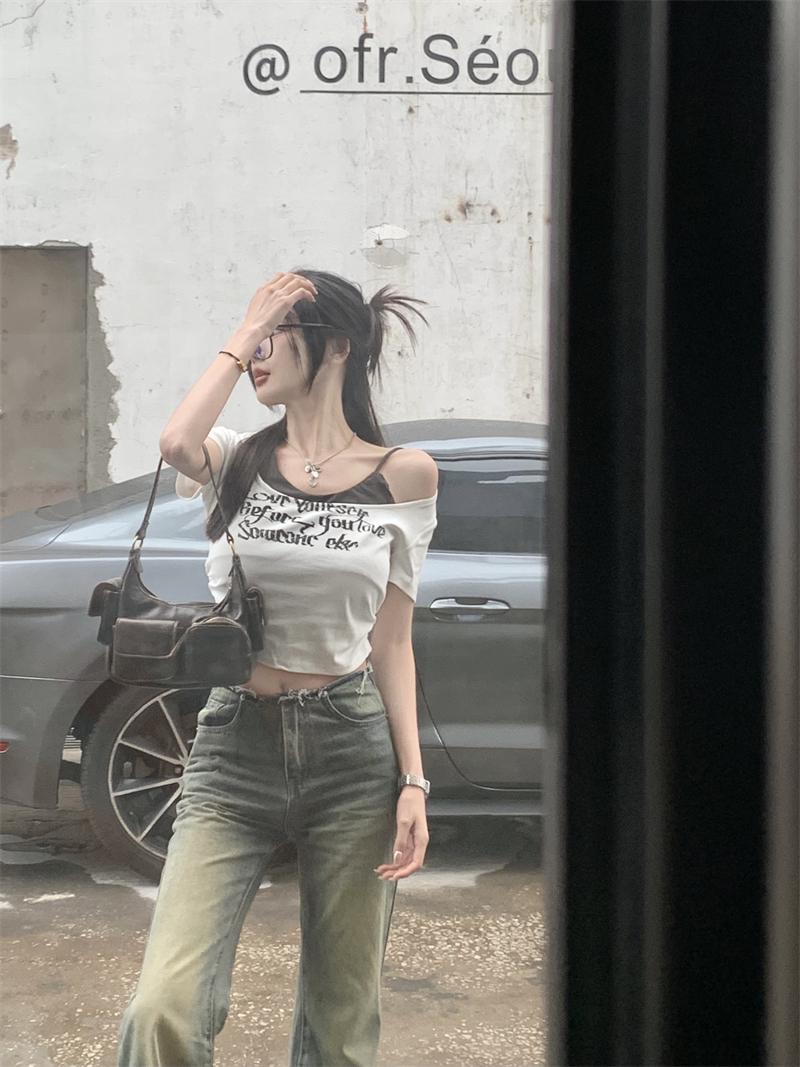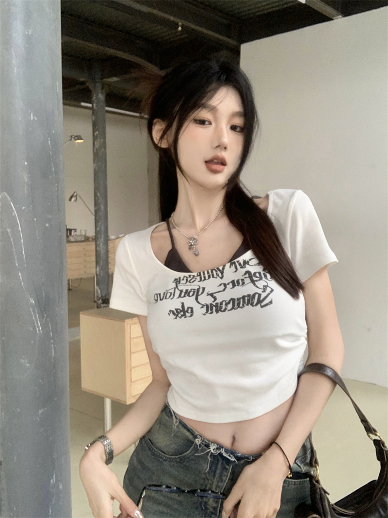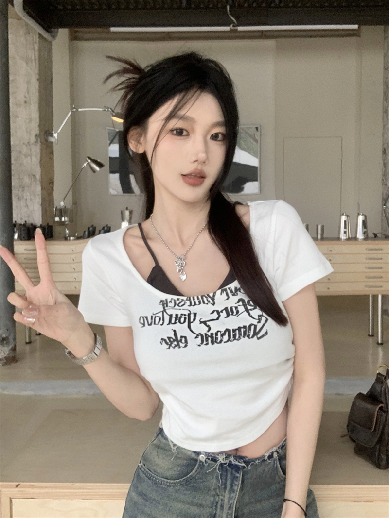 PF3057#美式辣妹字母印花假两件t恤女夏季纯欲修身显瘦短款甜辣上衣