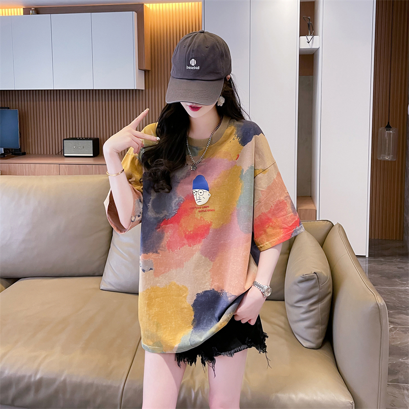 PF3068#精梳纯棉扎染印花T恤 2024百搭宽松上衣T恤女潮