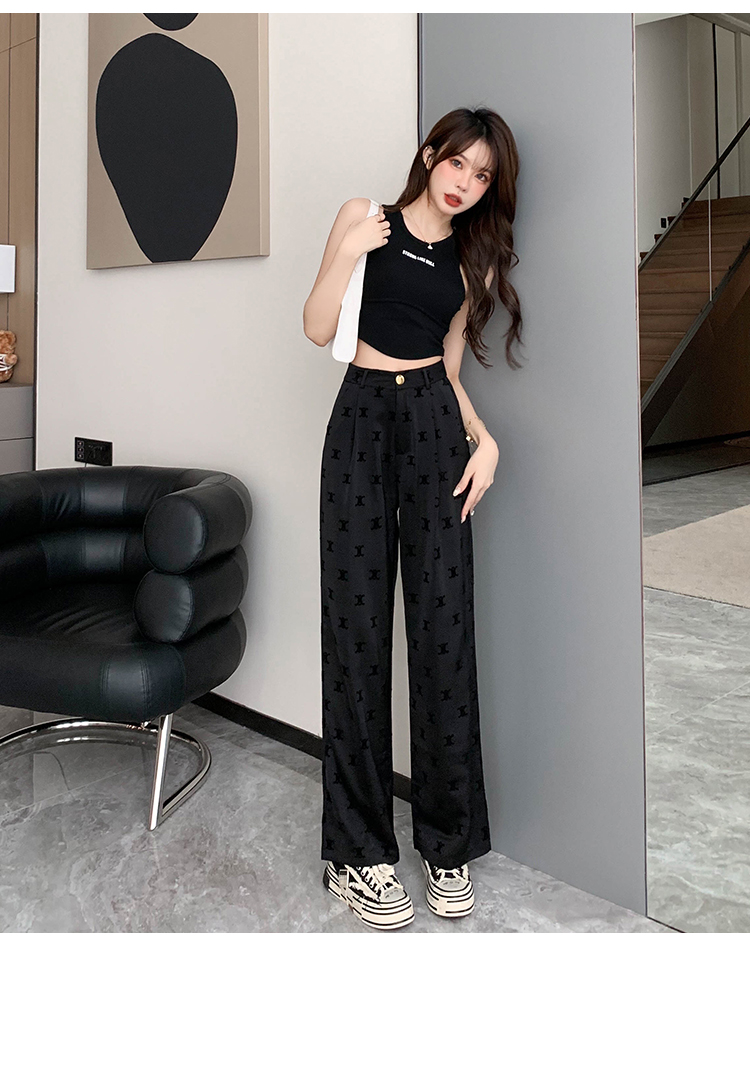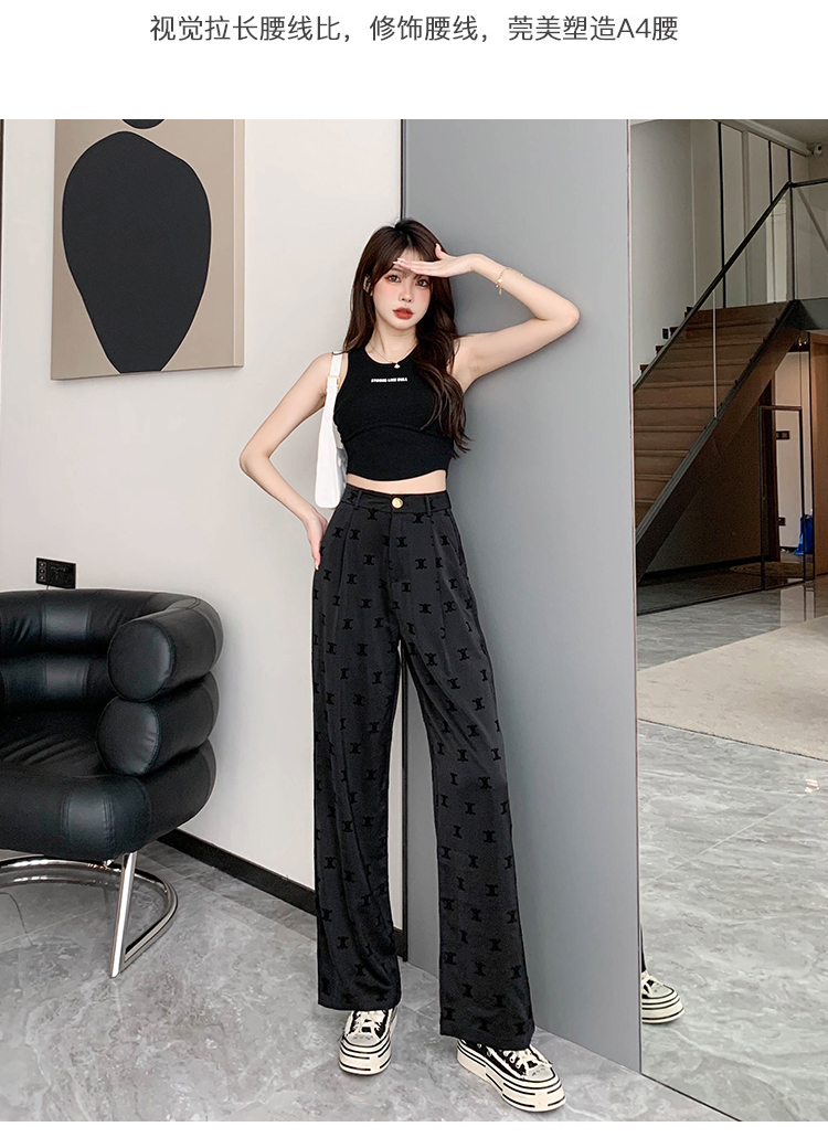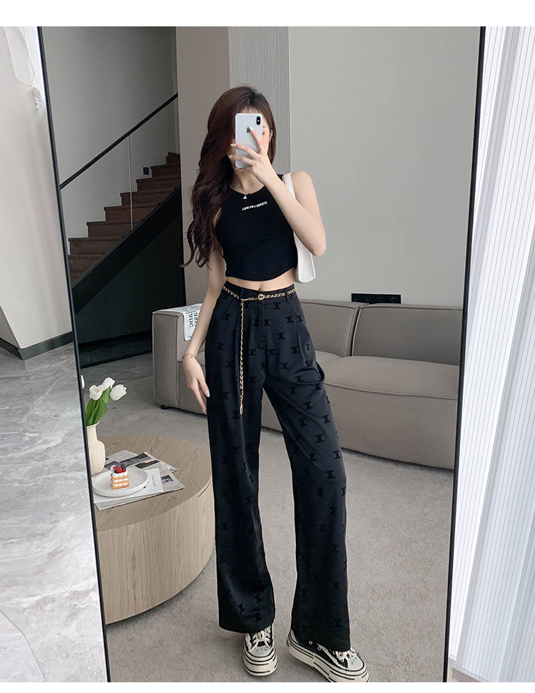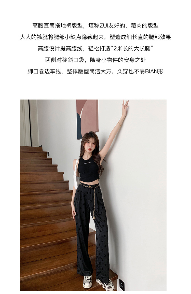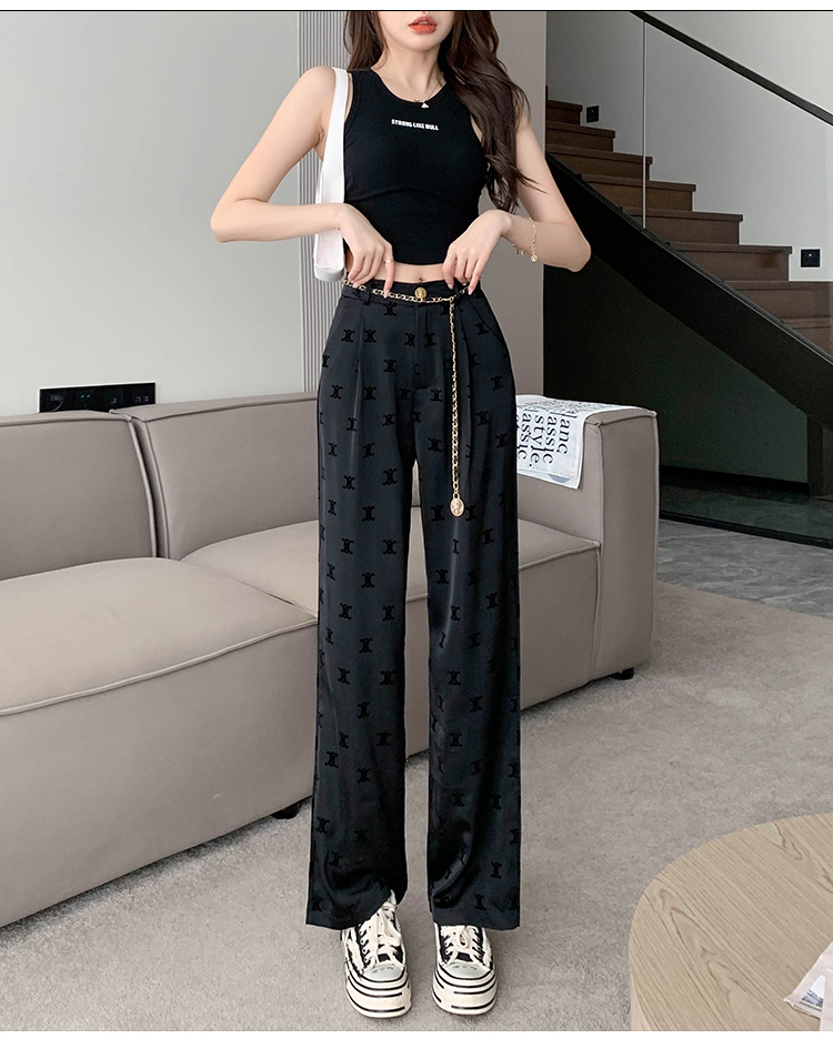 PF3073#新款植绒印花直筒垂感拖地裤高腰显瘦休闲冰丝阔腿长裤+链条