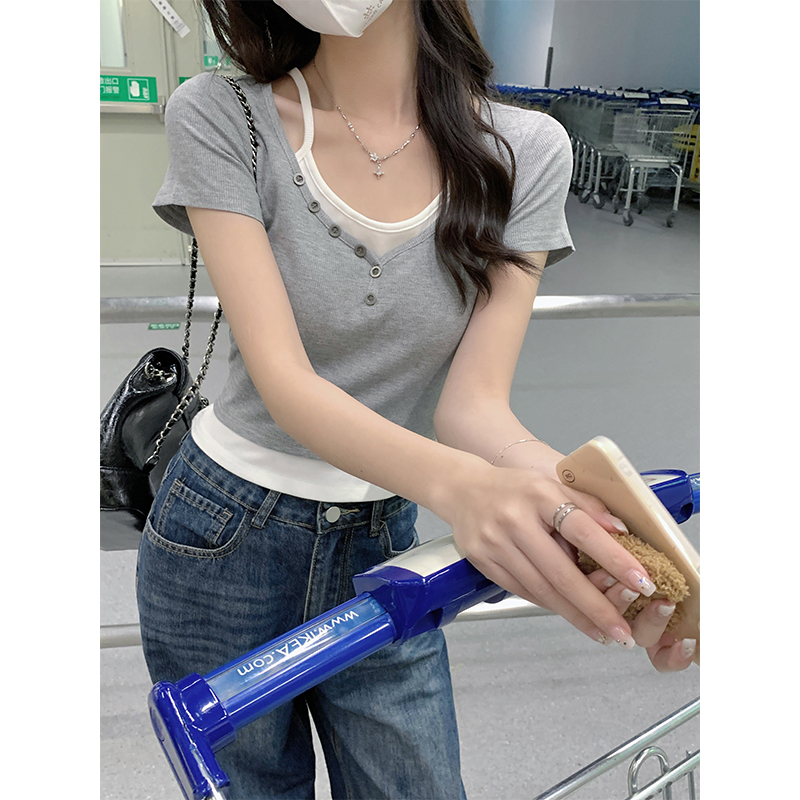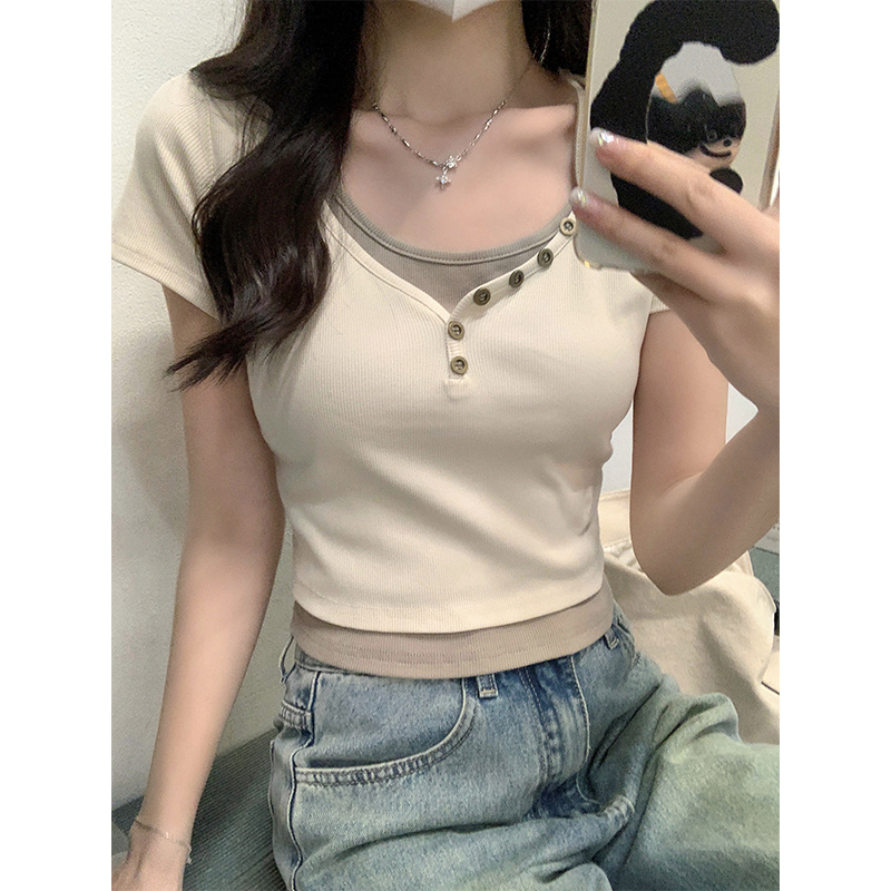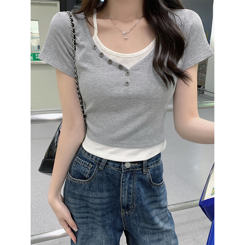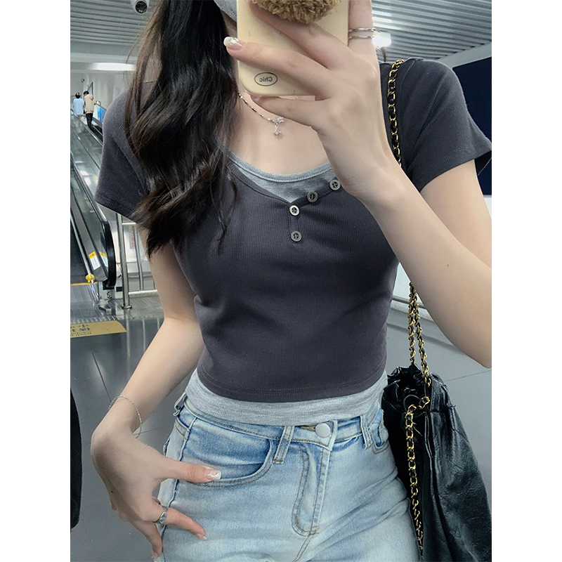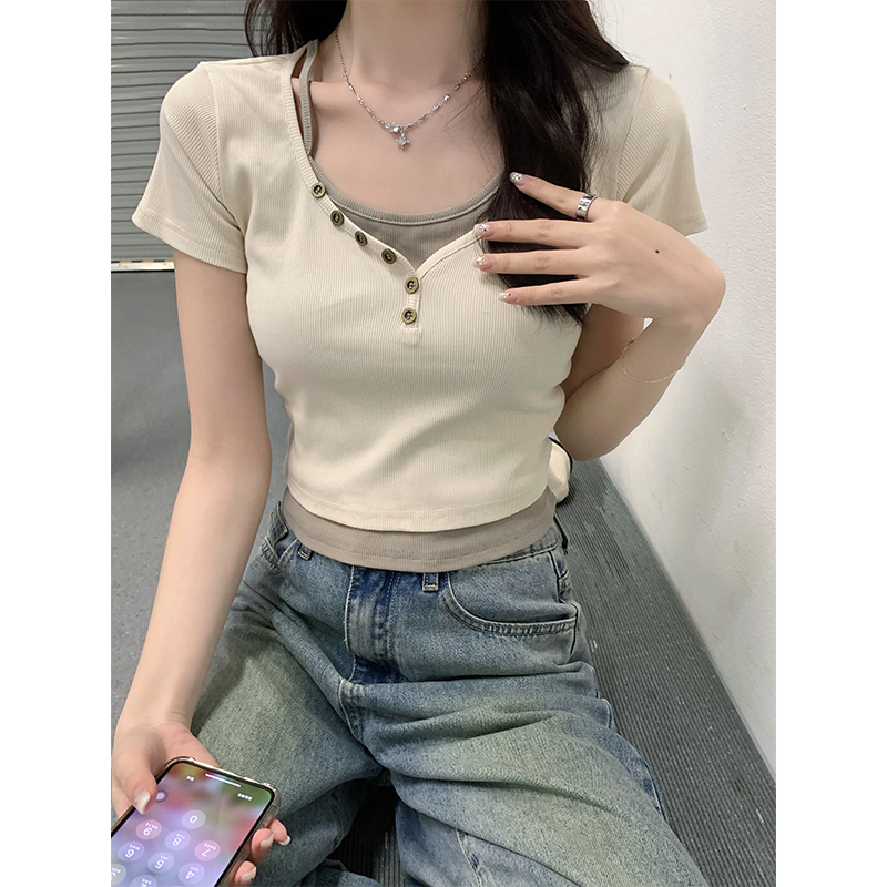 PF3155#纯欲辣妹假两件挂脖上衣女夏季新款修身显瘦撞色短袖T恤