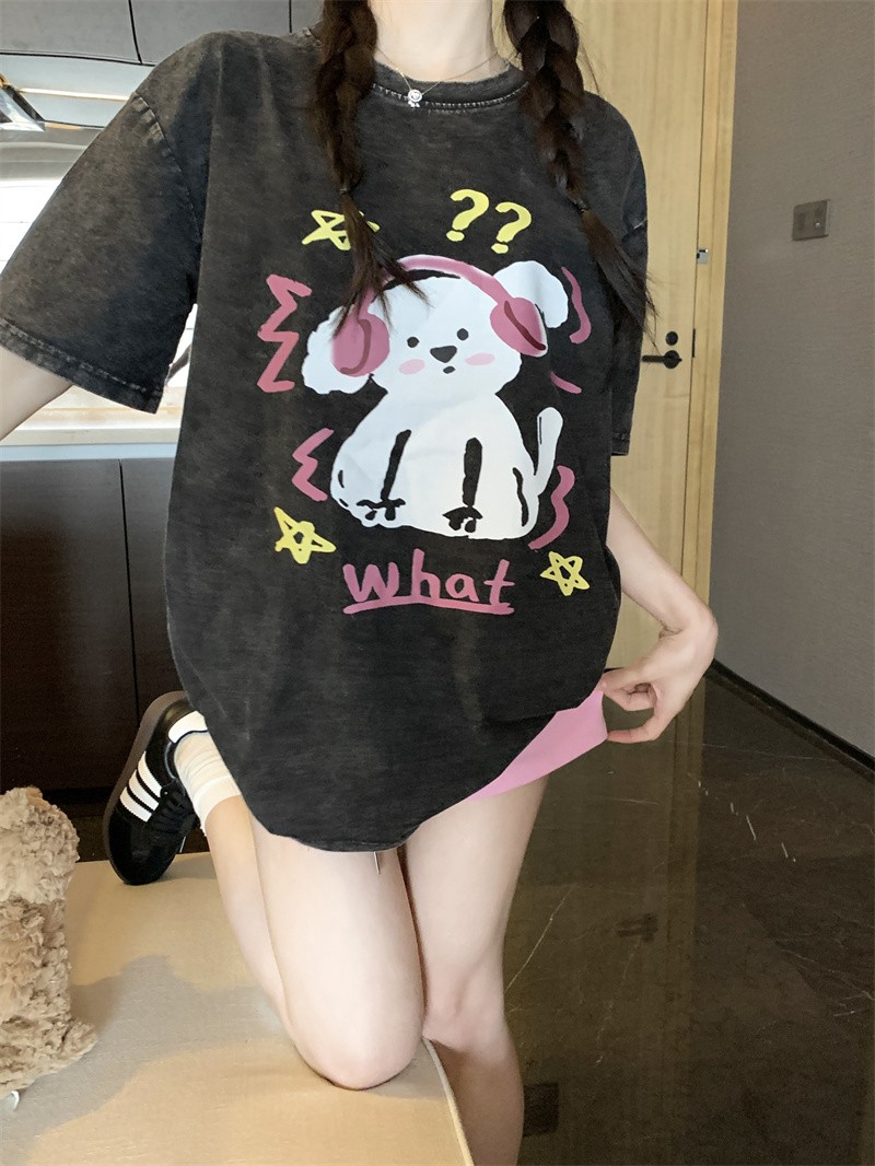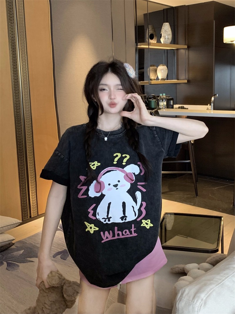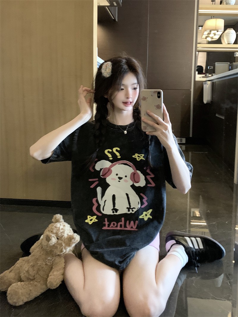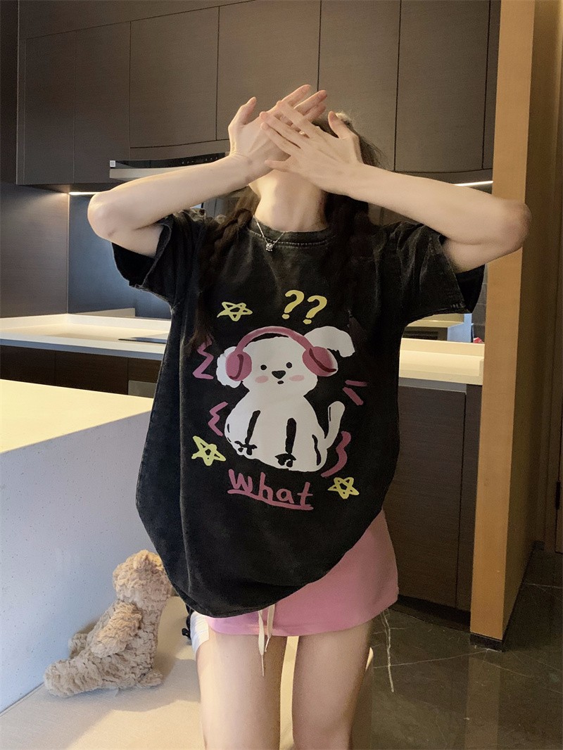 PF3166#后包领纯棉200克听音乐的狗狗短袖男女黑色T恤可爱纯棉体恤