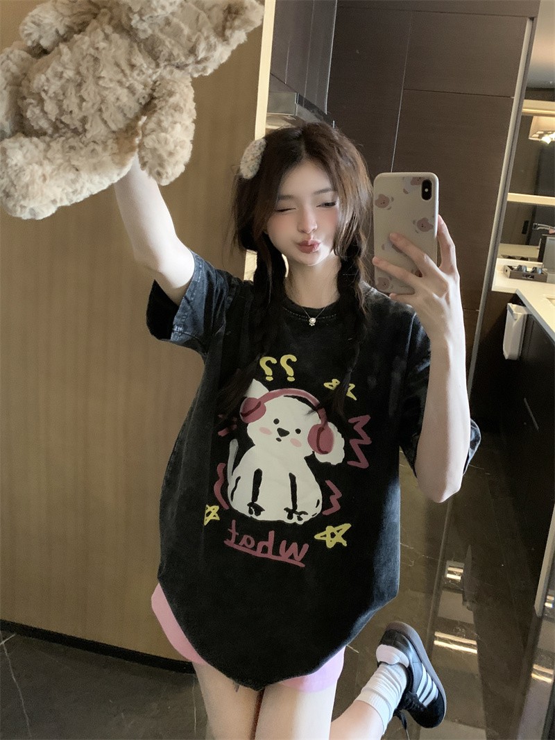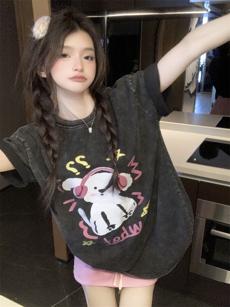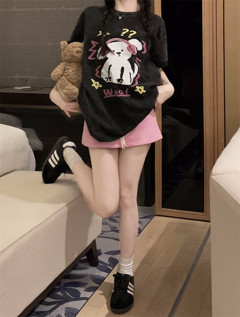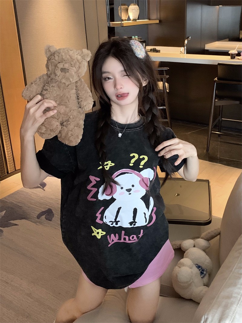PF3166#后包领纯棉200克听音乐的狗狗短袖男女黑色T恤可爱纯棉体恤