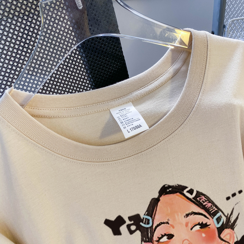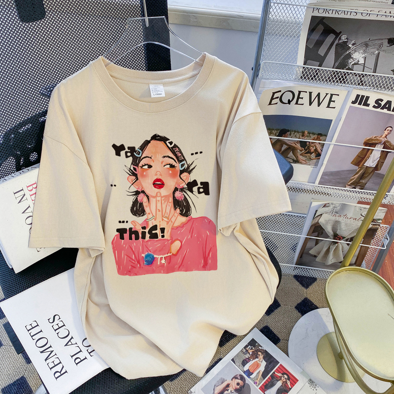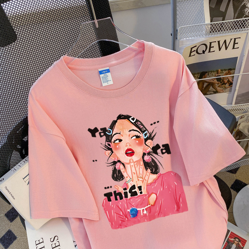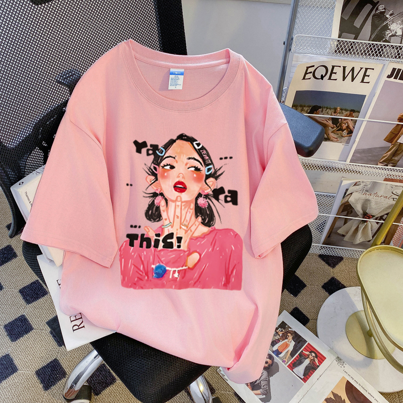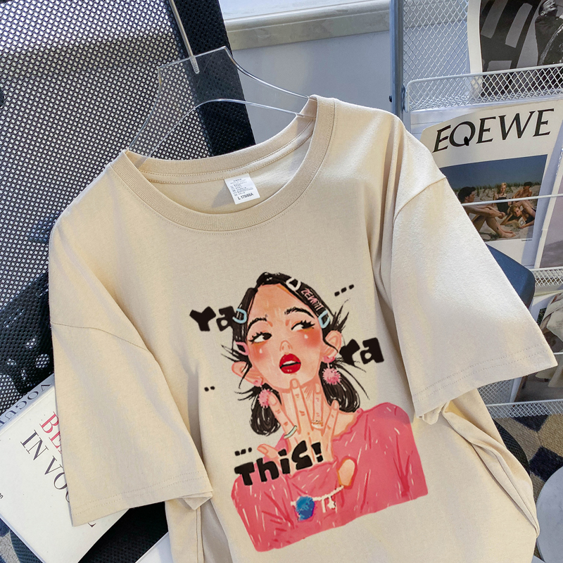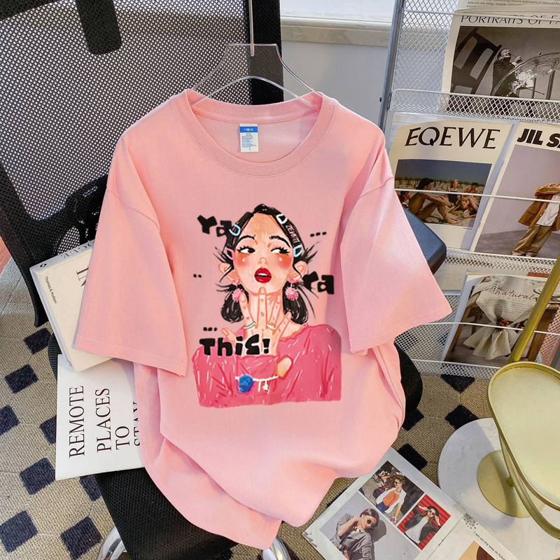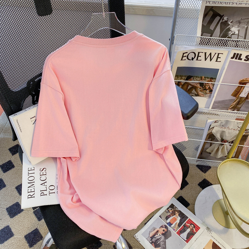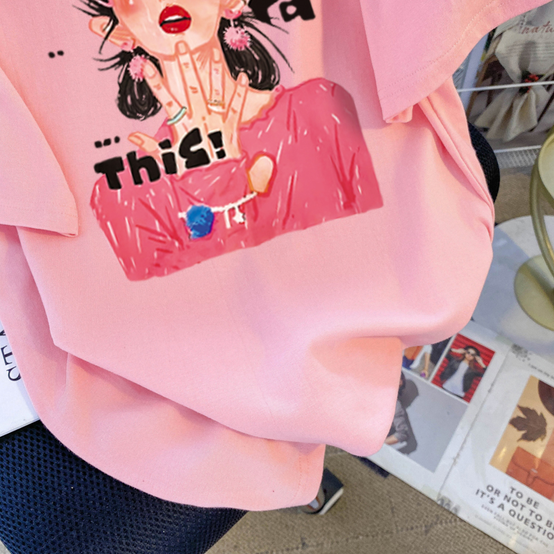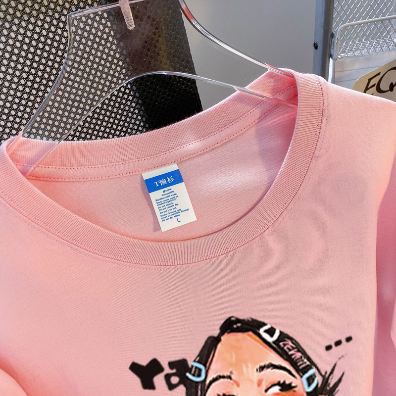 PF3169#纯棉大码韩版宽松休闲印花T恤夏新款百搭落肩短袖女