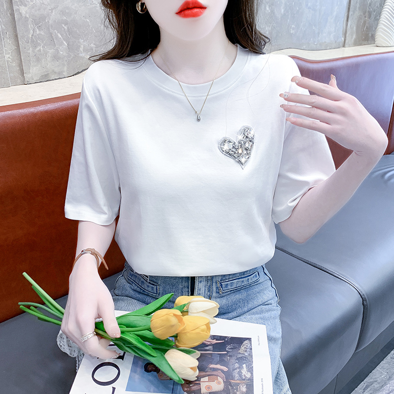 PF3181#正肩短袖t恤女夏2024新款时尚圆领爱心水钻装饰休闲百搭上衣