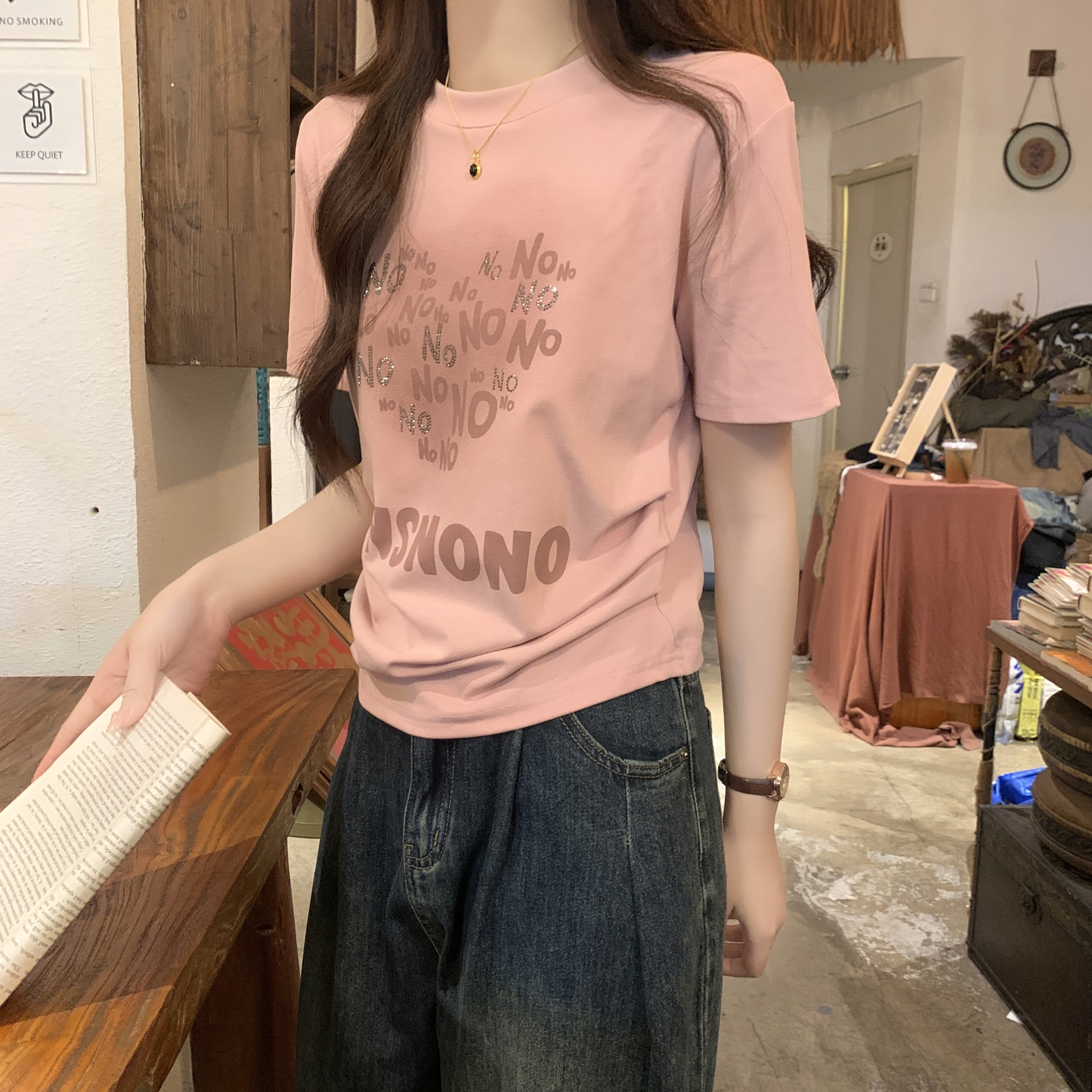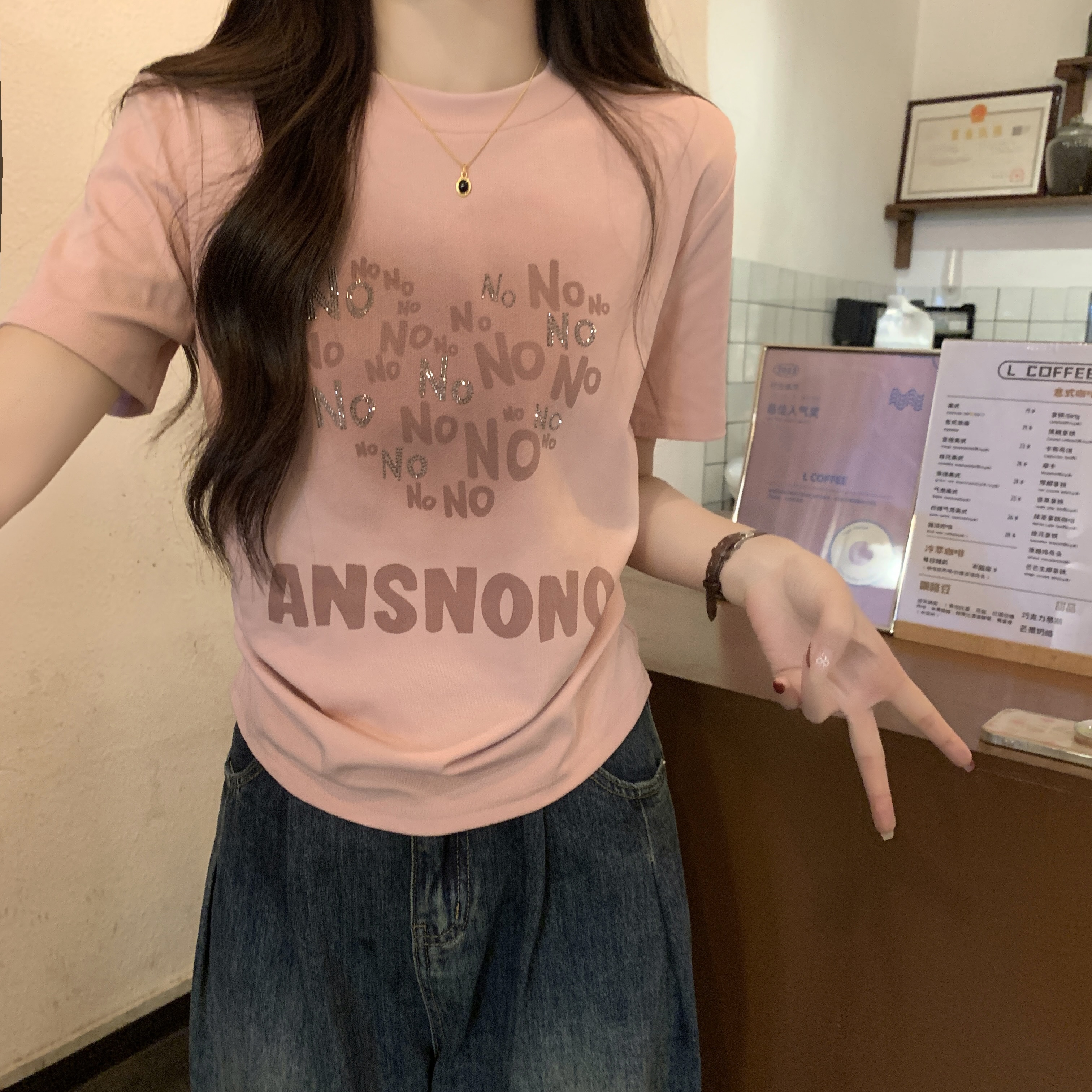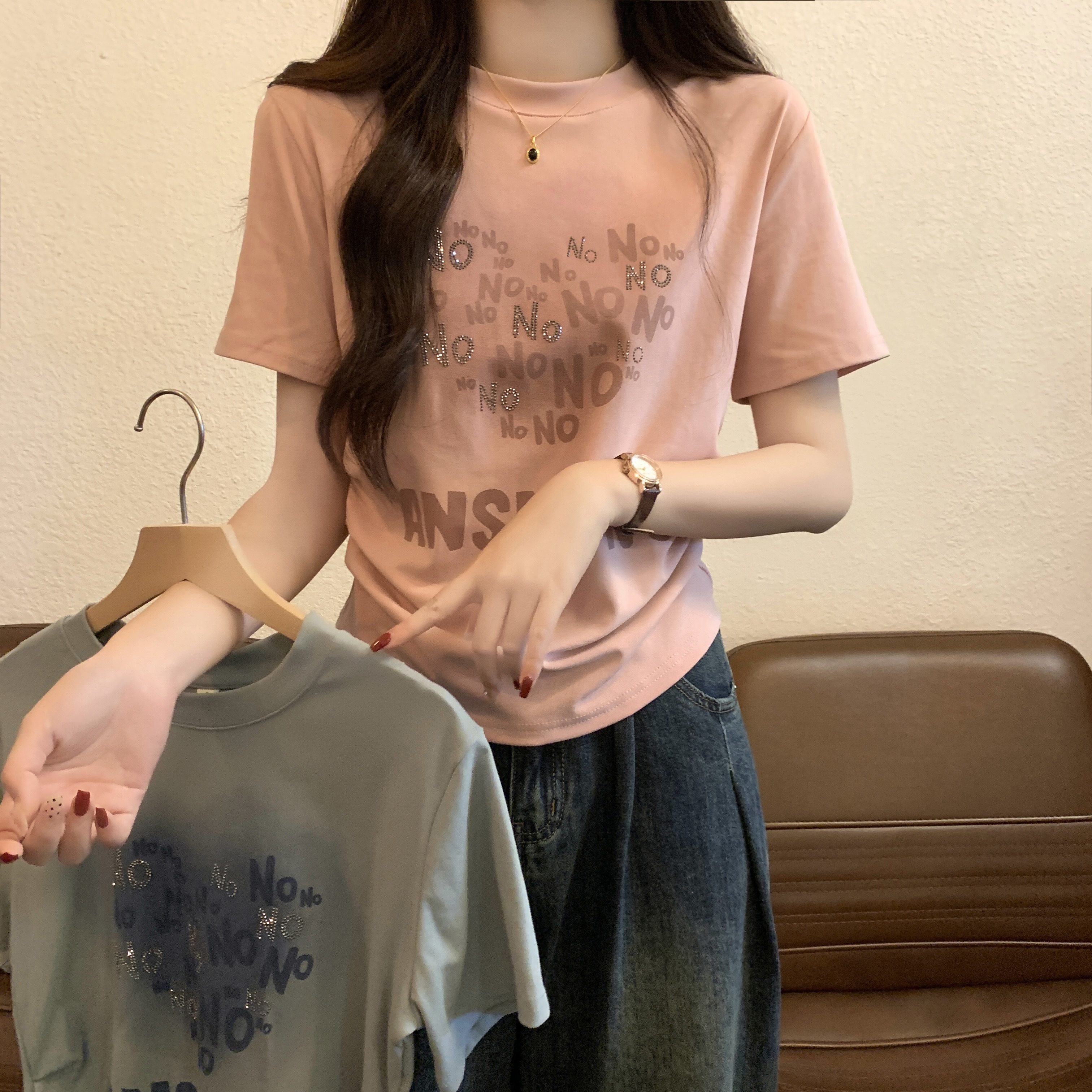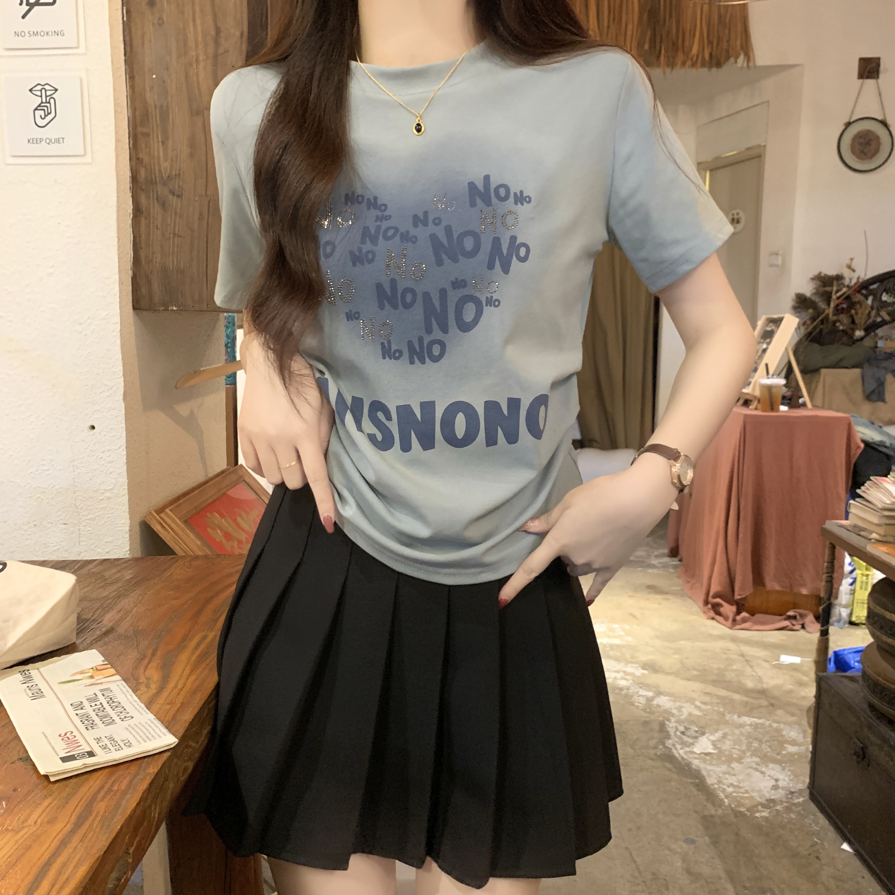 PF3233#大码~渐变褶皱收腰烫钻字母2024夏季新款T恤女休闲风显瘦版型