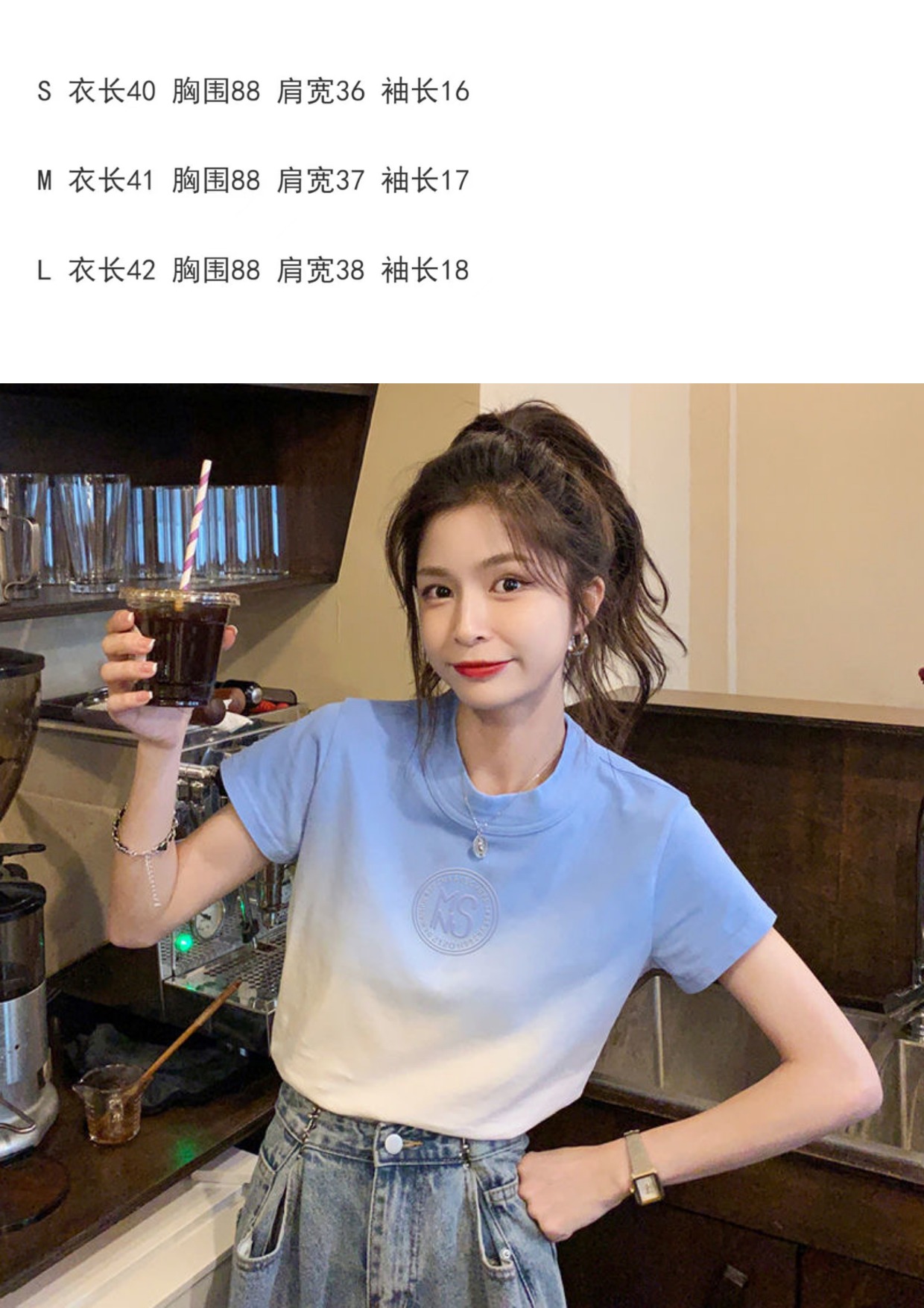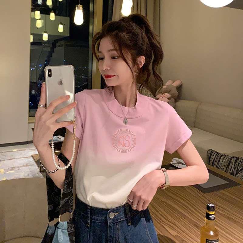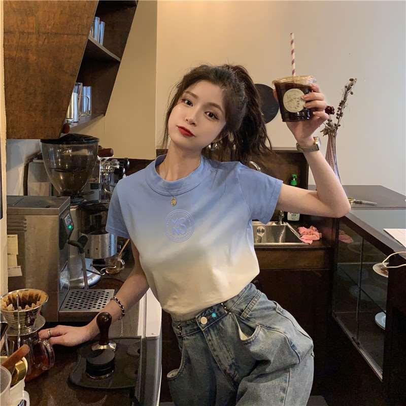 PF3305#女装新款夏季短袖T恤渐变色设计感辣妹风短袖蓝色盐系上衣