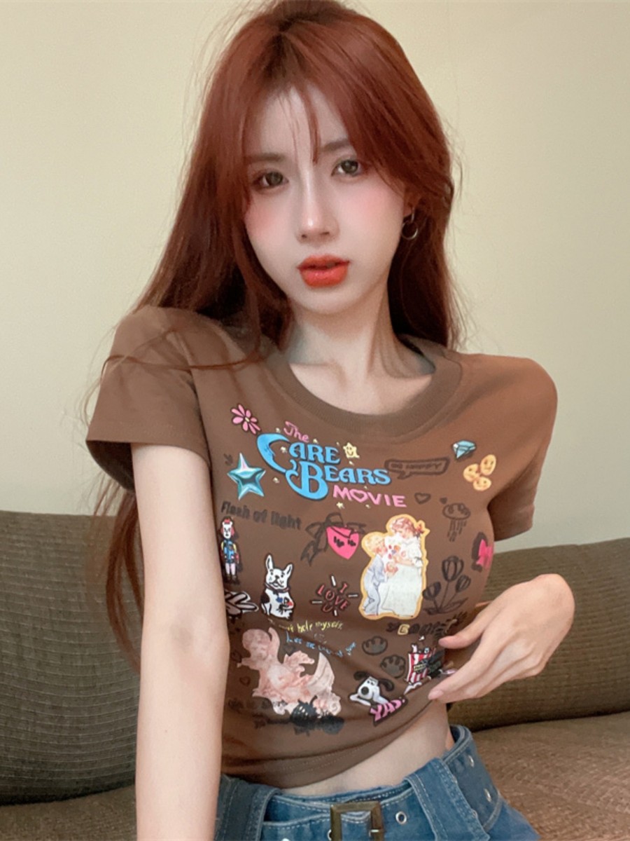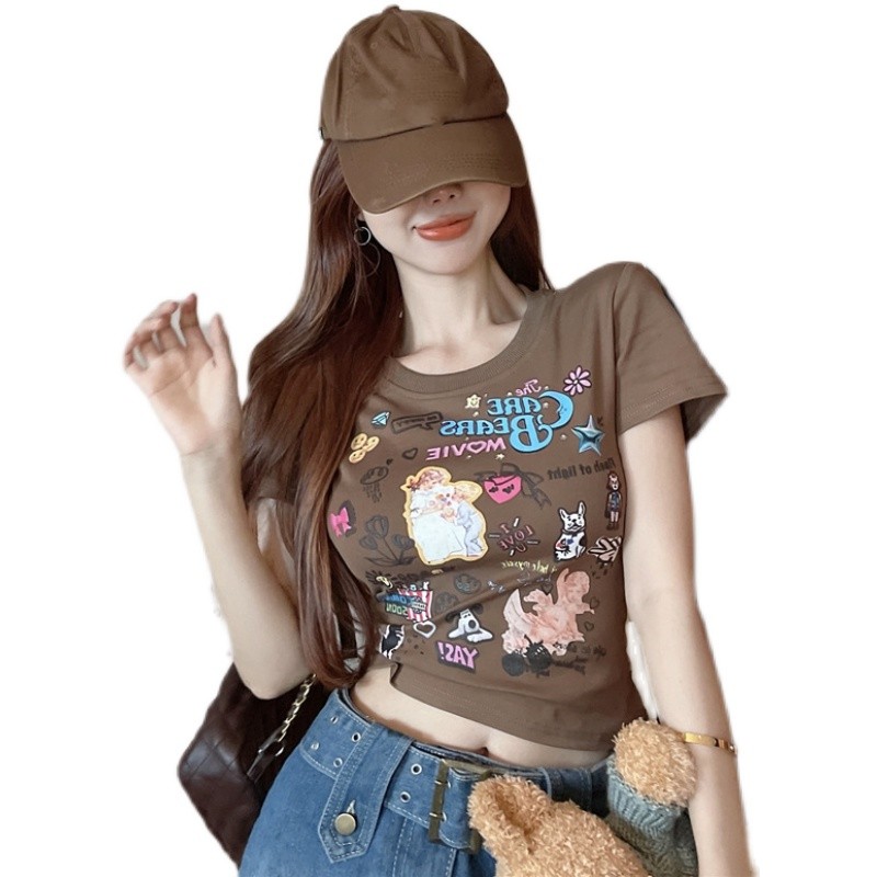 PF3321#纯棉螺纹包肩包领t恤印花打底衫露肚脐辣妹高腰短款上衣