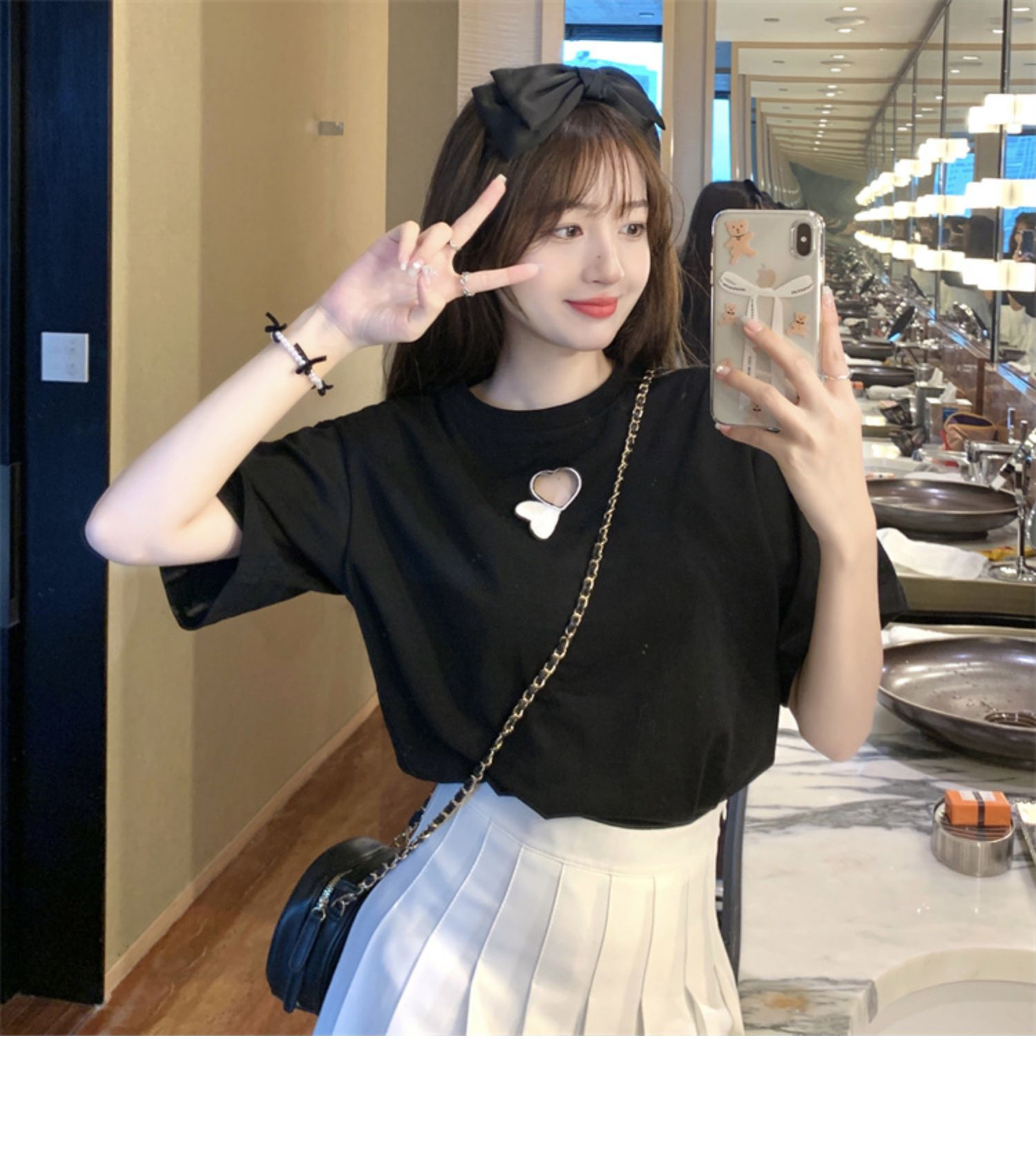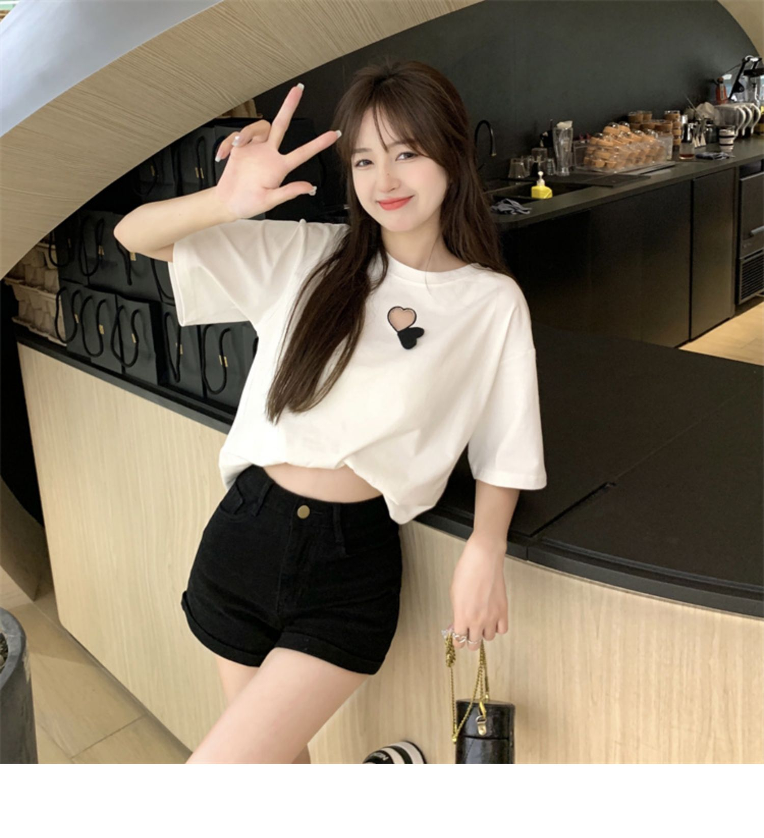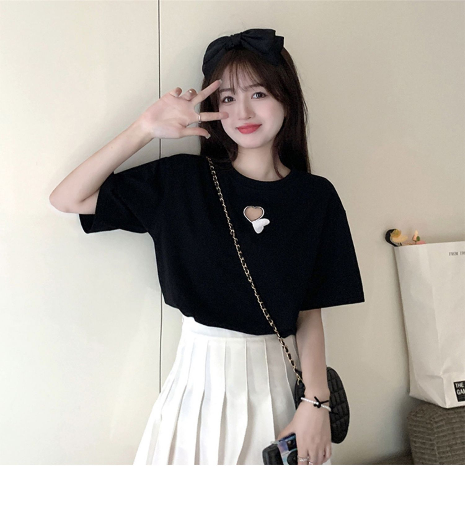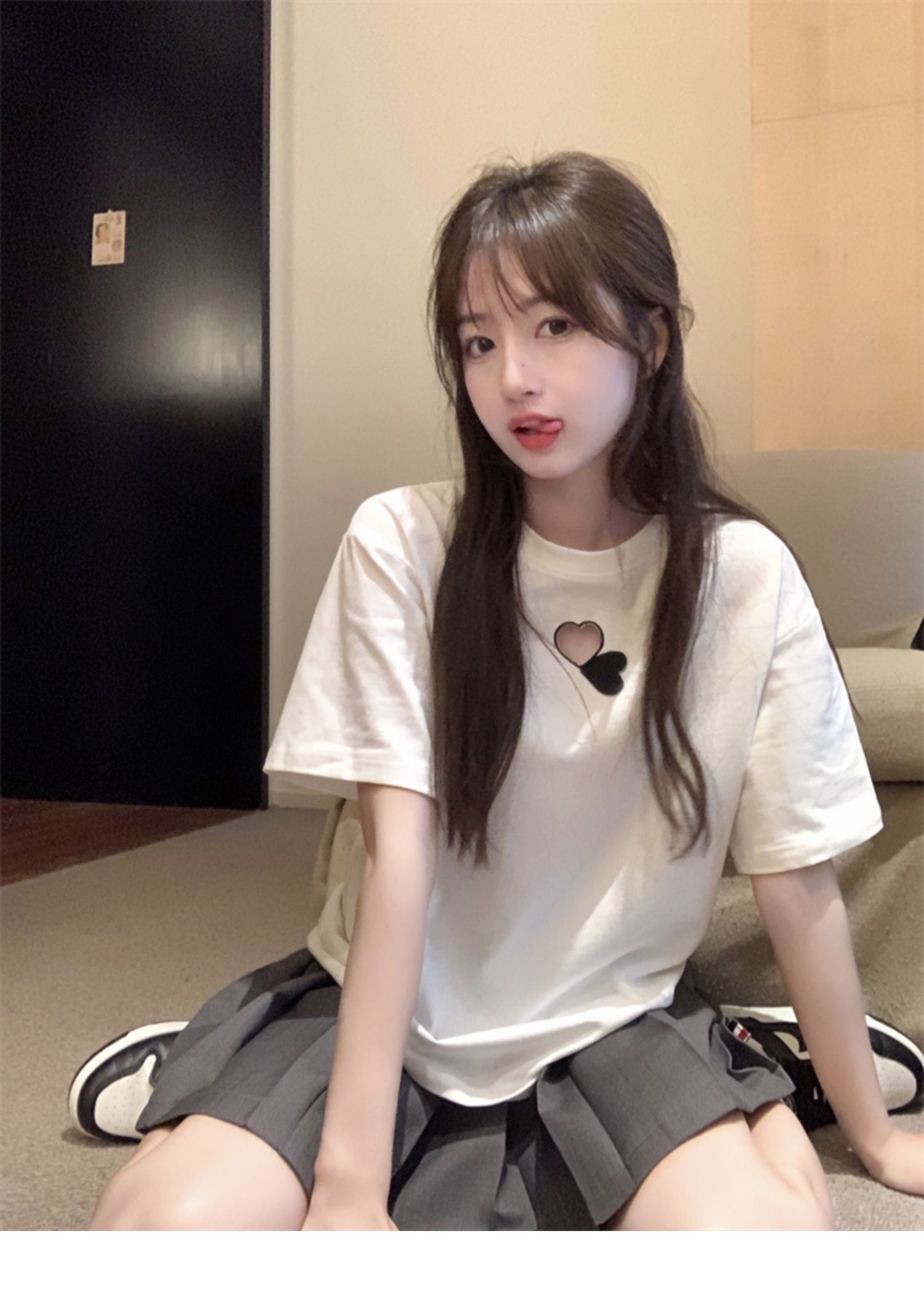 PF3347# 纯棉镂空爱心短袖T恤女宽松独特别致上衣