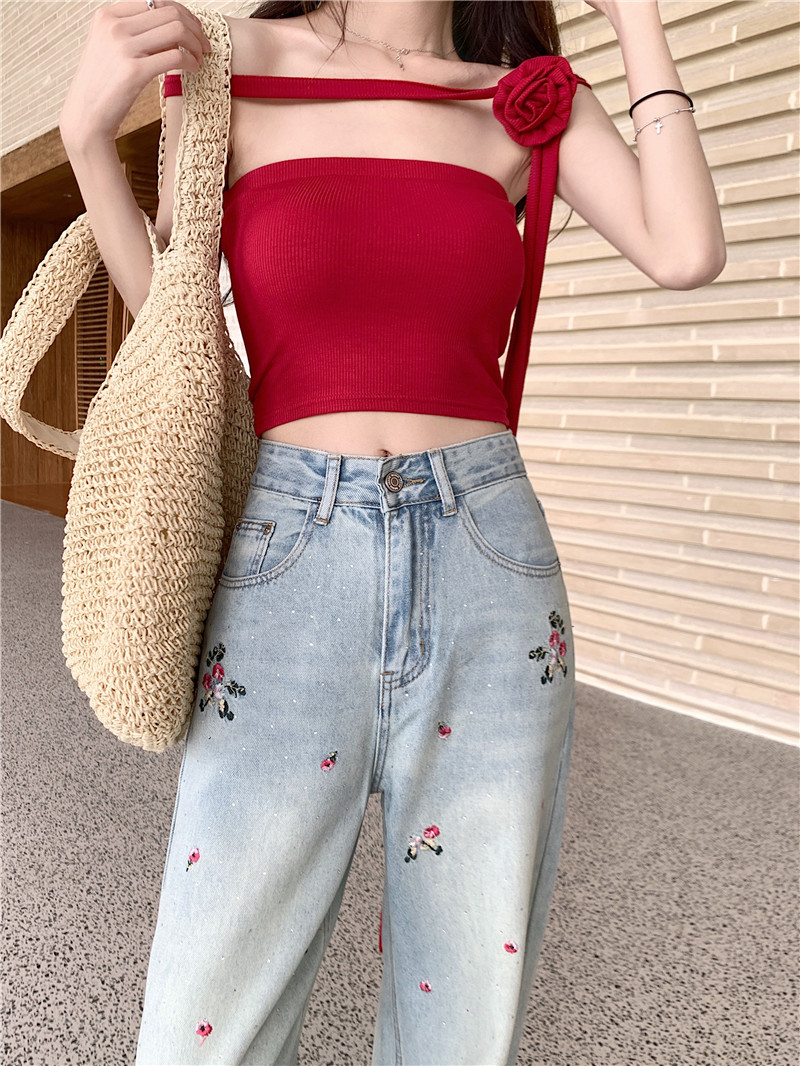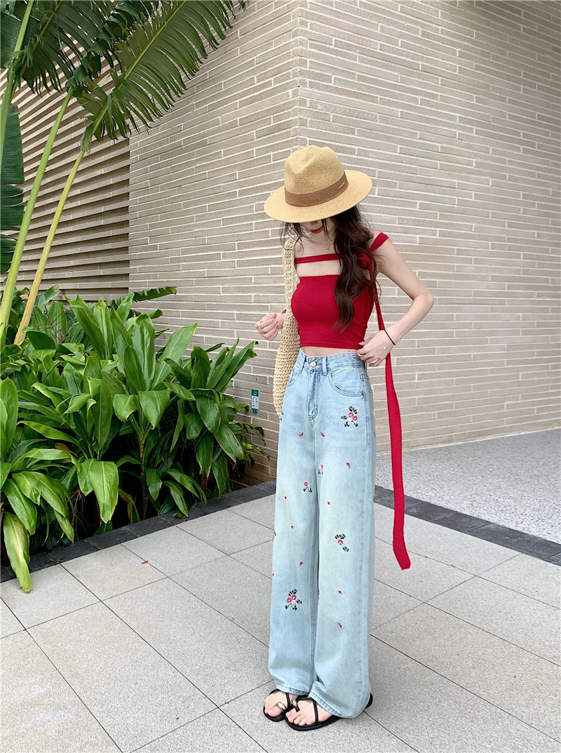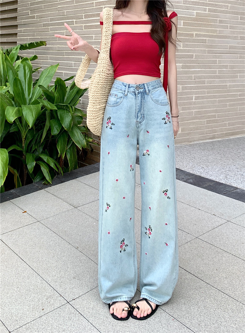 PF3379#国风花朵刺绣直筒牛仔裤女春季设计感高腰显瘦阔腿裤子