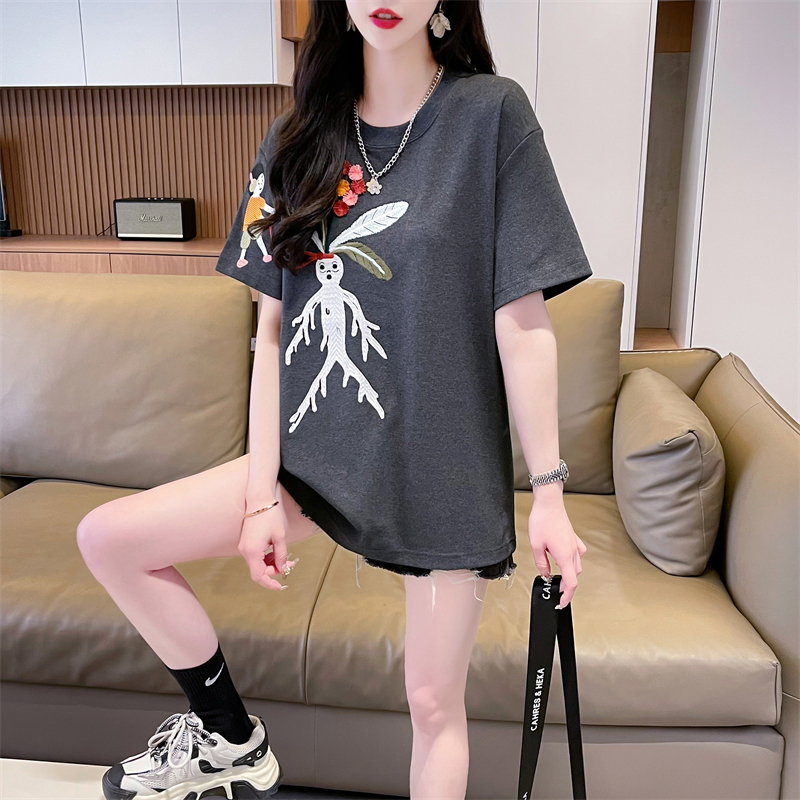 PF3406#新款韩版宽松莫代尔圆领卡通刺绣大码短袖T恤女