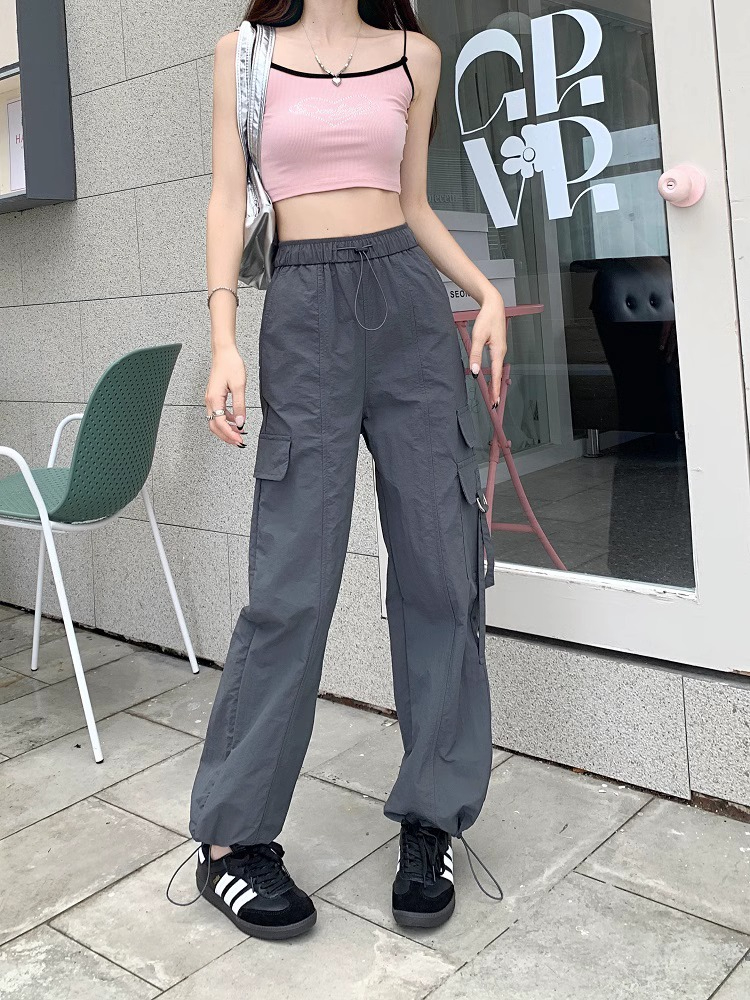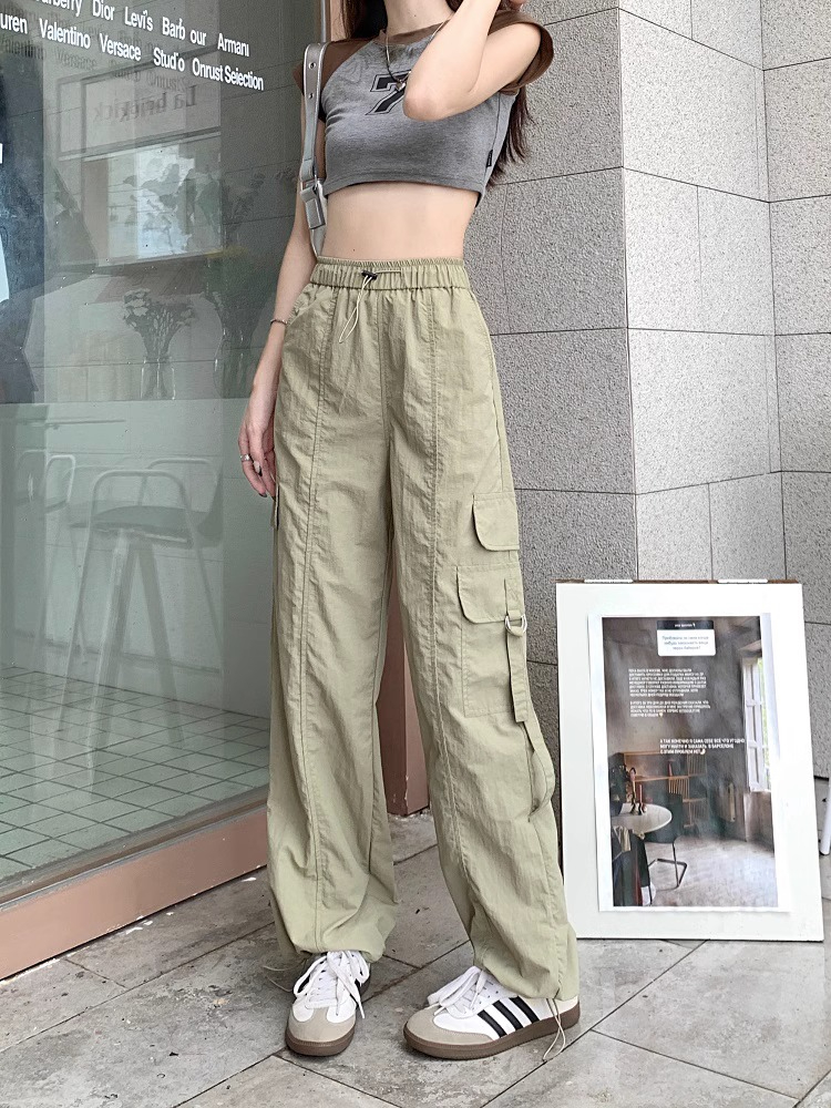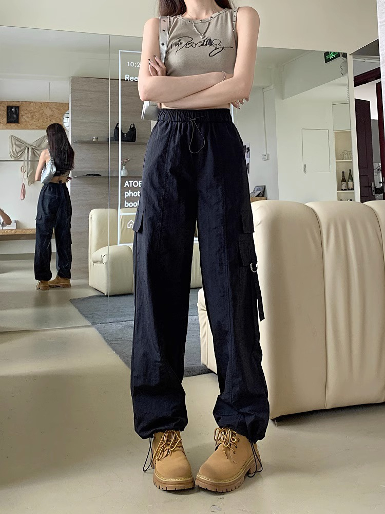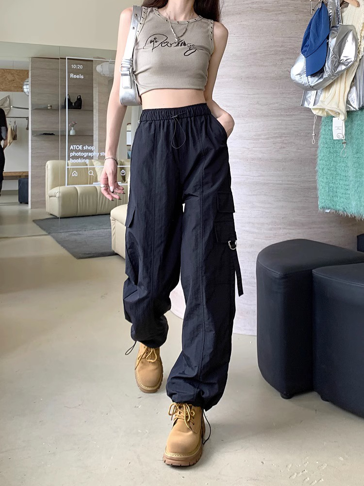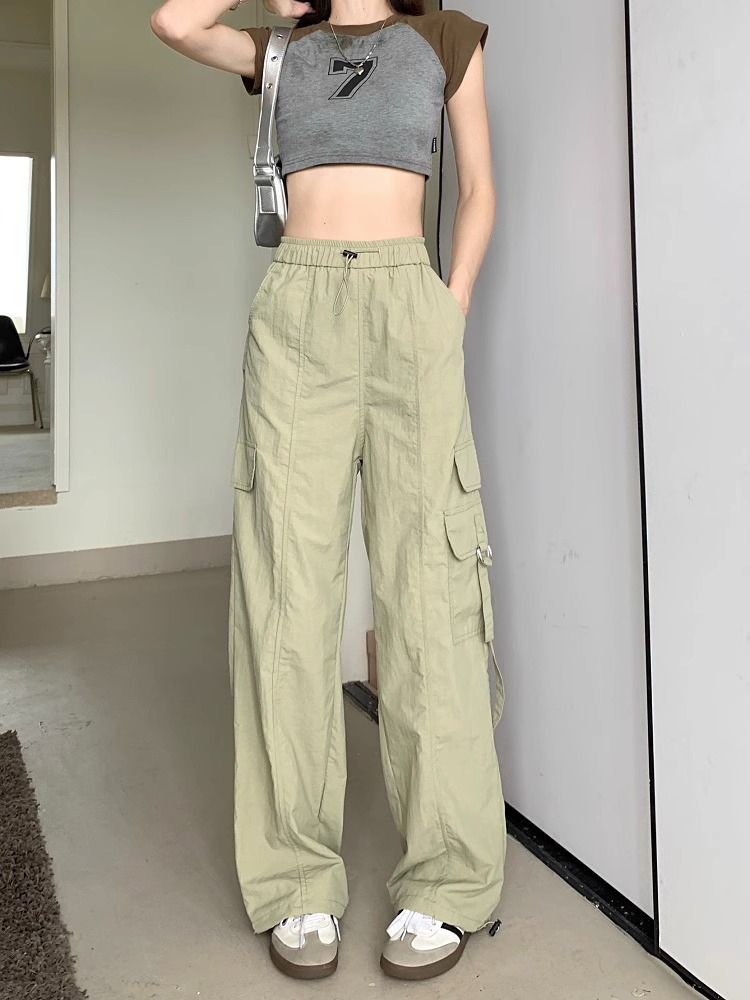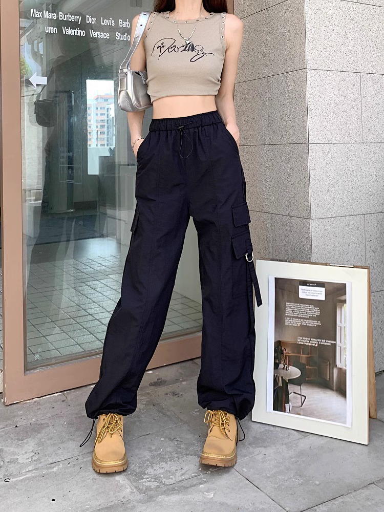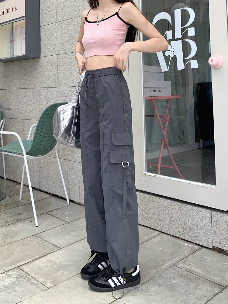 PF3424#工装裤子夏季 新款高腰宽松抽绳阔腿休闲裤子女直筒长裤