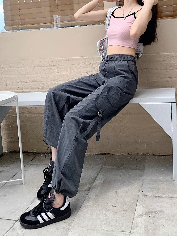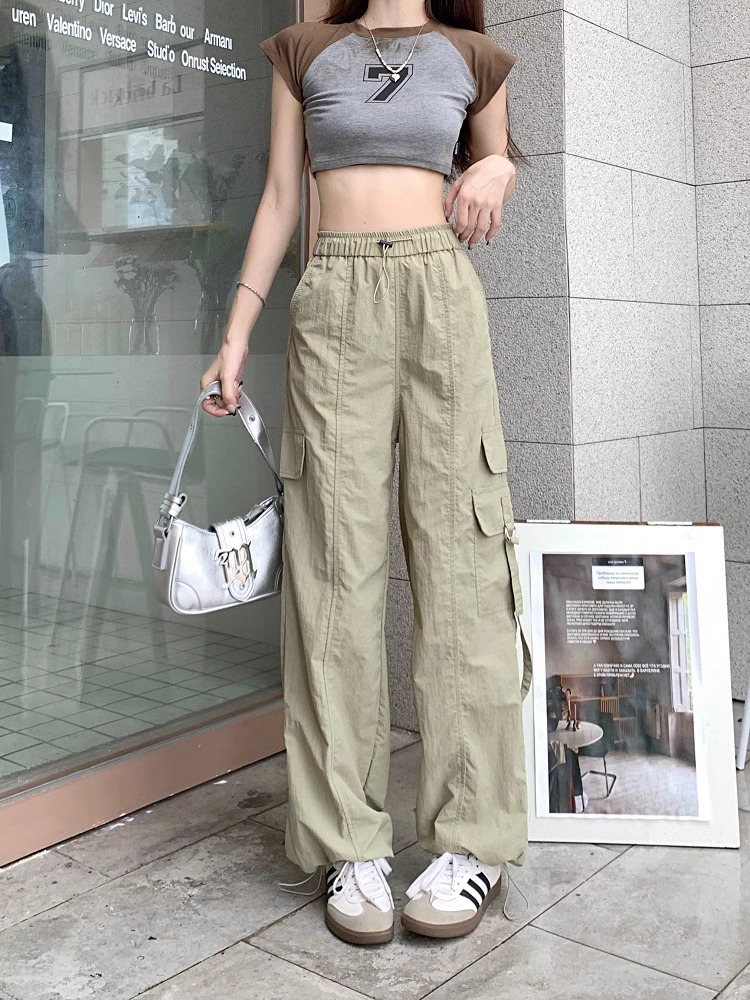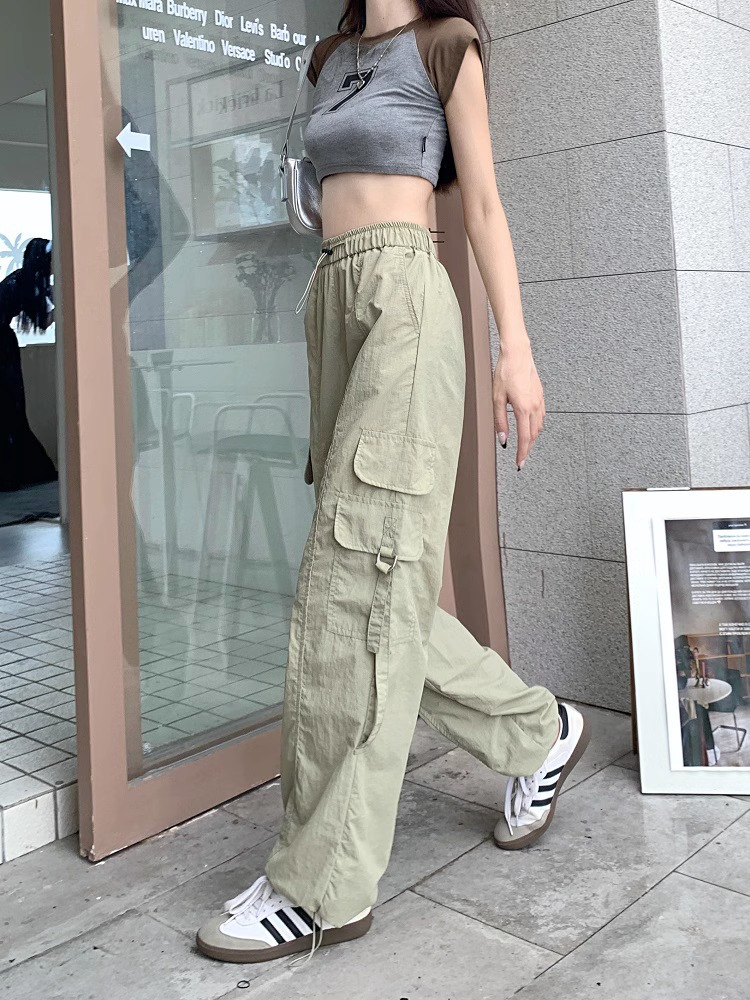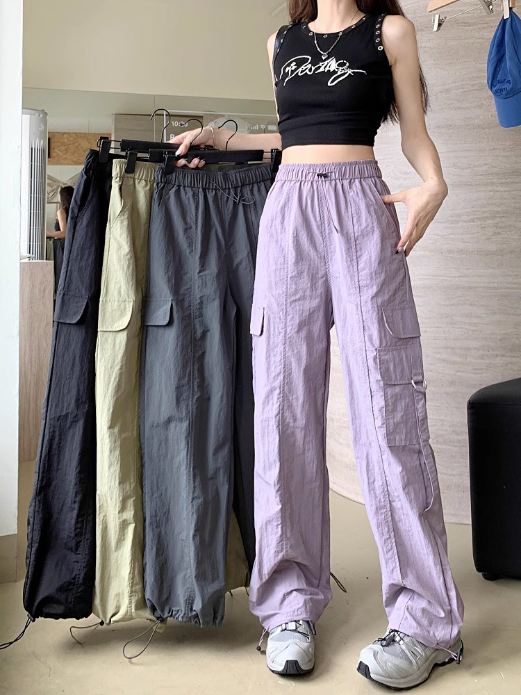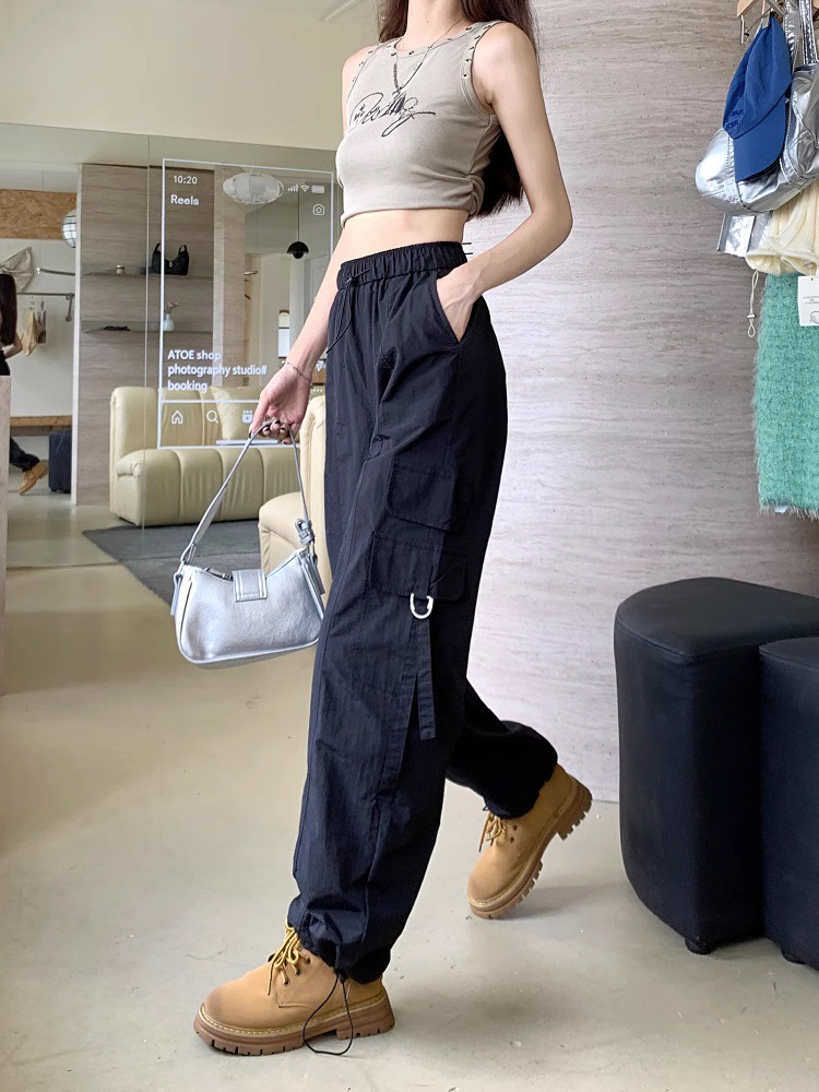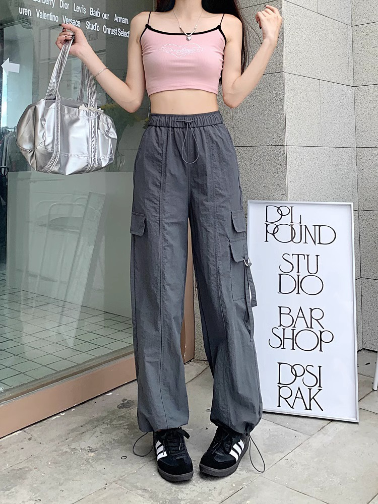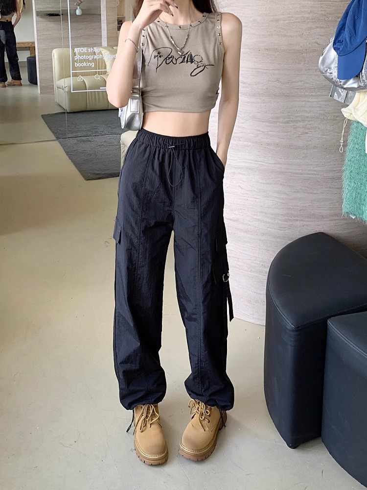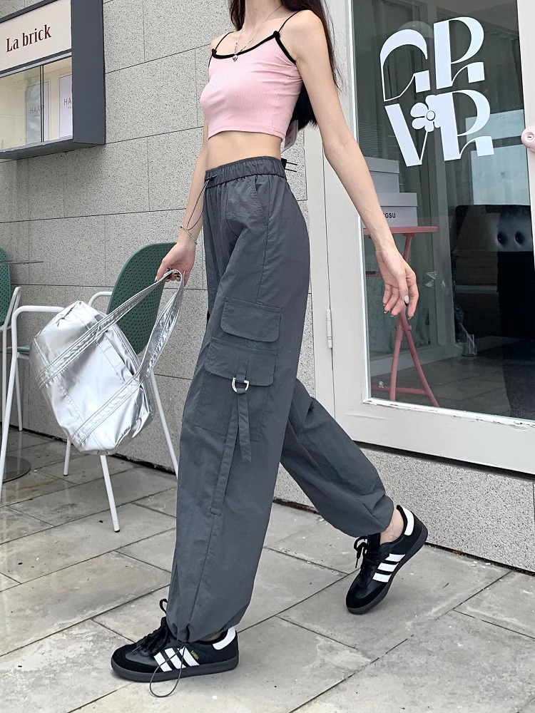 PF3424#工装裤子夏季 新款高腰宽松抽绳阔腿休闲裤子女直筒长裤